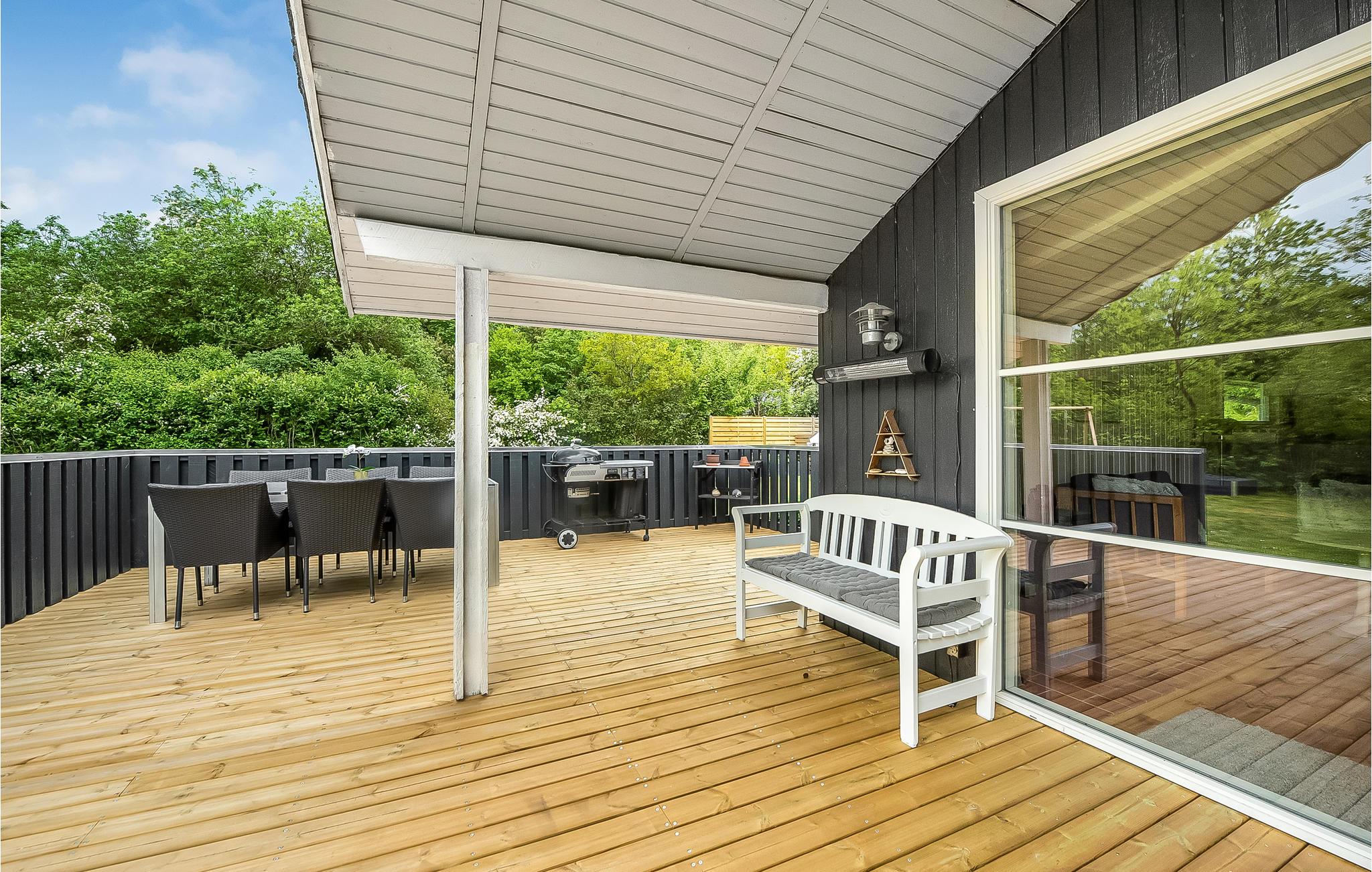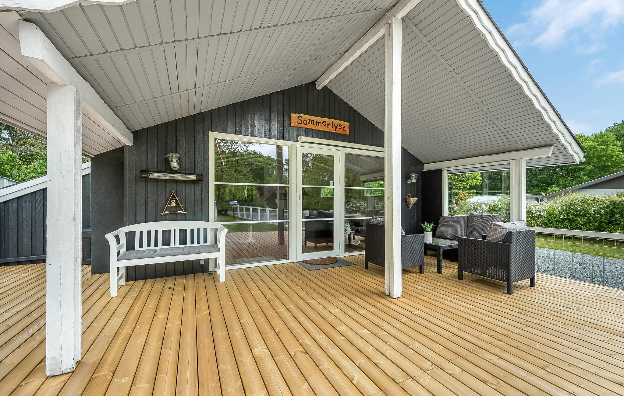 Hyggeligt sommerhus i Arrild Ferieby med brændeovn, overdækket terrasse og nær golfbane og natur.