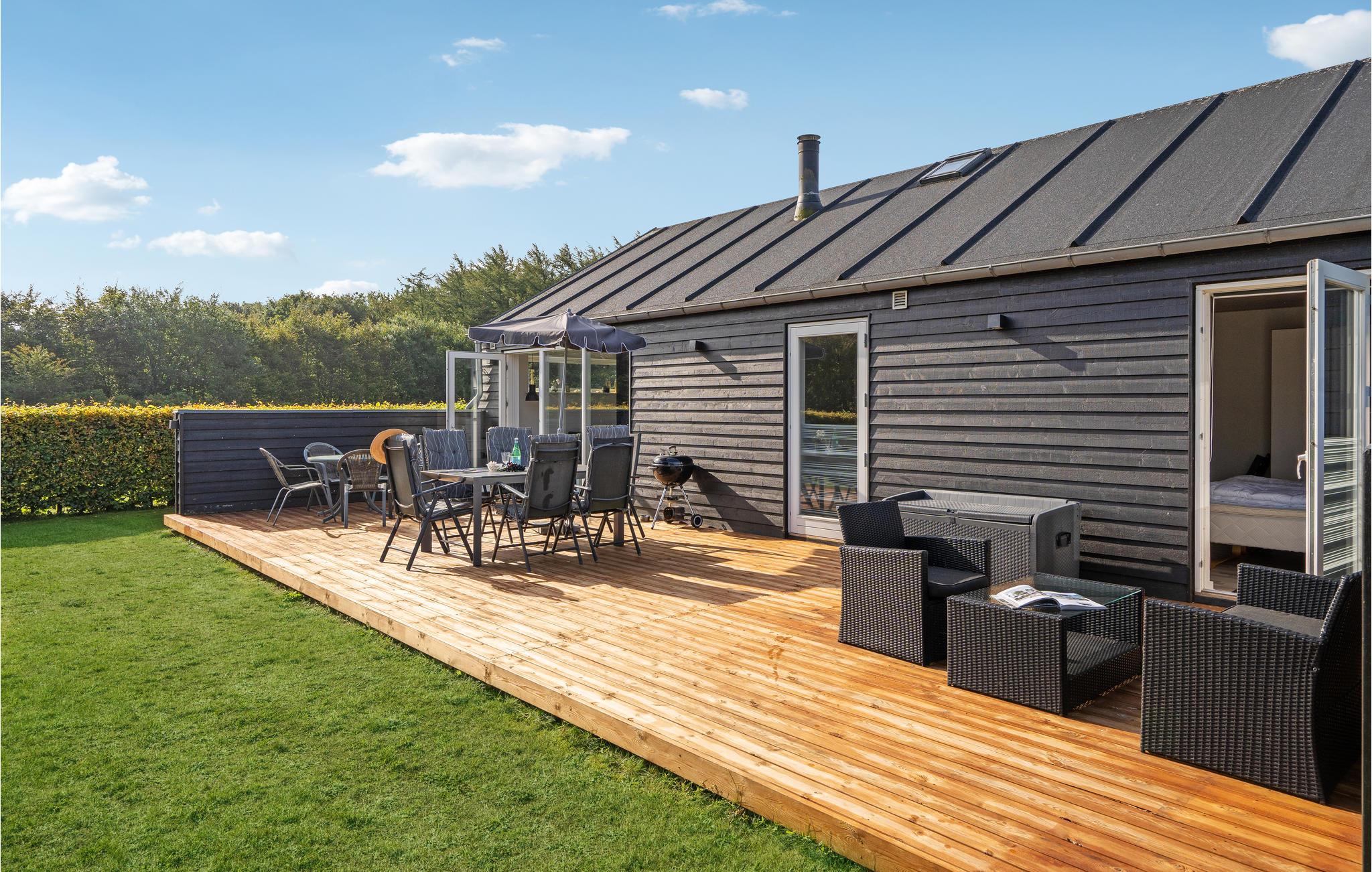 Glæd jer et ophold i dette dekorative og stilfuldt indrettede feriehus, hvor I finder både plads og hjemlig atmosfære. I stuen kan I slappe af i lædersofaerne og se en film eller spille et spil, mens de andre forbereder aftensmaden i køkkenet. Måltiderne kan I nyde sammen ved spisebordet eller ude på den åbne terrasse. Udenfor finder børnene plads til at lege og brede sig i haven.