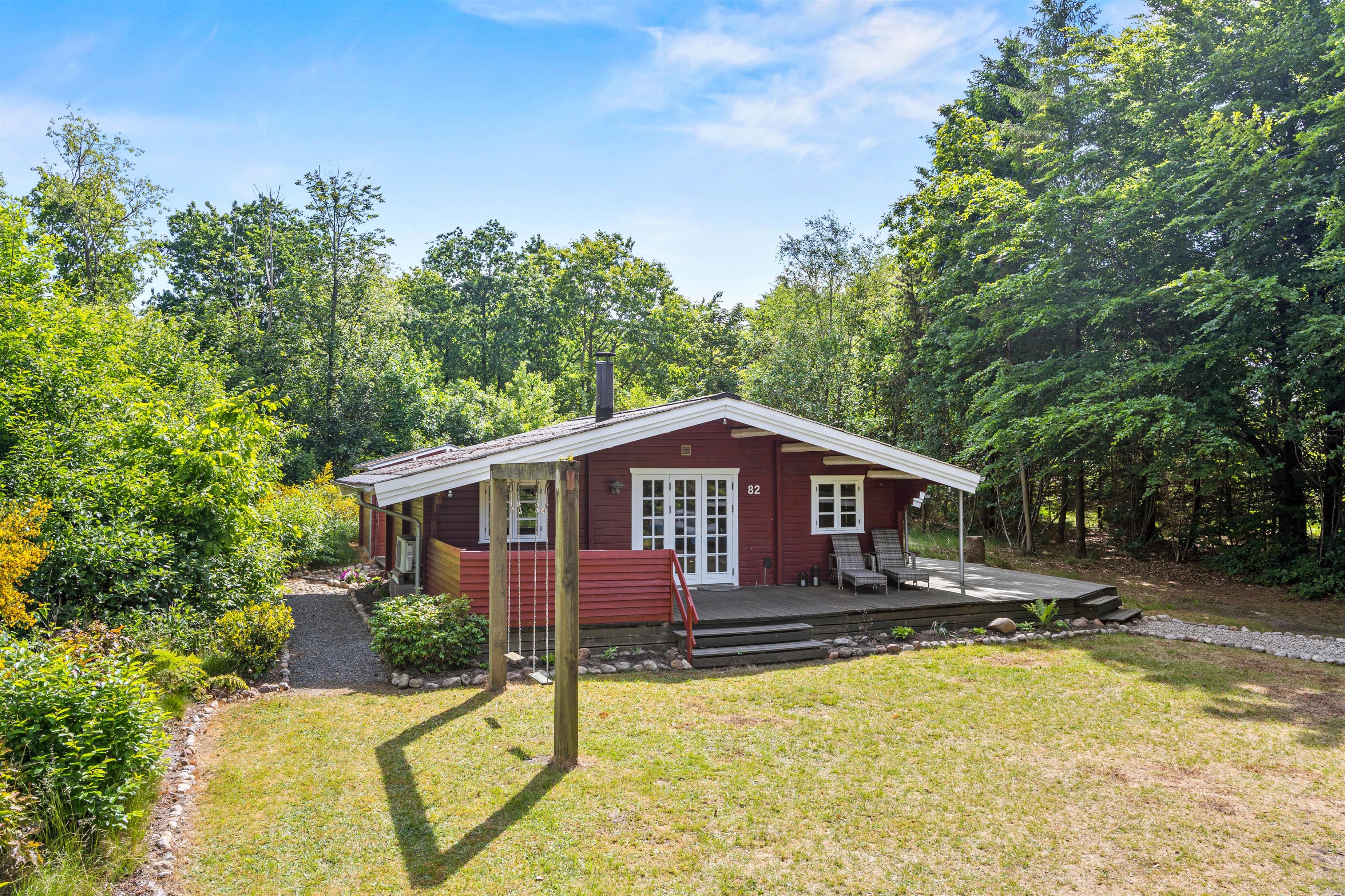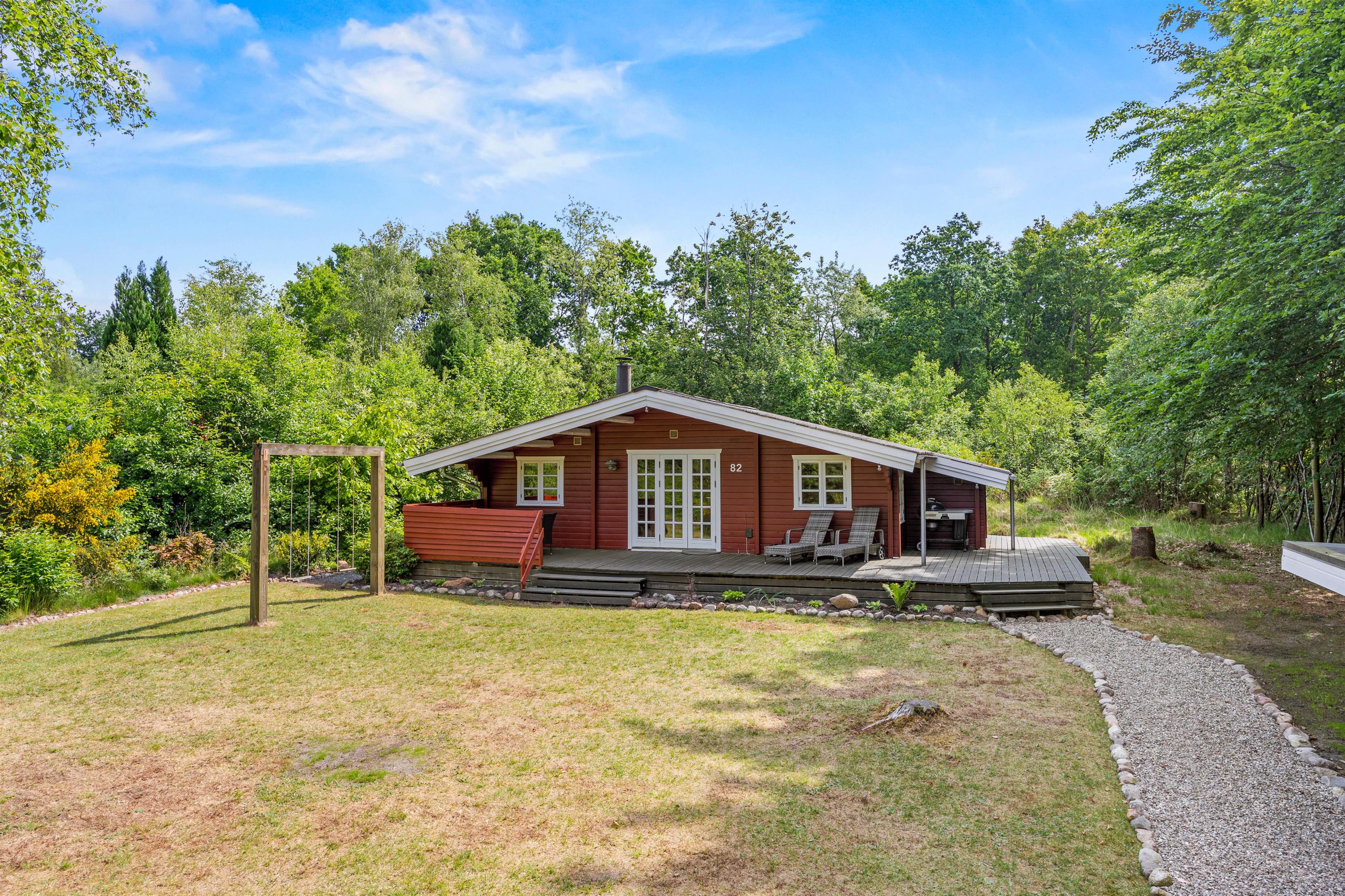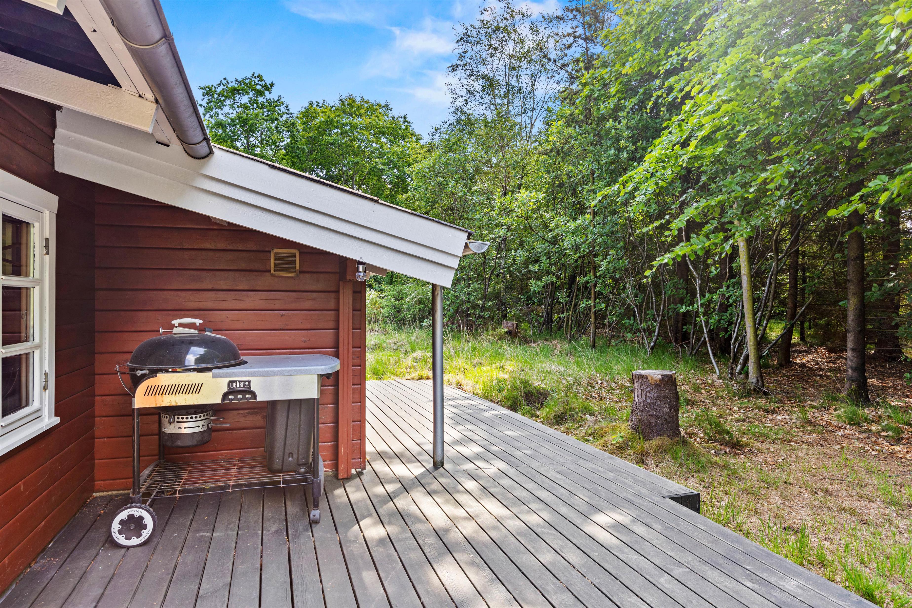Dette sommerhus ligger i et fredeligt ferieområde omgivet af skov og det åbne landskab, perfekt til afslappende gå- og cykelture i det grønne. Her er der ro og plads til at koble helt fra, uanset om I nyder en stille morgen på terrassen eller udforsker de naturskønne stier omkring området.