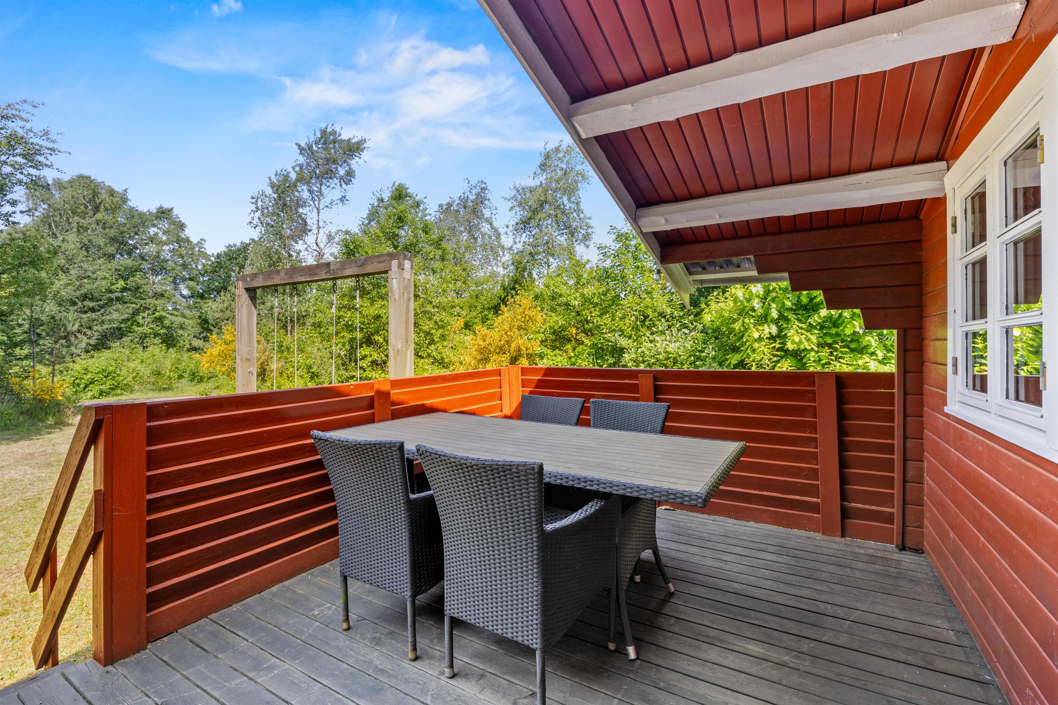 Udenfor venter en 874?m² stor natur- og plænegrund, der indbyder til både afslapning og aktiviteter under åben himmel. Her finder I både en åben og en overdækket terrasse, udstyret med havemøbler og grill, perfekt til lange sommeraftener med god mad og nærvær i det fri. Når solen står højt, kan I læne jer tilbage i solvognen og nyde stilheden, mens børnene trygt kan lege i haven eller gynge.