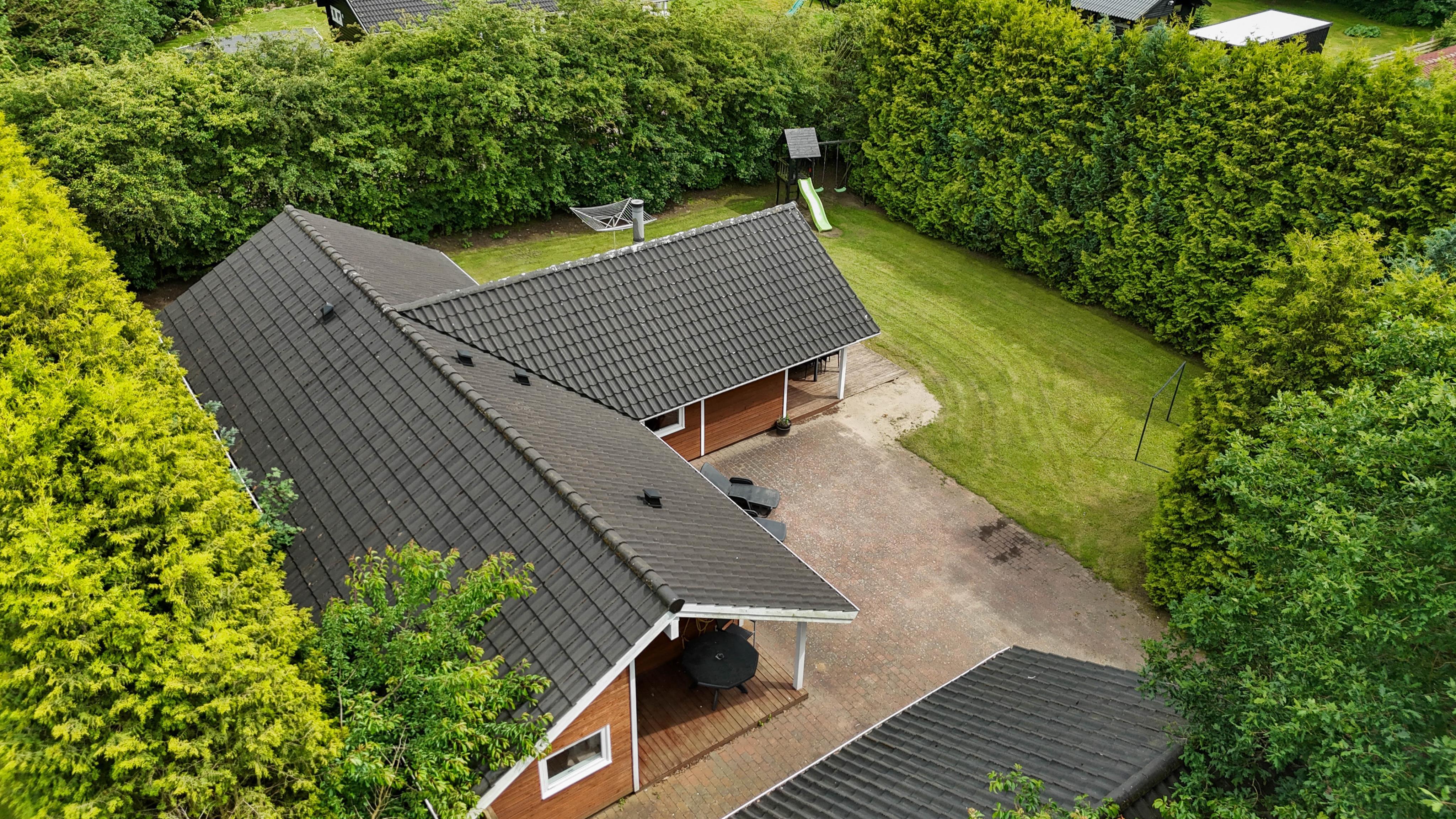 Have med gynge, trampolin og åben terrasse