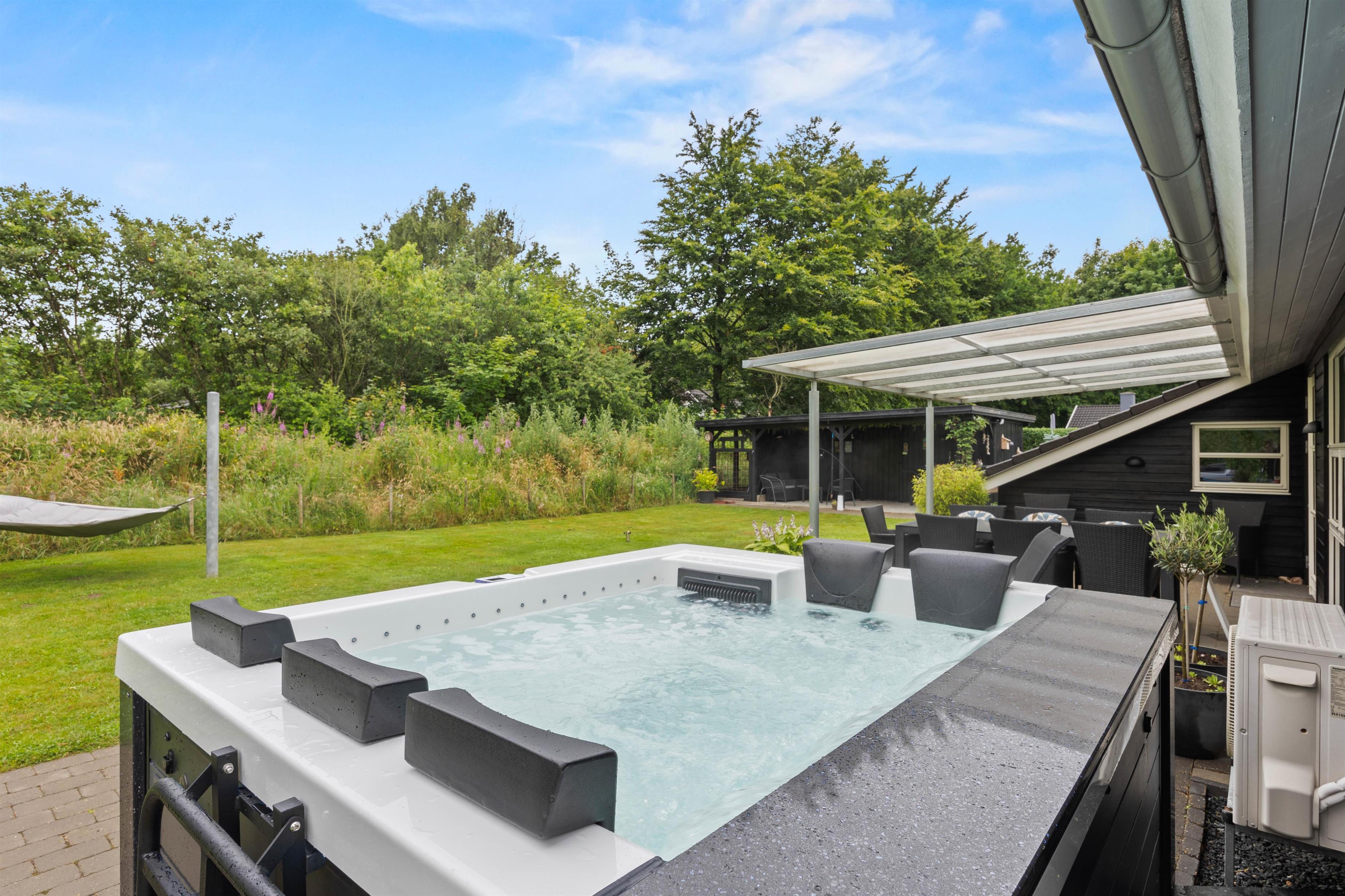 Når du træder ind, mærker du straks den varme og indbydende atmosfære. Den renoverede opholdsstue fra 2023 kombinerer moderne elegance med klassisk dansk hygge. Brændeovnen skaber rammerne for hyggelige aftener, mens den integrerede varmepumpe sørger for behagelig temperatur året rundt. De to moderne badeværelser med gulvvarme gør, at du starter hver dag med komfort og velvære. Som en særlig luksus har sommerhuset også et udendørs spabad, hvor du kan nyde afslappende stunder under åben himmel.