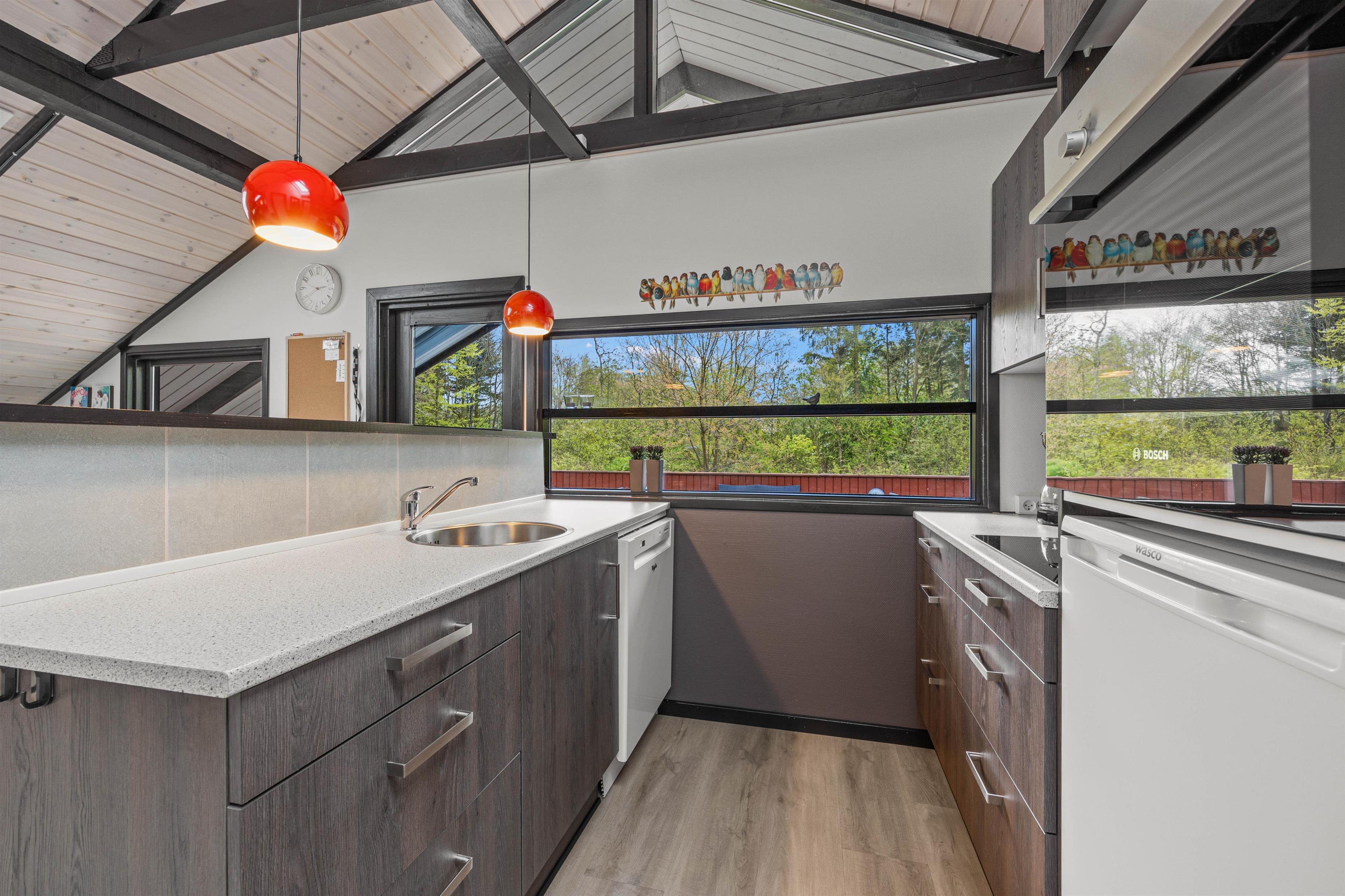 Sommerhuset byder på moderne bekvemmligheder som opvaskemaskine og en energivenlig varmepumpe, der sikrer ekstra komfort under jeres ophold.