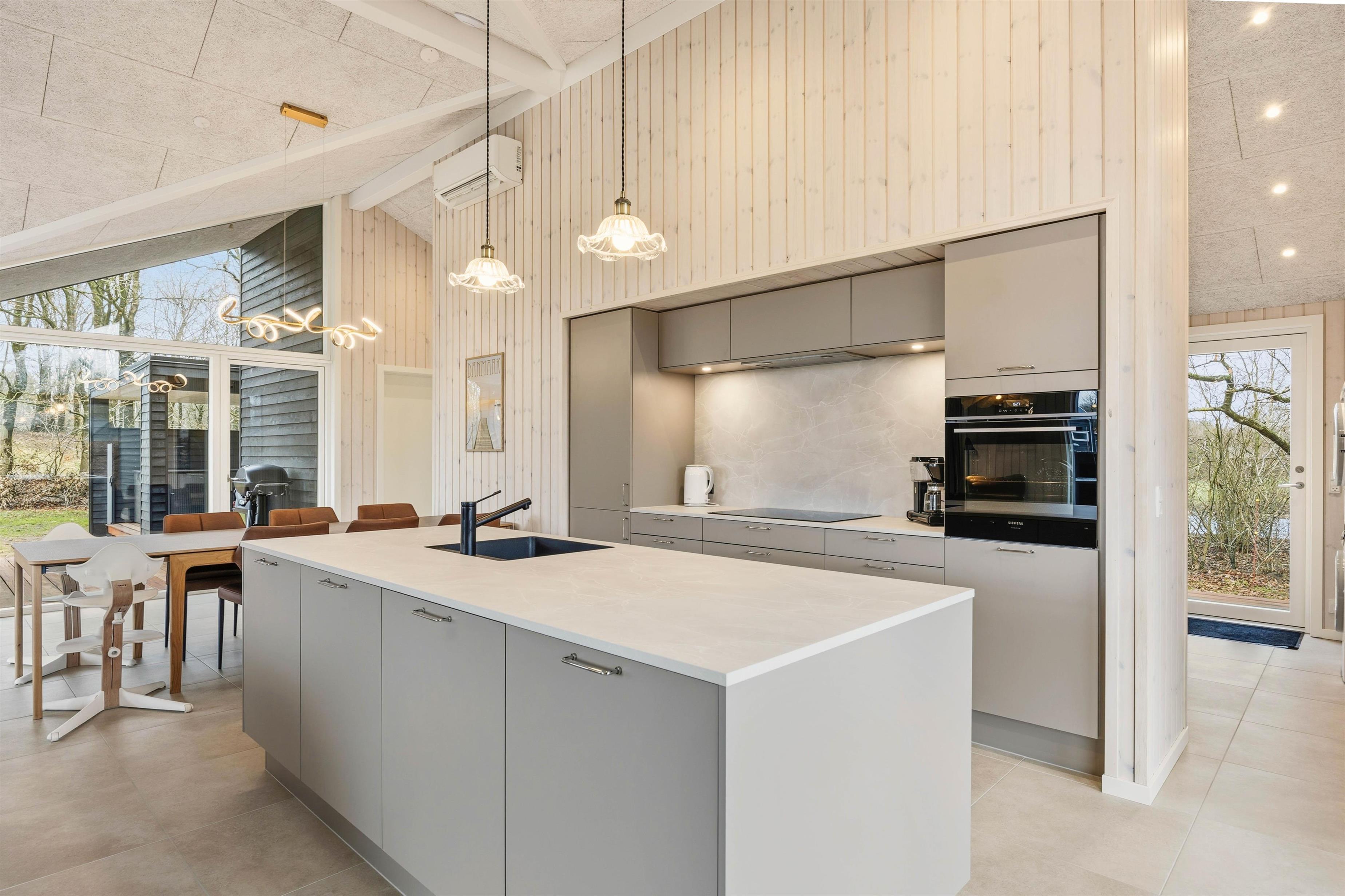 I opholdsrummet forenes køkken, spiseplads og stue. I køkkenet finder I udstyr til at kreere et lækkert måltid, som kan nydes ved det lange spisebord – oprydningen sørger opvaskemaskinen naturligvis for. Imens kan I samles i sofaen til et hyggeligt brætspil eller en god film. For at sikre et behageligt indeklima, er her en energibesparende varmepumpe.