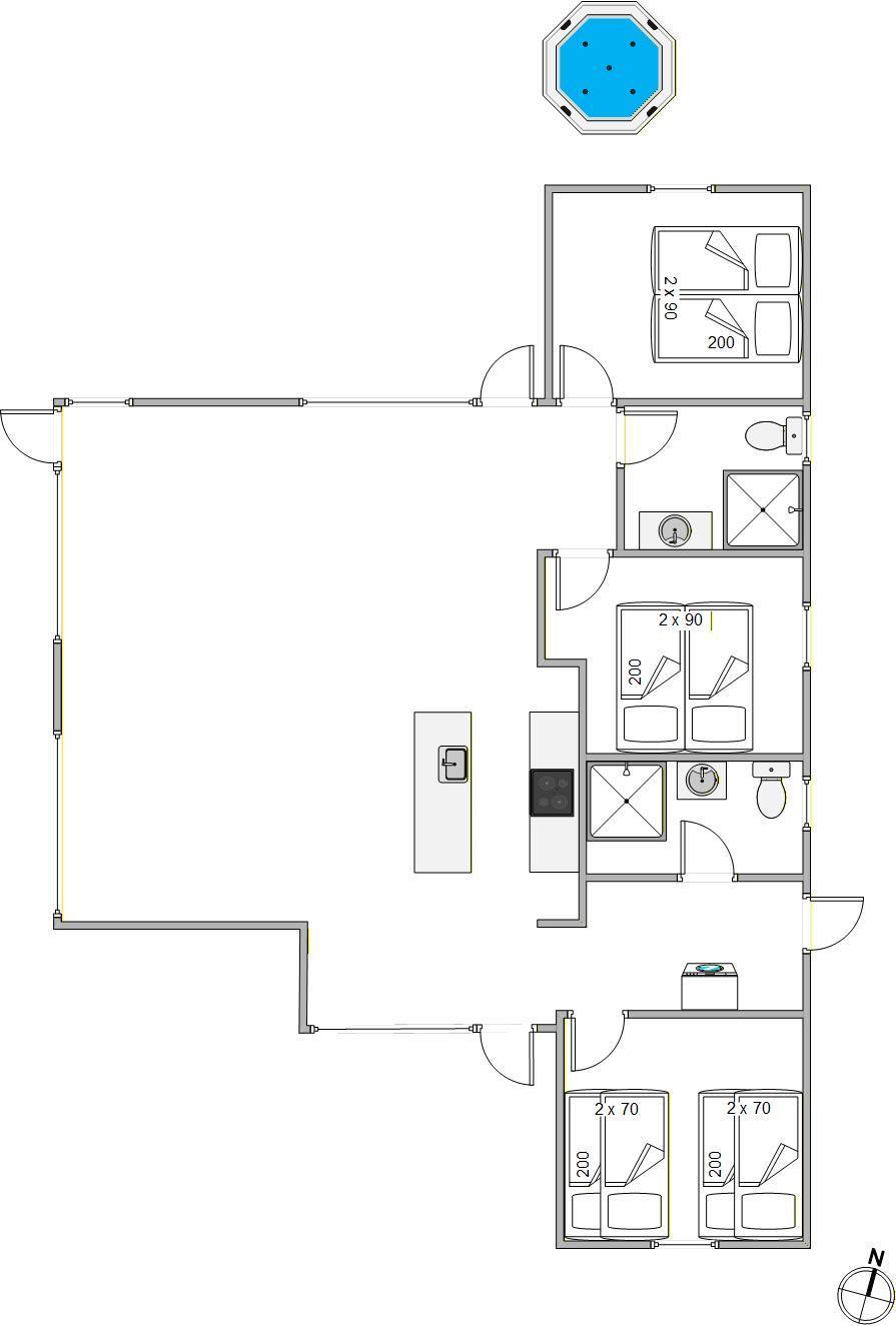 Her er 3 fine værelser, hvoraf det ene er indrettet med to køjesenge – det bliver et hit for familiens mindste. Her er to badeværelser samt en fin entré med vaskesøjle. Med både vaskemaskine og tørretumbler, er I sikret friske håndklæder under hele opholdet.