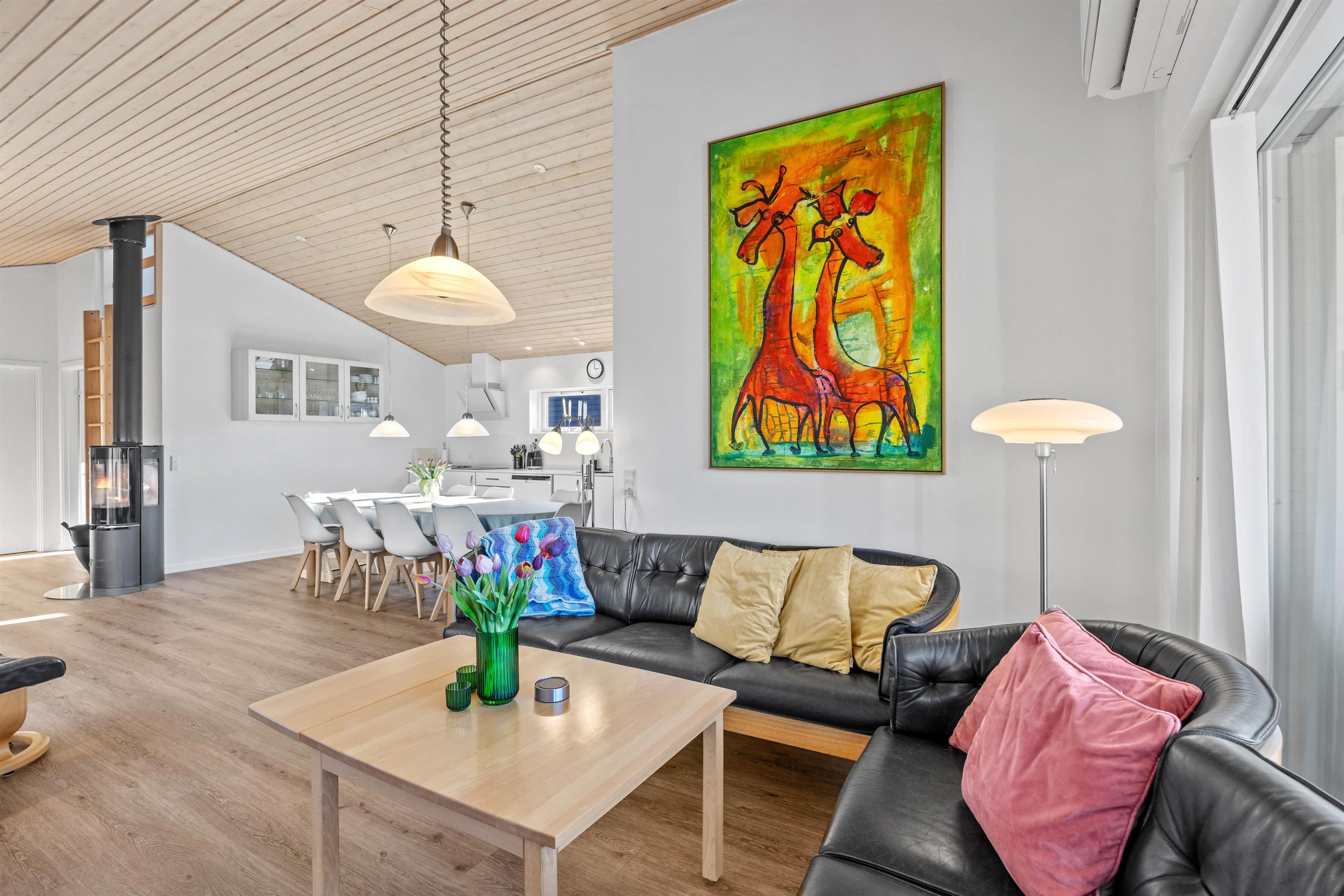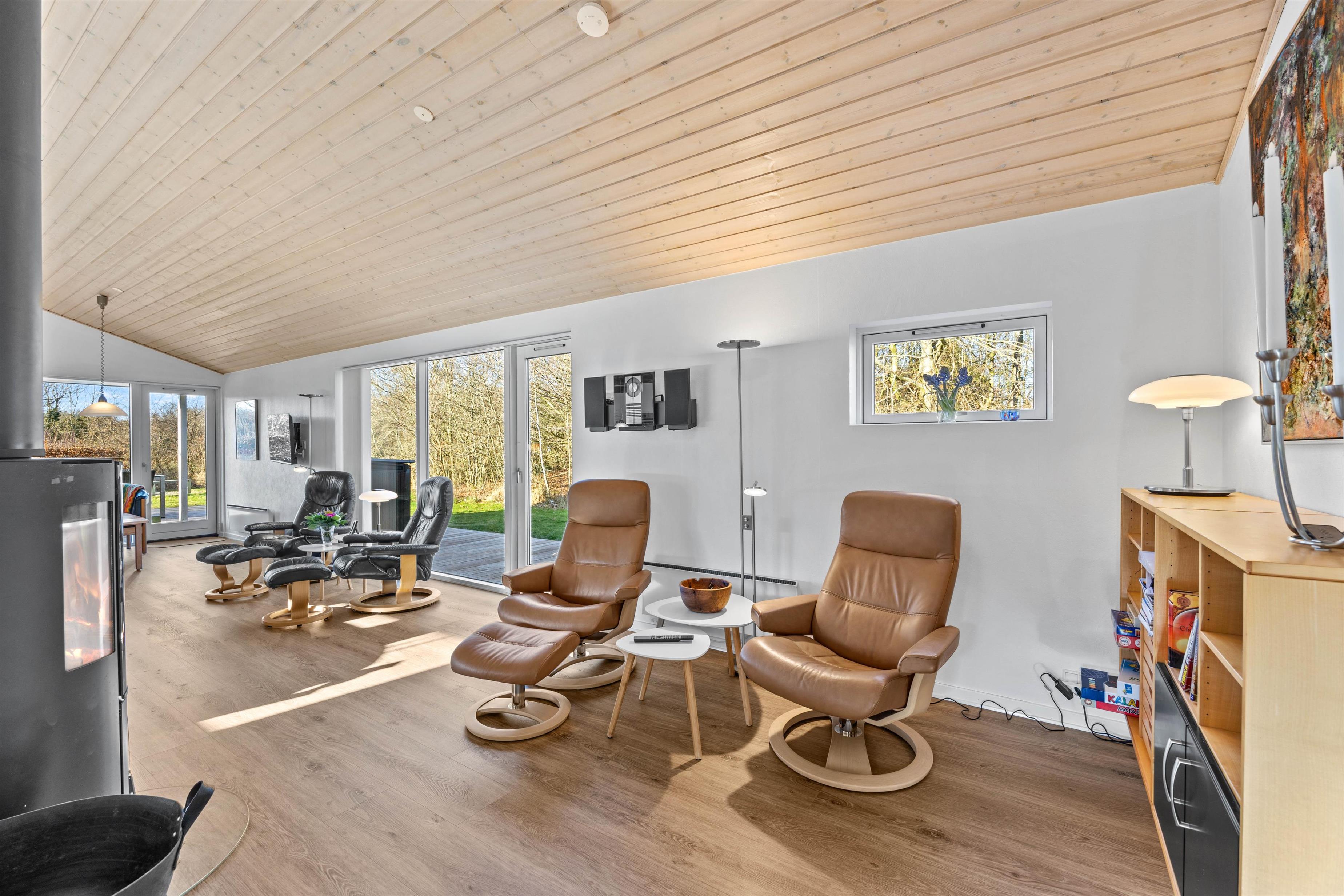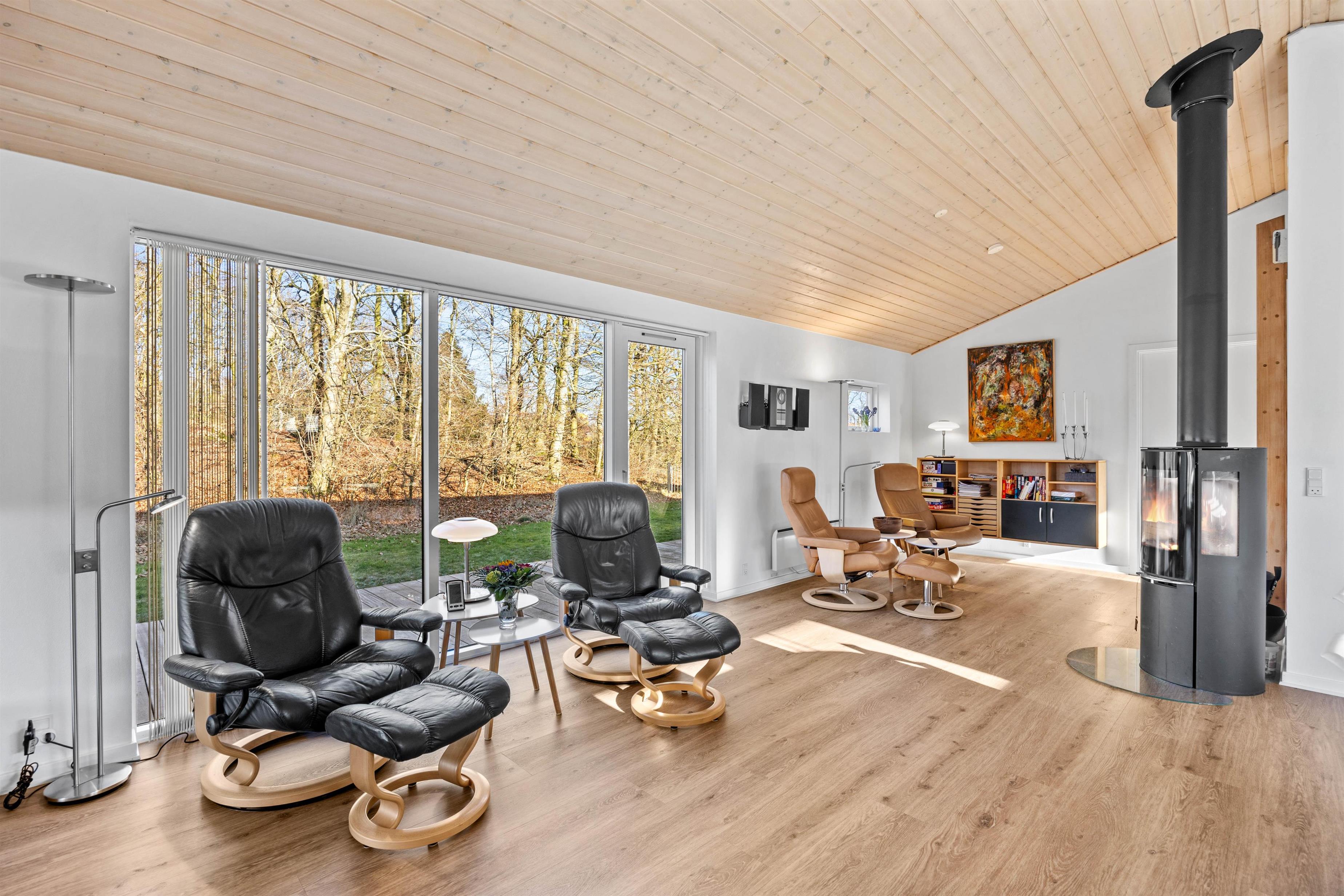 Sommerhuset er renoveret i 2023 og fremstår særdeles lyst og indbydende. I hovedhuset er alrummet, hvor I alle kan samles og skabe gode ferieminder. De store vinduespartier mod nord og vest skaber et fantastisk lysindfald og god atmosfære i rummet. Tænd op i brændeovnen, find drikkevarer og snacks frem og hyg jer med et sjovt kortspil i sofagruppen.