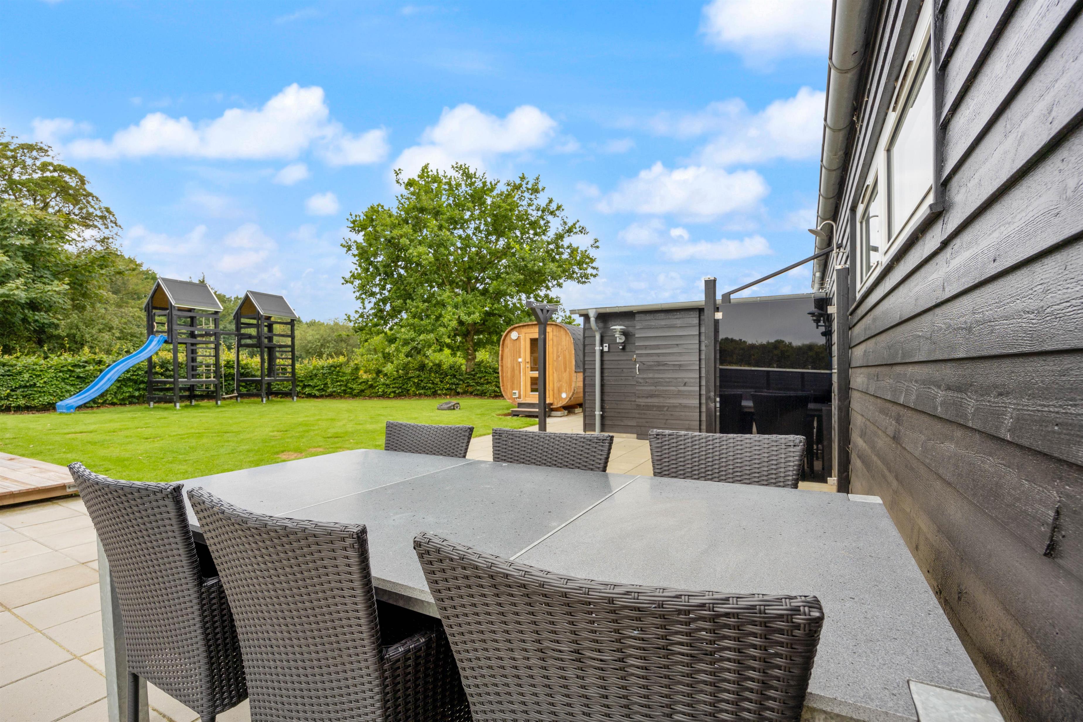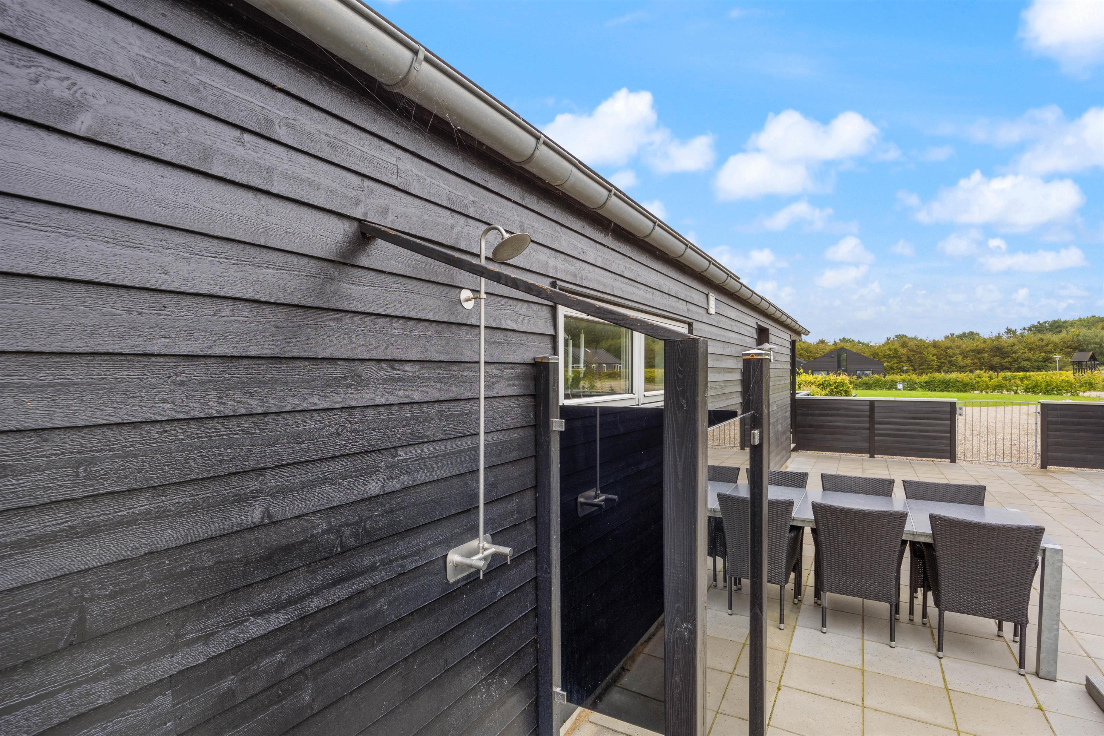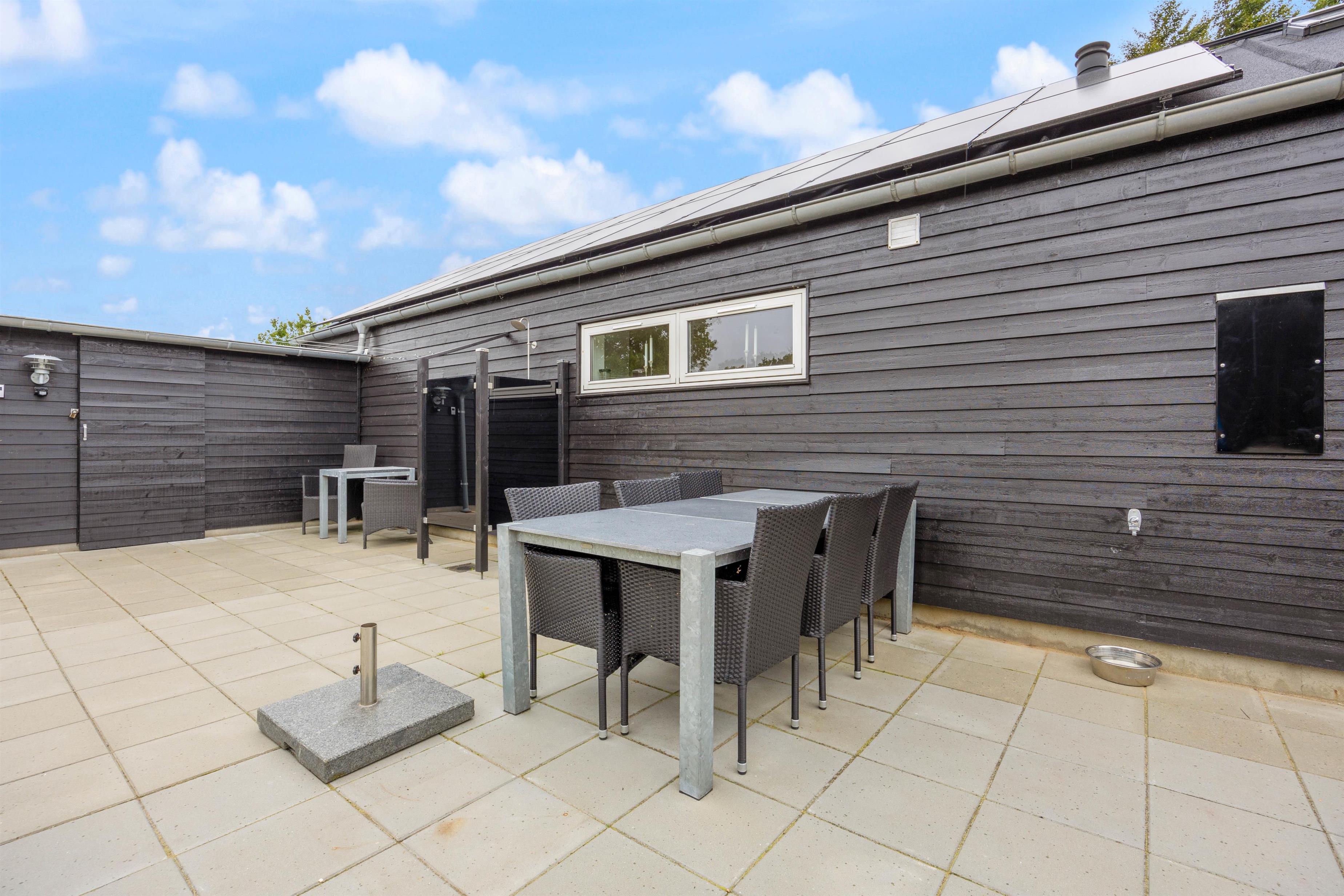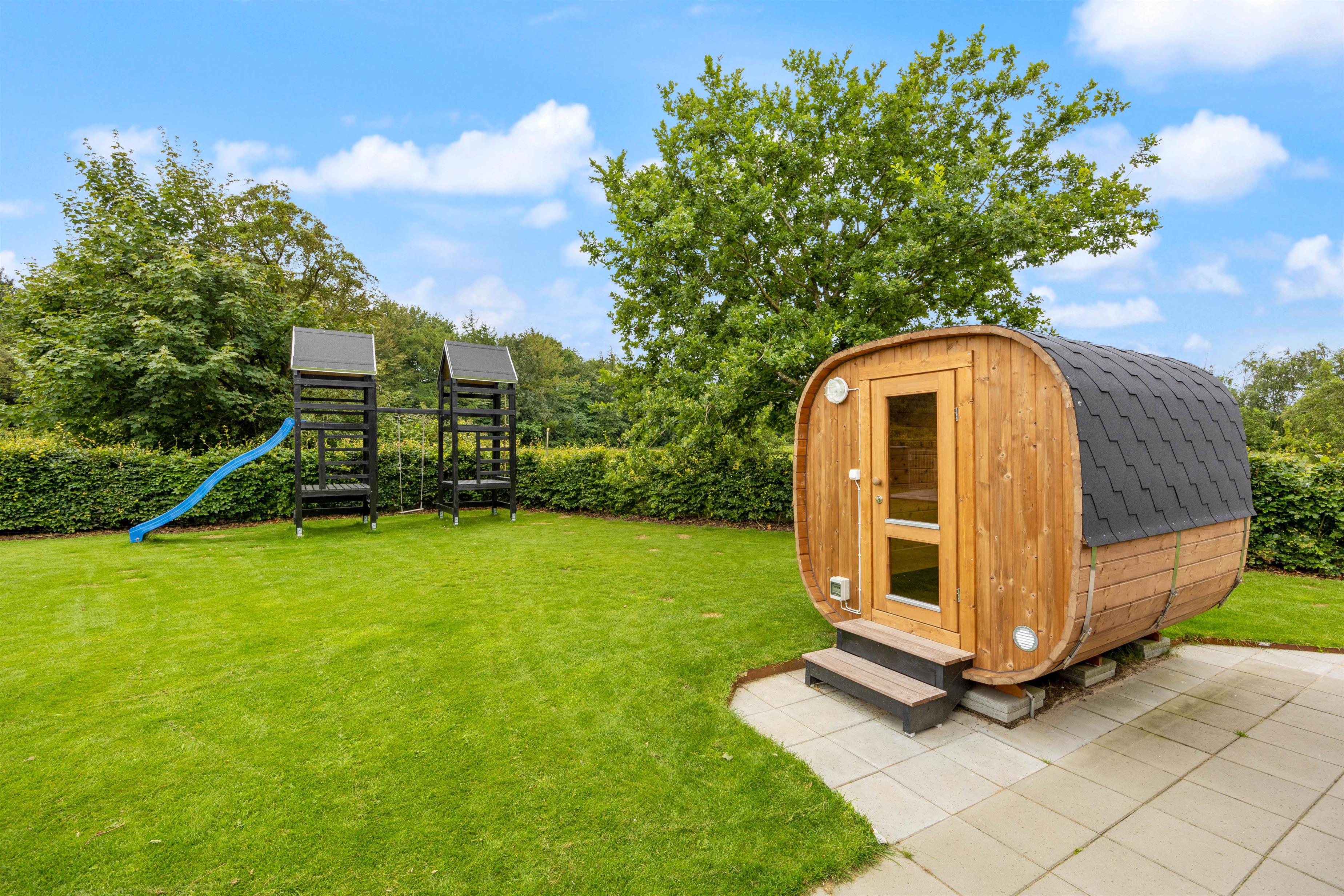 Skulle vejret ikke vise sig fra sin bedste side, kan I alligevel bruge de udendørs faciliteter. Her er nemlig både udespa, udebruser og sauna, som indbyder til afslapning og velvære. Udebruseren kan benyttes fra april til november. – Hvad enten solen skinner, en lille regnbyge passerer eller temperaturen er til den kølige side.