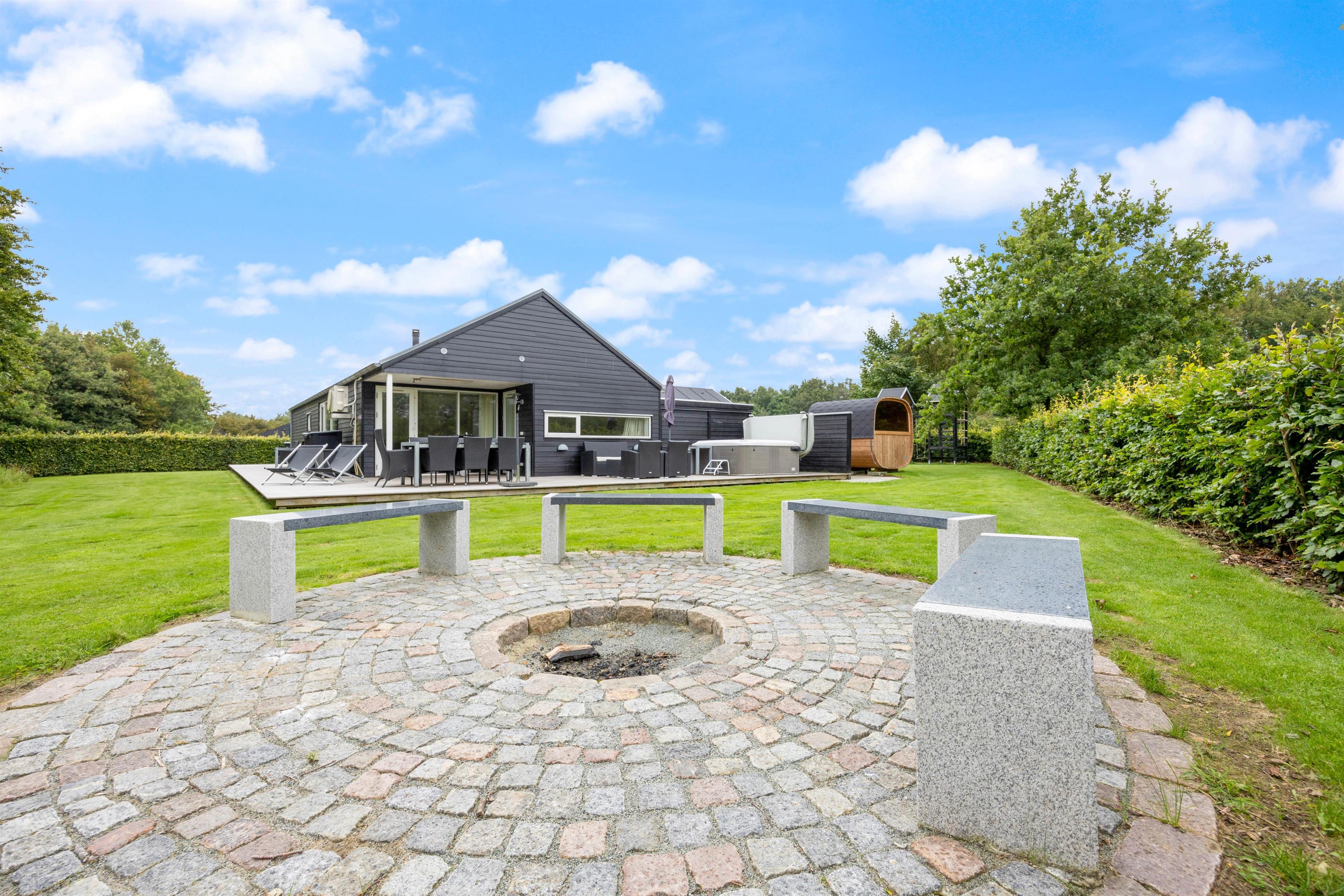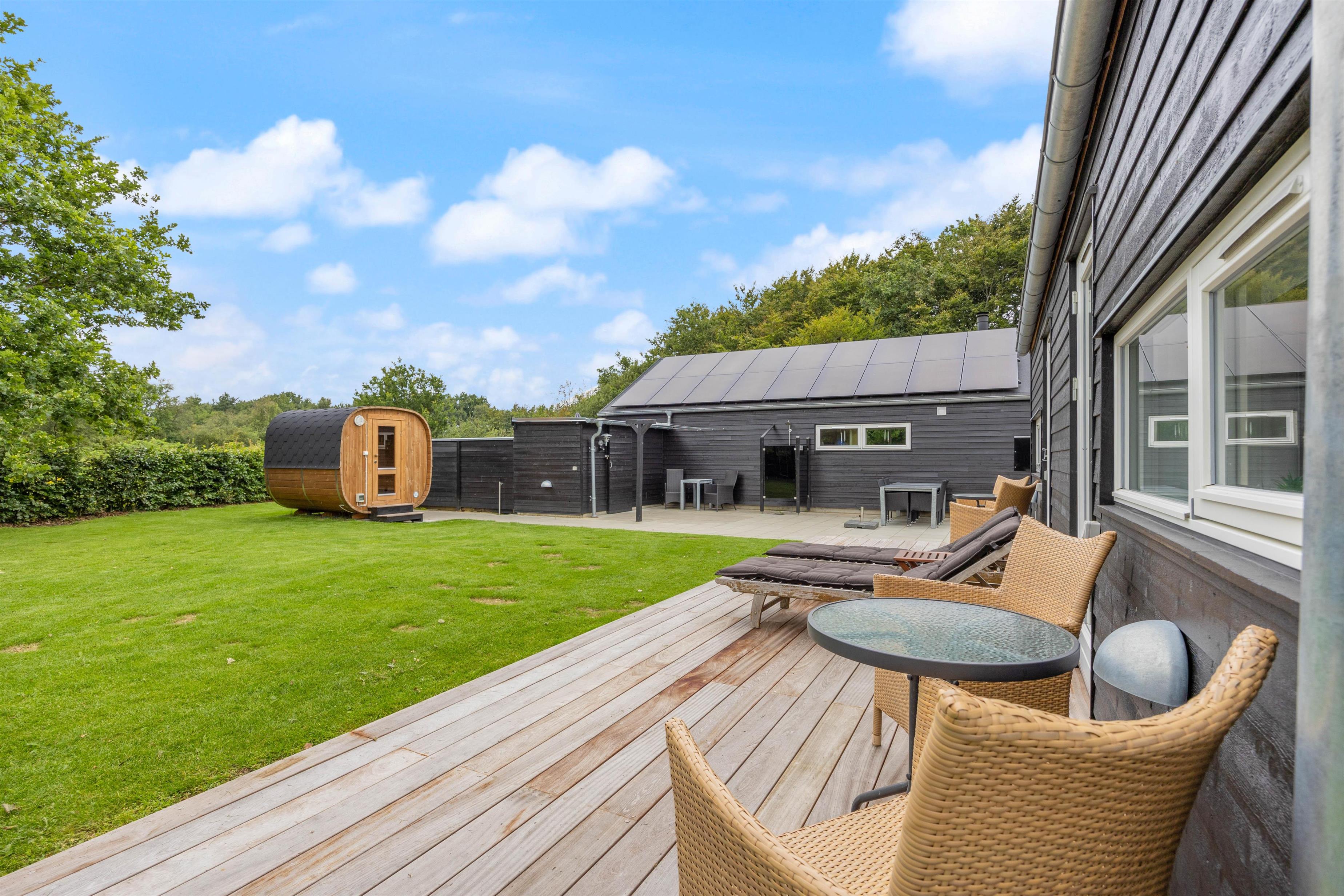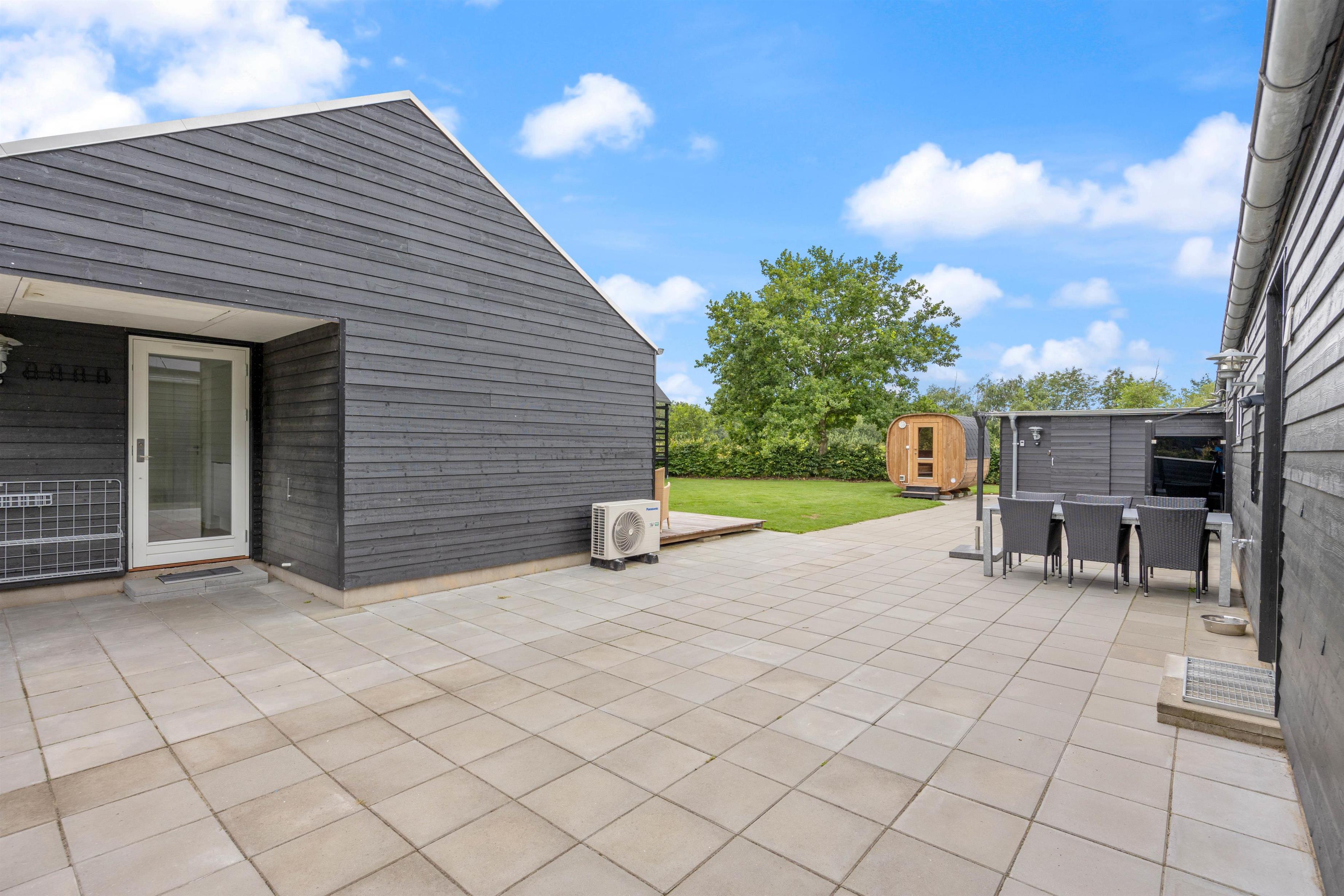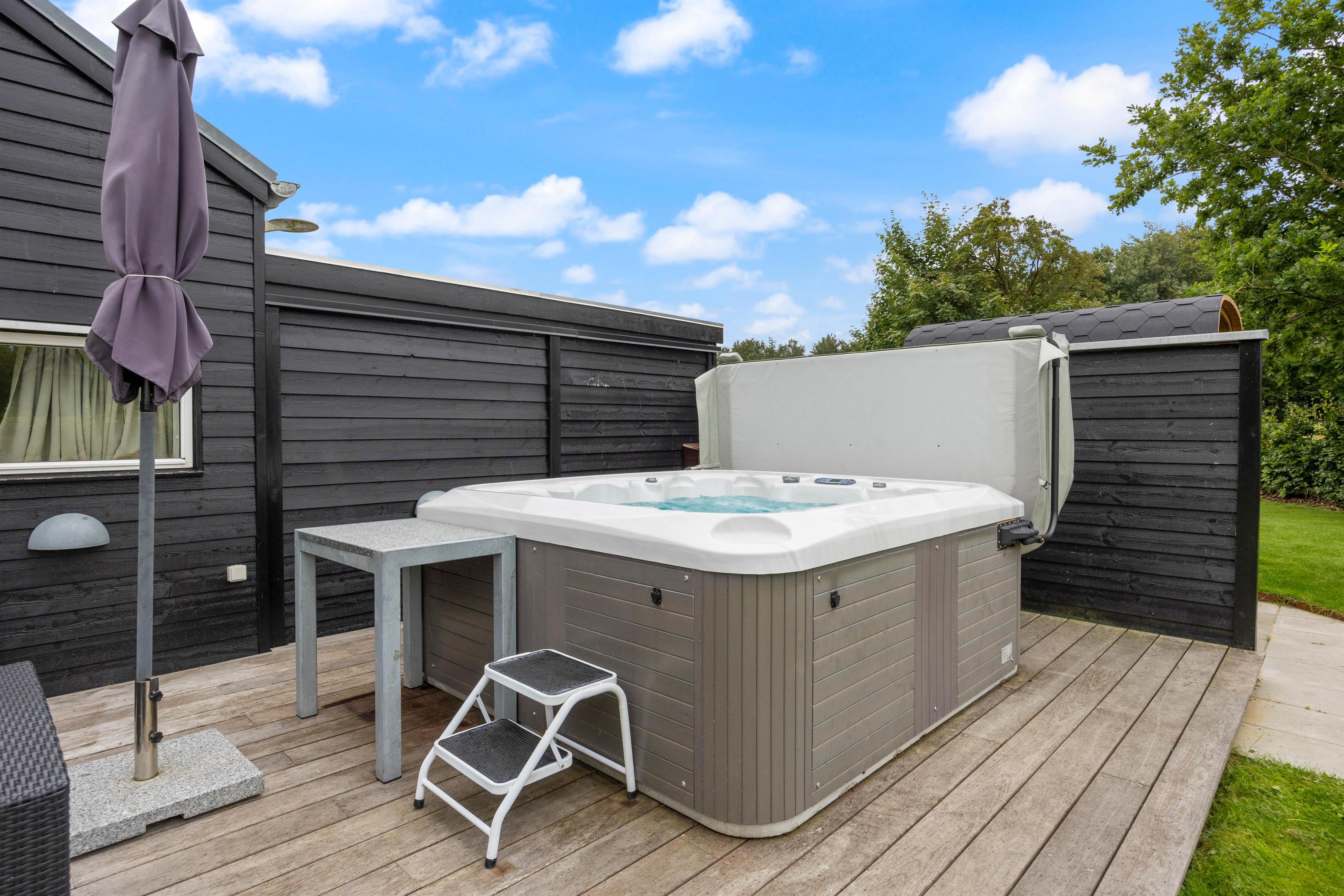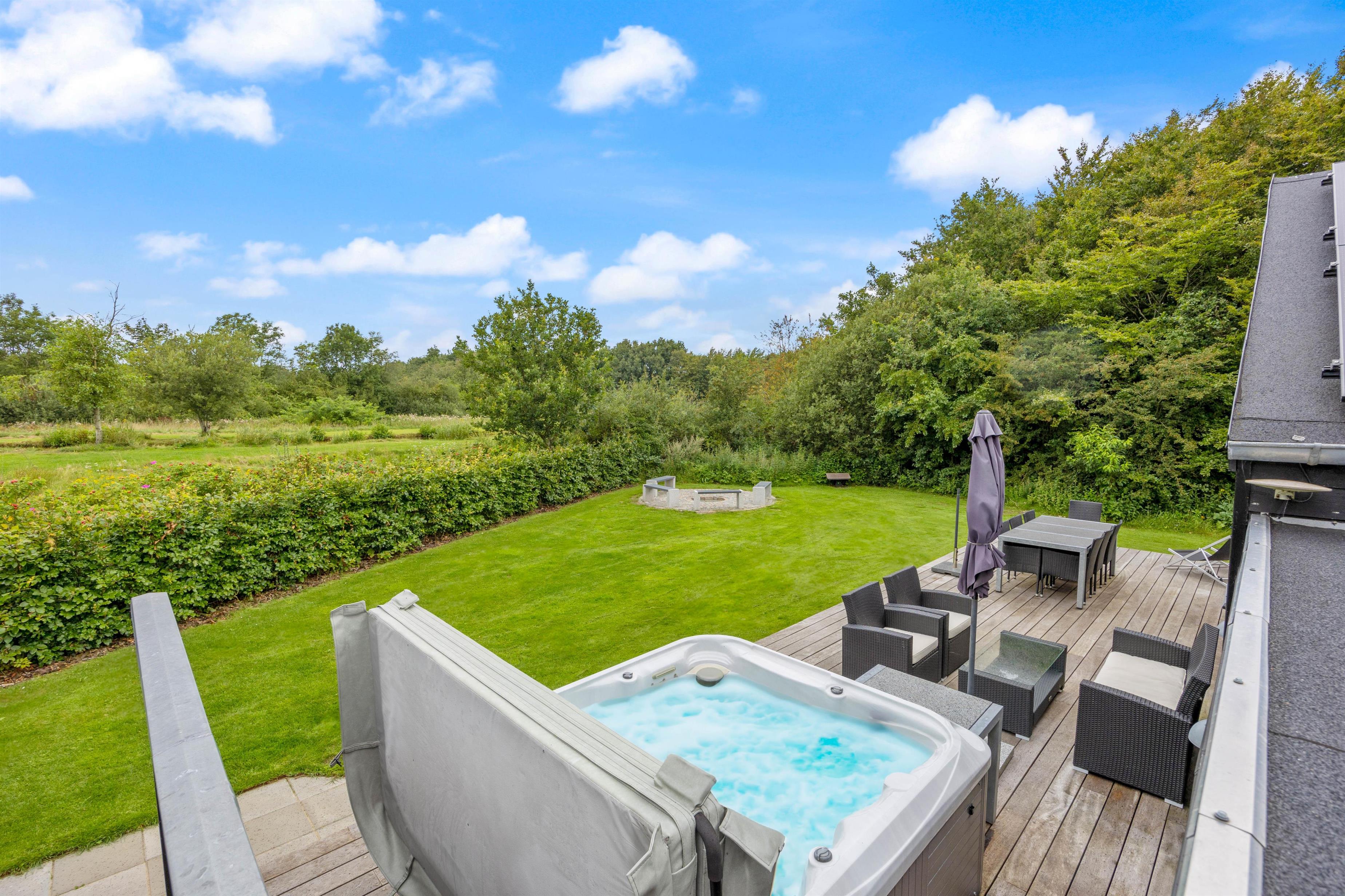 Lækkert udeareal med udespa, udebruser og sauna