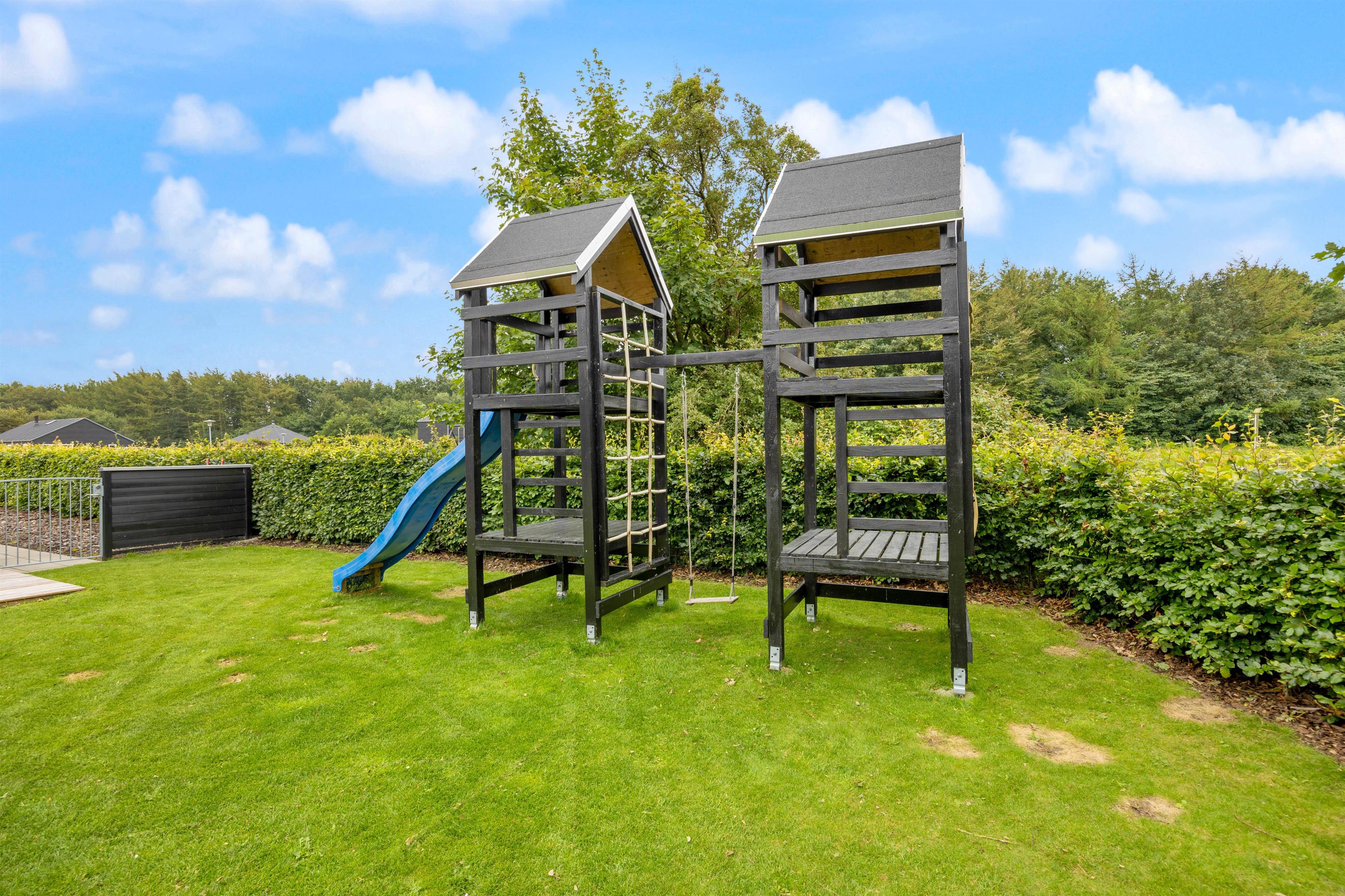 Til familiens yngste er der et fint legestativ med gynge og rutsjebane. Når I alle skal lave en hyggelig aktivitet, kan I tænde op ved bålstedet, hvor I måske vil bage snobrød og riste skumfiduser.