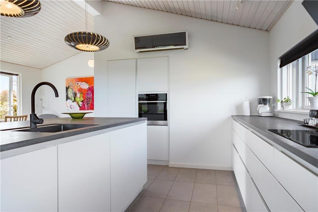 I dette flotte sommerhus i 1. række ved As Vig Strand får du en ferieoplevelse ud over det sædvanlige. Allerede fra husets store køkken-alrum bliver du mødt af en panorama udsigt over havet, som fylder rummet med lys og ro. Her kan familien samles omkring måltiderne, mens blikket glider ud mod horisonten. Den smagfulde indretning kombinerer moderne komfort med klassisk sommerhusstemning, og i stuen kan du tænde op i brændeovnen på kølige dage og skabe den helt rette hygge. Når der skal skrues ekstra op for afslapningen, kan du nyde en stund i spaen – et perfekt sted at lade kroppen falde til ro efter en dag fyldt med oplevelser.