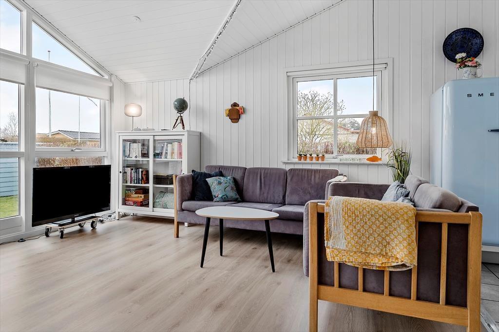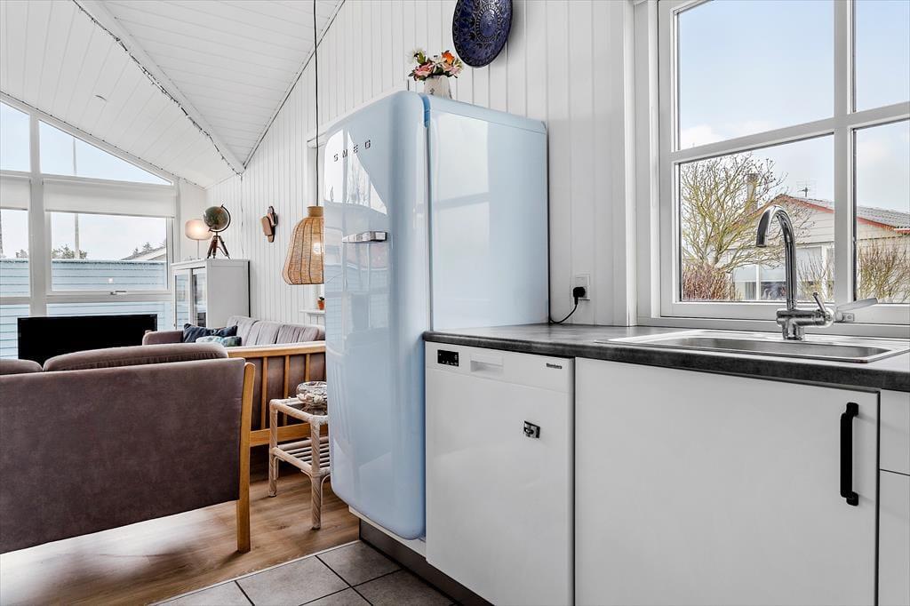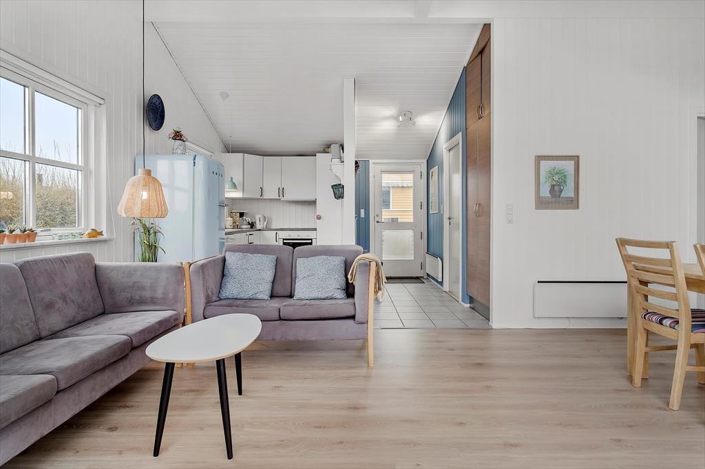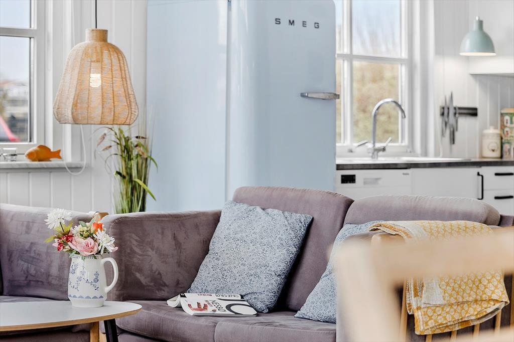 Når du træder ind i huset, bliver du mødt af et indbydende og lyst rum, hvor de varme og naturlige farver skaber en hyggelig sommerhusstemning. Fra de bløde nuancer på væggene til de rolige blå og grønne accenter, der giver følelsen af at være tæt på havet, er det tydeligt, at her er valgt farver, der understøtter feriens lette og afslappede vibe. De store vinduer lukker masser af naturligt lys ind, og den åbne planløsning giver mulighed for både fællesskab og ro. Køkkenet er elegant og praktisk, men et farvet køleskab som binder det fint sammen med resten af indretningen. De gode komfortable møbler gør det nemt at føle sig hjemme her i sommerhuset. Dette er et sted, hvor du kan trække dig tilbage og lade op, men hvor du også kan skabe uforglemmelige minder med dem, du holder af.