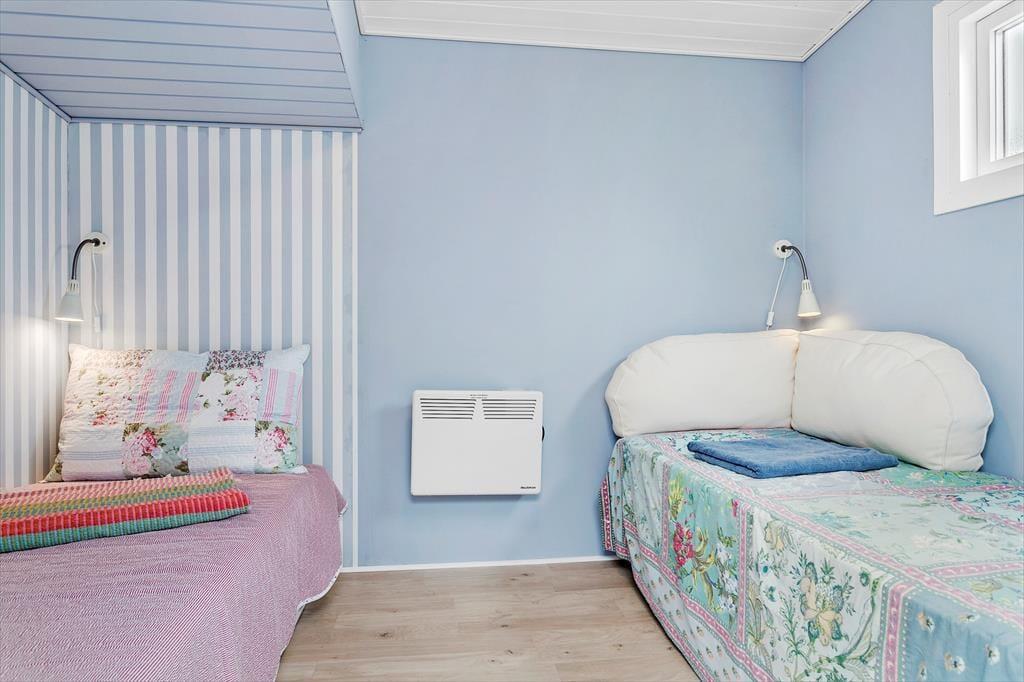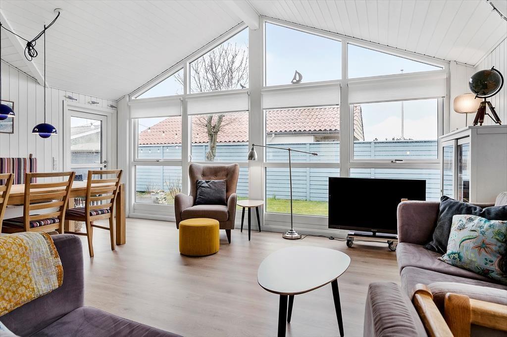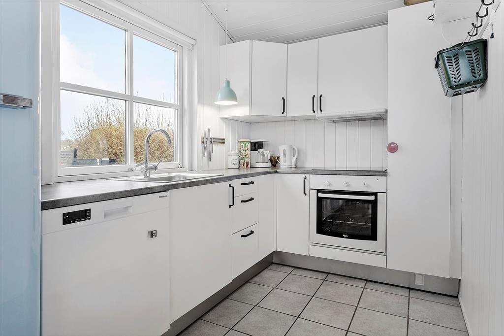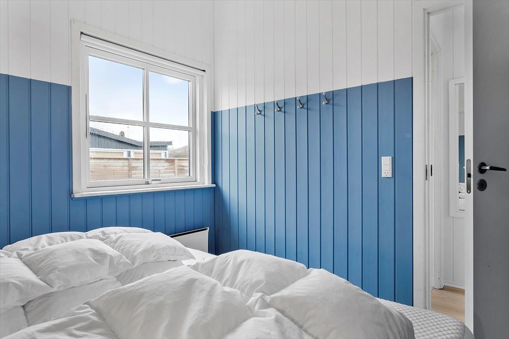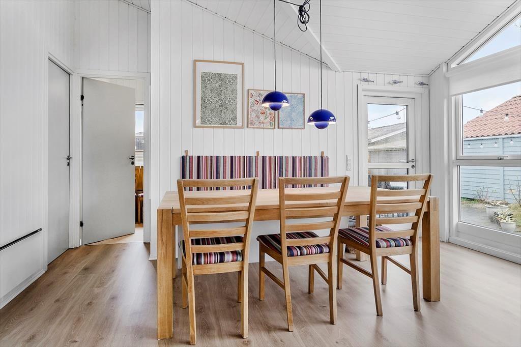 Når du træder ind i huset, bliver du mødt af et indbydende og lyst rum, hvor de varme og naturlige farver skaber en hyggelig sommerhusstemning. Fra de bløde nuancer på væggene til de rolige blå og grønne accenter, der giver følelsen af at være tæt på havet, er det tydeligt, at her er valgt farver, der understøtter feriens lette og afslappede vibe. De store vinduer lukker masser af naturligt lys ind, og den åbne planløsning giver mulighed for både fællesskab og ro. Køkkenet er elegant og praktisk, men et farvet køleskab som binder det fint sammen med resten af indretningen. De gode komfortable møbler gør det nemt at føle sig hjemme her i sommerhuset. Dette er et sted, hvor du kan trække dig tilbage og lade op, men hvor du også kan skabe uforglemmelige minder med dem, du holder af.