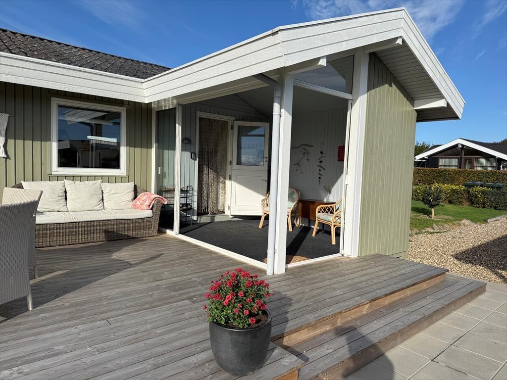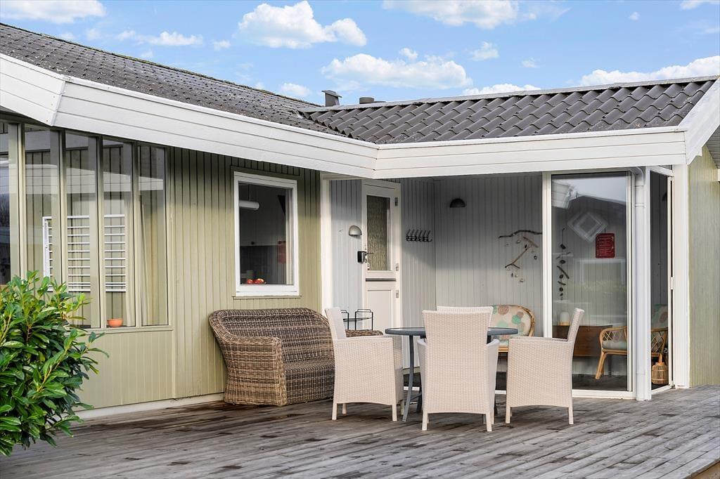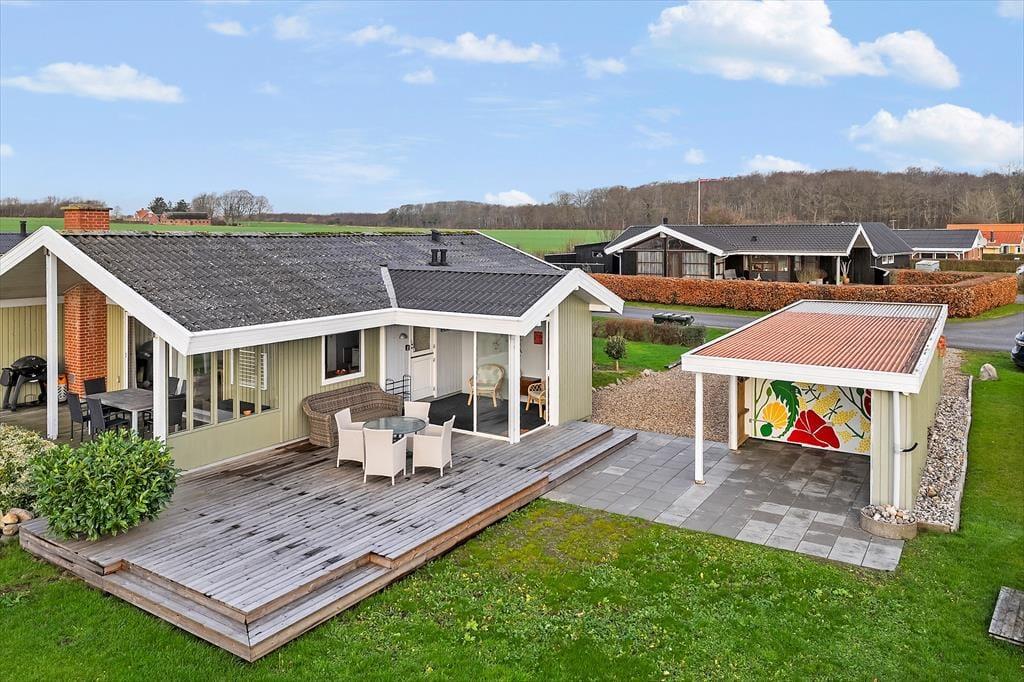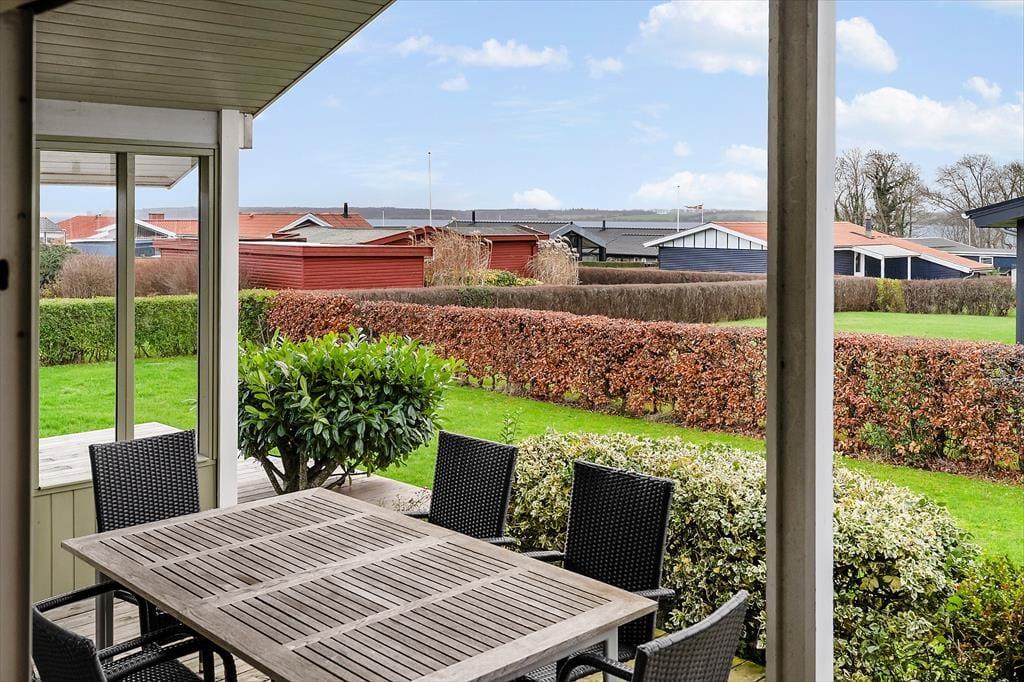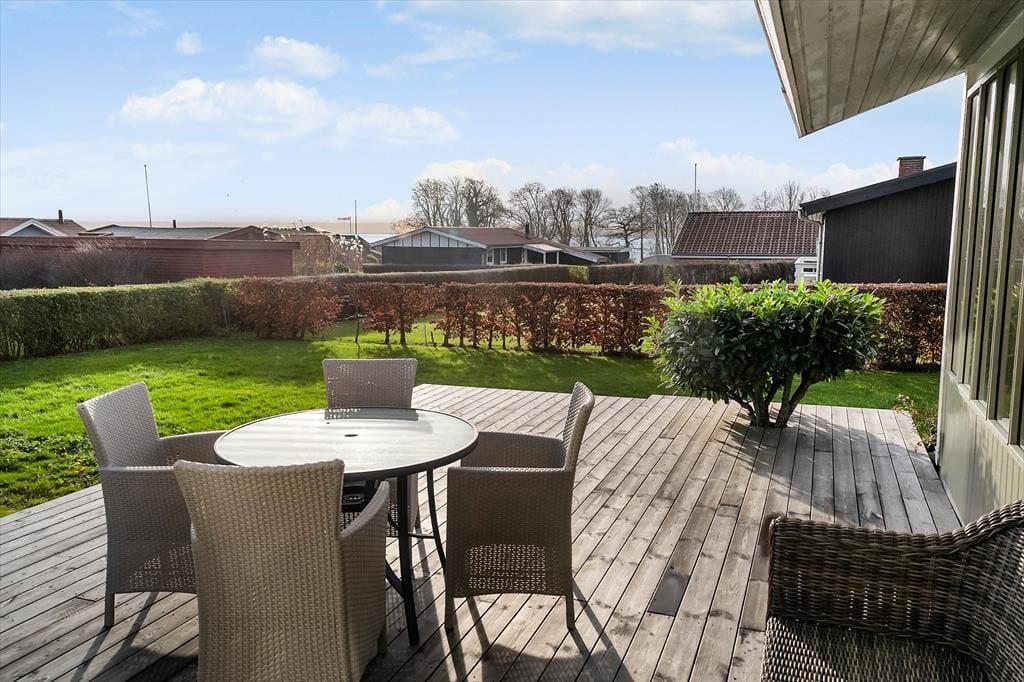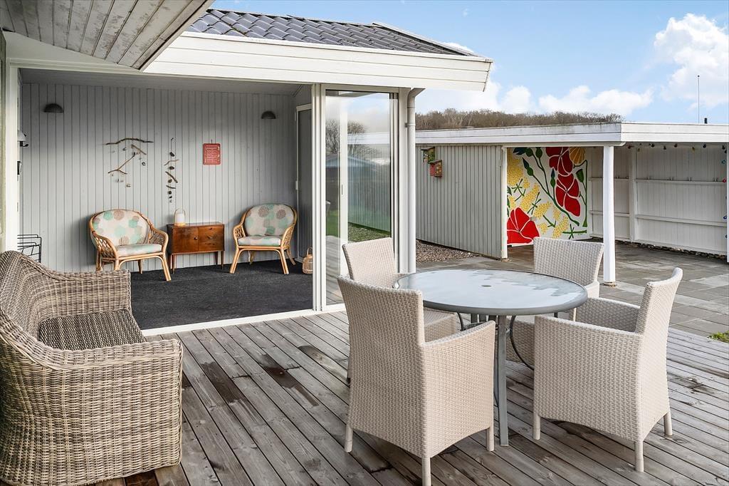 Udendørsområdet byder på en dejlig overdækket terrasse, hvor du kan nyde den fantastiske ro. Den rummelige have med en stor græsplæne er ideel til leg, spil og solbadning. Slap af i de komfortable solstole og nyd roen. Fra terrassen kan du beundre udsigten over sommerhusområdet med et lille havkig. Ved ankomst kan du parkere bilen i indkørslen, der ligger lige op ad huset, så du nemt kan komme tørskoet indenfor. Her er der masser af plads til at nyde livet og den friske luft i fulde drag.