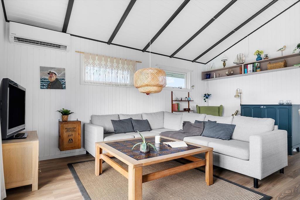 Stuen ligger i direkte forbindelse med spisepladsen og køkkenet, hvilket skaber en uformel atmosfære, hvor alle kan hygge sig sammen – selv når måltiderne tilberedes. De store vinduer i stuen lader det naturlige lys strømme ind og skaber en lys og luftig stemning, der indbyder til ro og afslapning. Her kan du fordybe dig i en god bog med en kop kaffe, mens hverdagens stress forsvinder i det fredfyldte miljø, eller se en god film på fjernsynet.