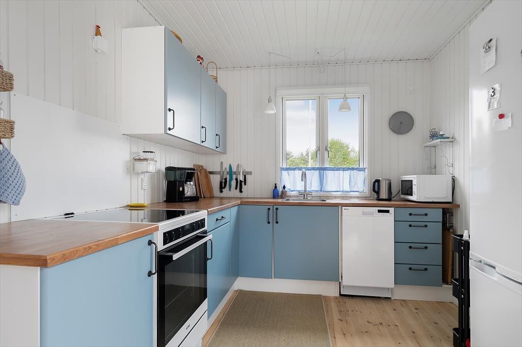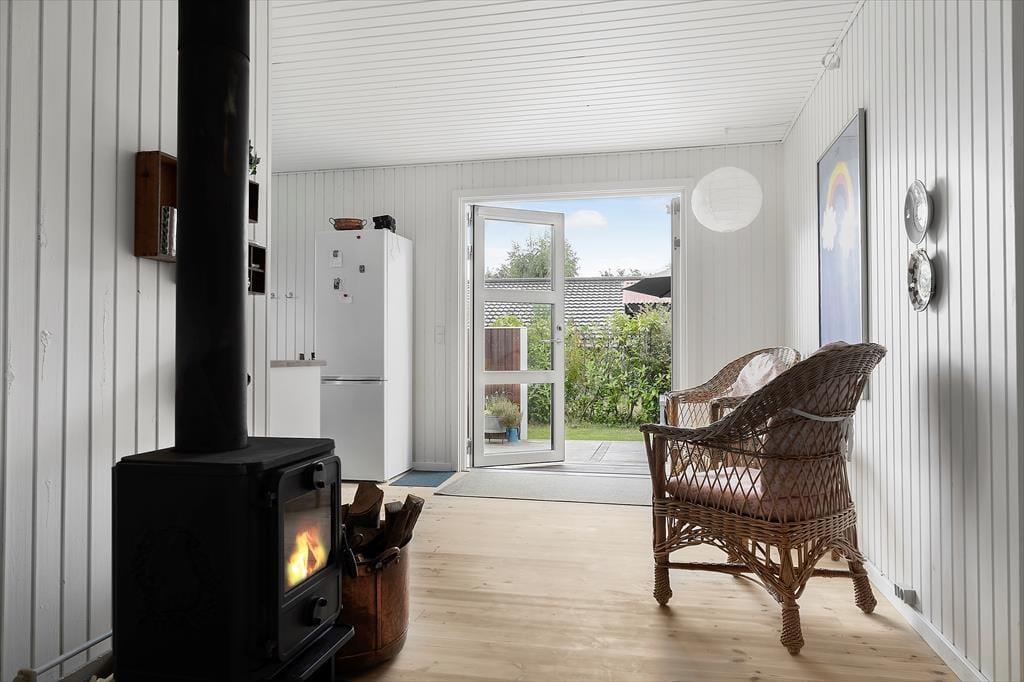 I husets hjerte finder I den store stue med åbent køkken – et naturligt samlingspunkt med brændeovn til de kølige aftener og direkte udgang til den hyggelige terrasse. Her kan I samles til brætspil, feriemiddage og lange snakke. Fra både køkkenet og udestuen er der adgang til haven og den dejlige, delvist overdækkede terrasse. Badeværelset er lyst og funktionelt indrettet med bruseniche og vaskemaskine.
