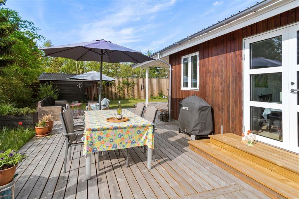 Sommerhuset er omgivet af flere solrige træterrasser, hvor I kan nyde sommeren i havemøblerne eller slappe af i liggestolene under parasollen. Om aftenen kan grillen tændes, og I kan nyde feriestemningen under den overdækkede terrasse – måske med et glas vin, mens solen går ned.