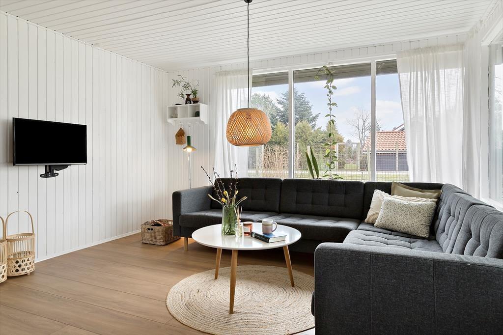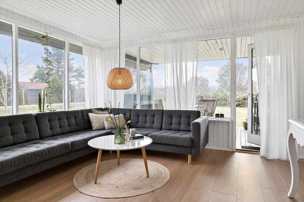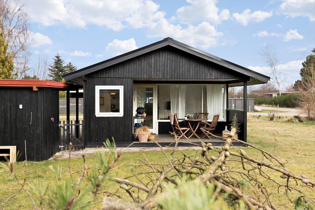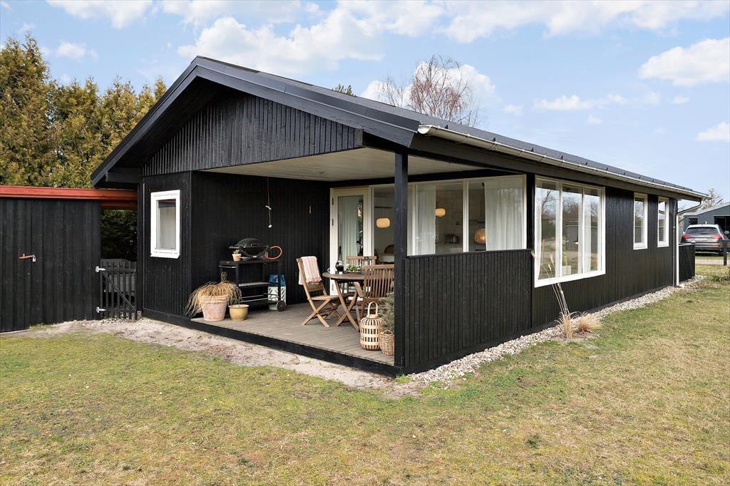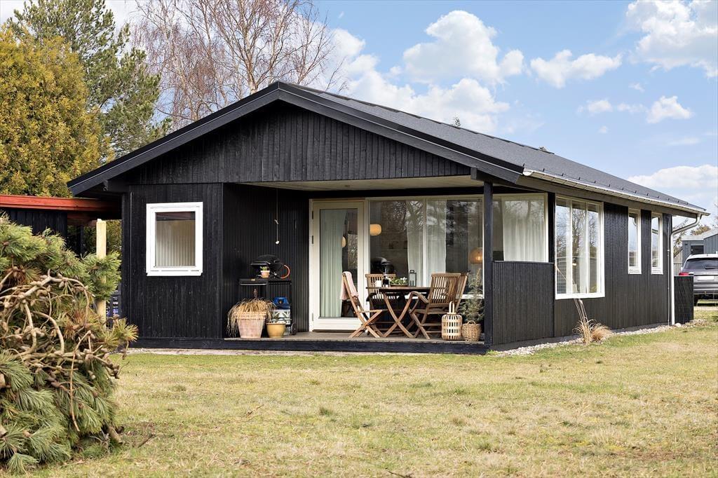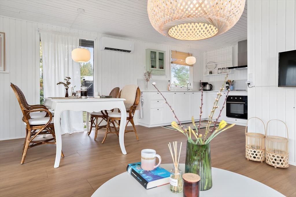 Et hyggeligt sommerhus, hvor feriestemningen både ude og inde er tydelig. Stuen er åben og indbydende, forbundet til køkkenet. Her kan du slappe af foran og nyde det skønne lysindfald fra haven. Hvad med at samle familien til et brætspil eller et godt måltid? Fra stuen er der direkte adgang til den hyggelige overdækkede terrasse, som forlænger sommermånederne. Sommerhuset rummer desuden tre gode værelser og et fint badeværelse.