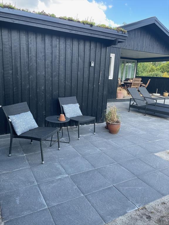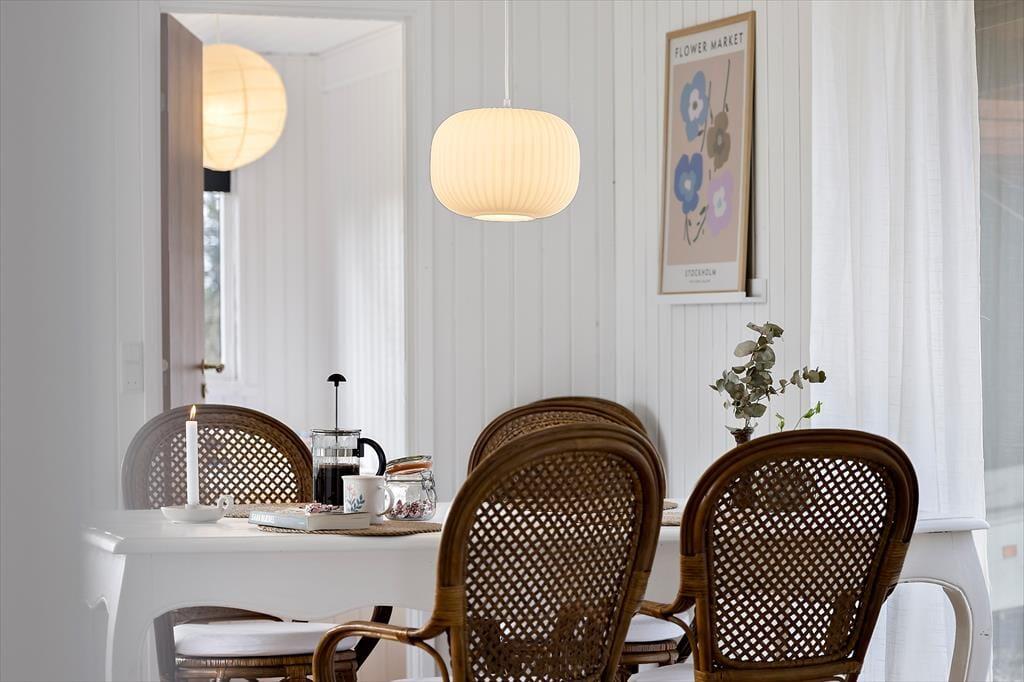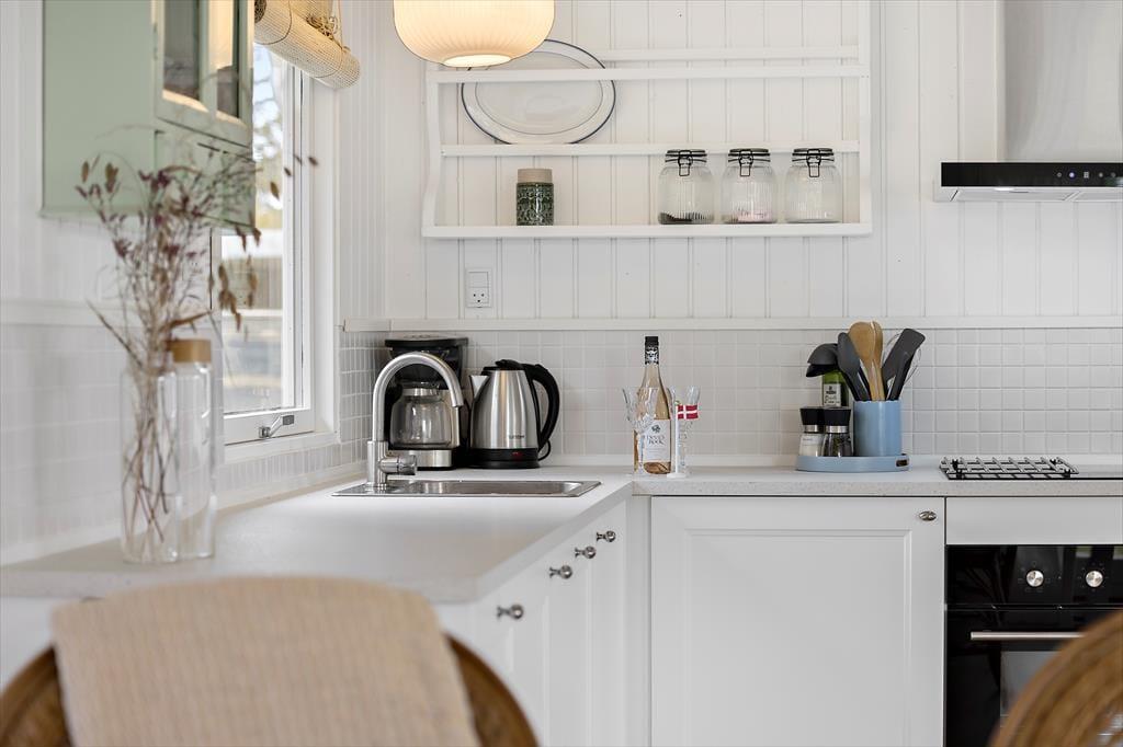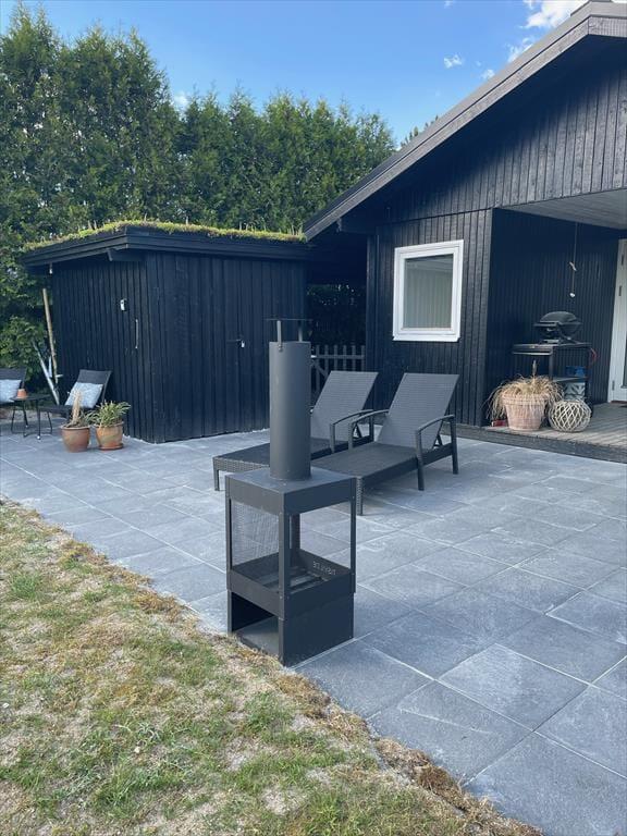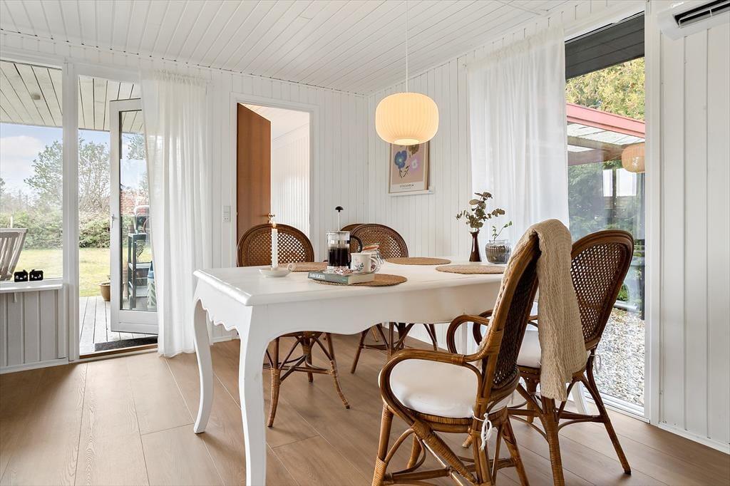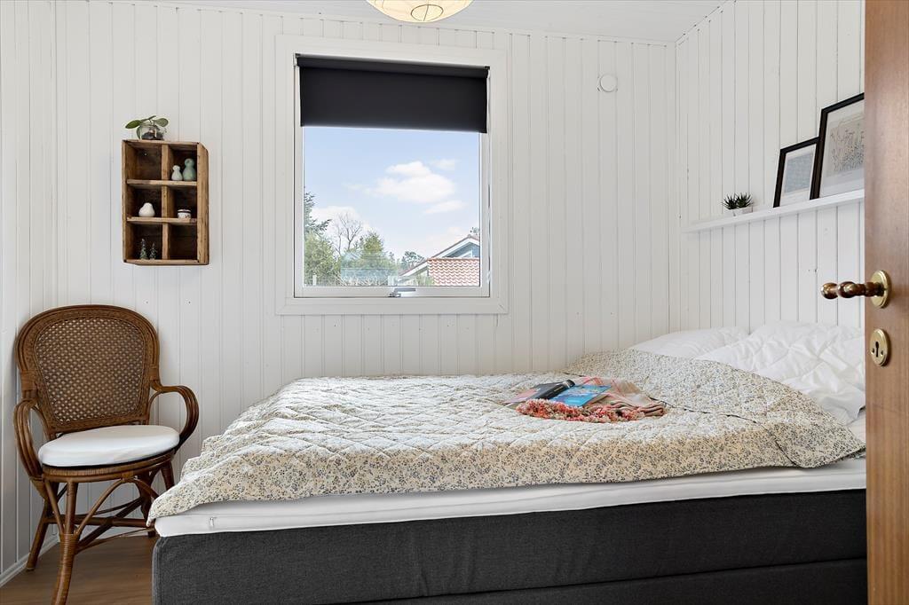Et hyggeligt sommerhus, hvor feriestemningen både ude og inde er tydelig. Stuen er åben og indbydende, forbundet til køkkenet. Her kan du slappe af foran og nyde det skønne lysindfald fra haven. Hvad med at samle familien til et brætspil eller et godt måltid? Fra stuen er der direkte adgang til den hyggelige overdækkede terrasse, som forlænger sommermånederne. Sommerhuset rummer desuden tre gode værelser og et fint badeværelse.
