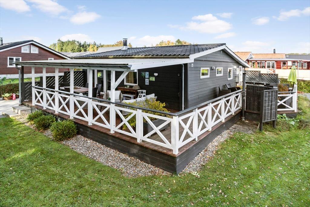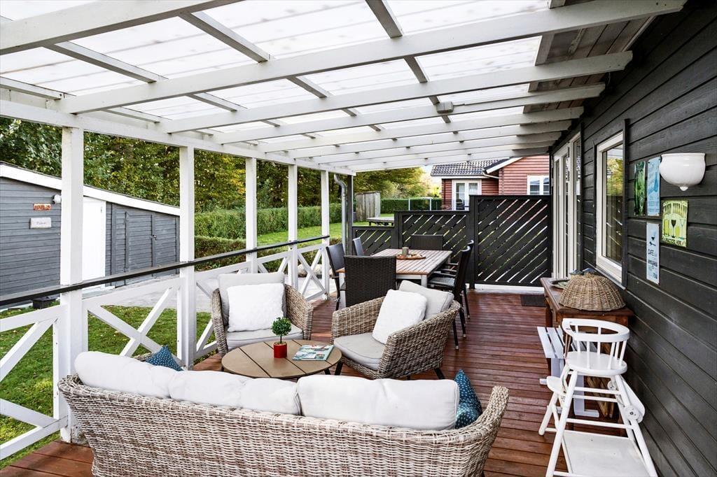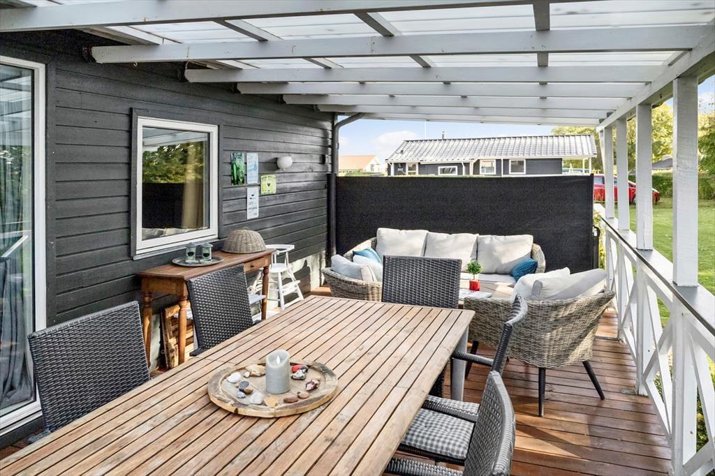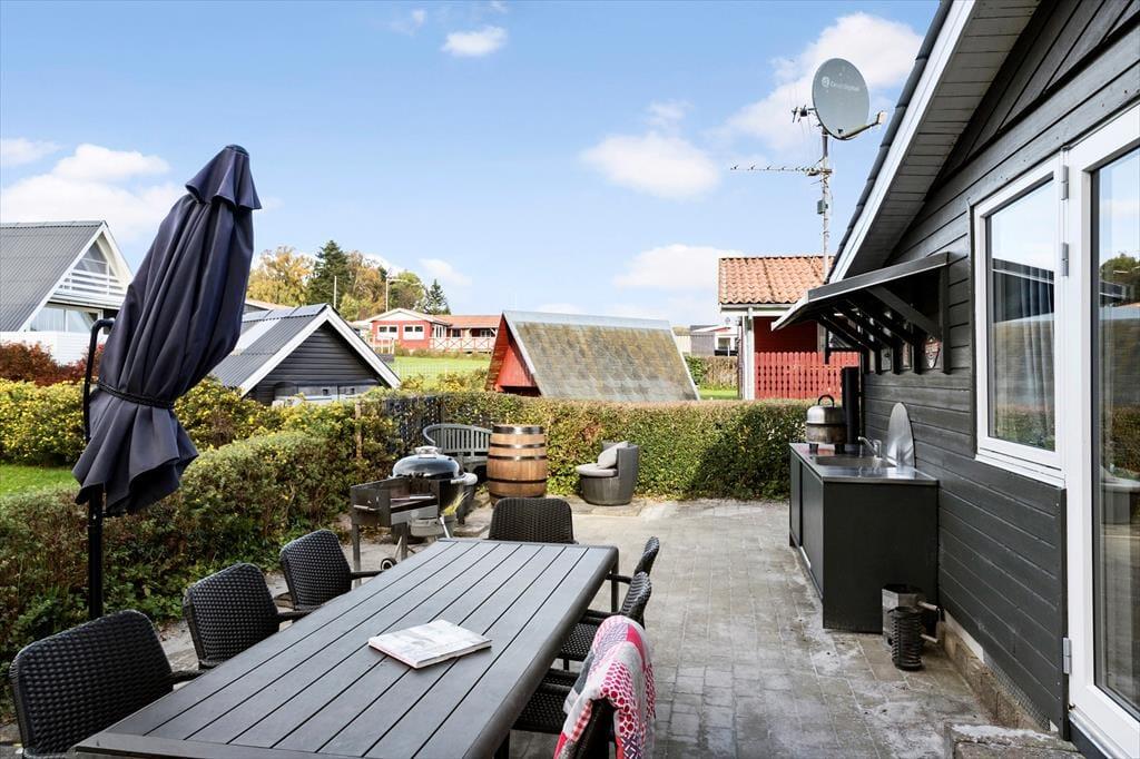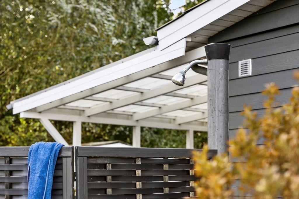 Udendørsområdet byder på en dejlig overdækket terrasse, hvor du kan nyde den fantastiske ro. Den rummelige have med en stor græsplæne er ideel til leg, spil og solbadning. Slap af i de komfortable solstole og nyd roen. Fra terrassen kan du beundre udsigten over sommerhusområdet med et lille havkig. Ved ankomst kan du parkere bilen i indkørslen, der ligger lige op ad huset, så du nemt kan komme tørskoet indenfor. Her er der masser af plads til at nyde livet og den friske luft i fulde drag.
