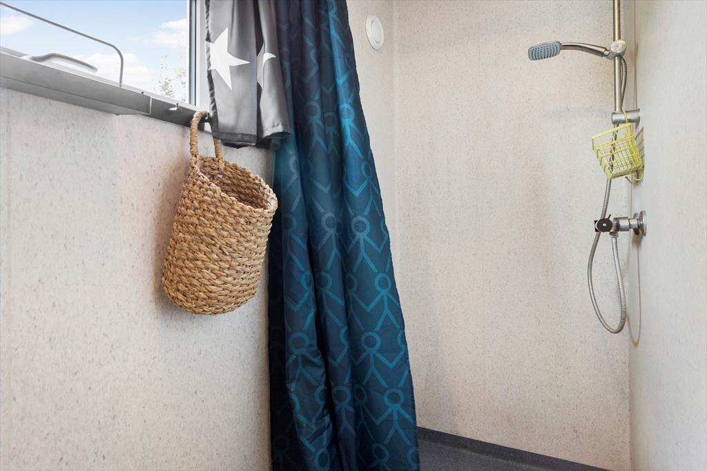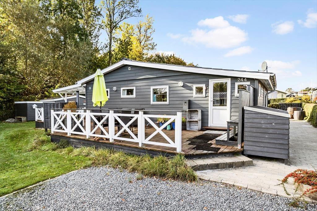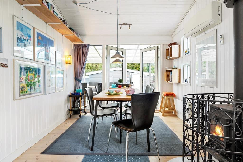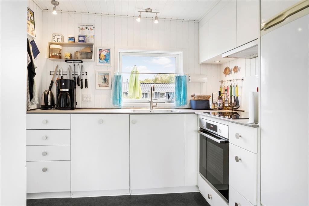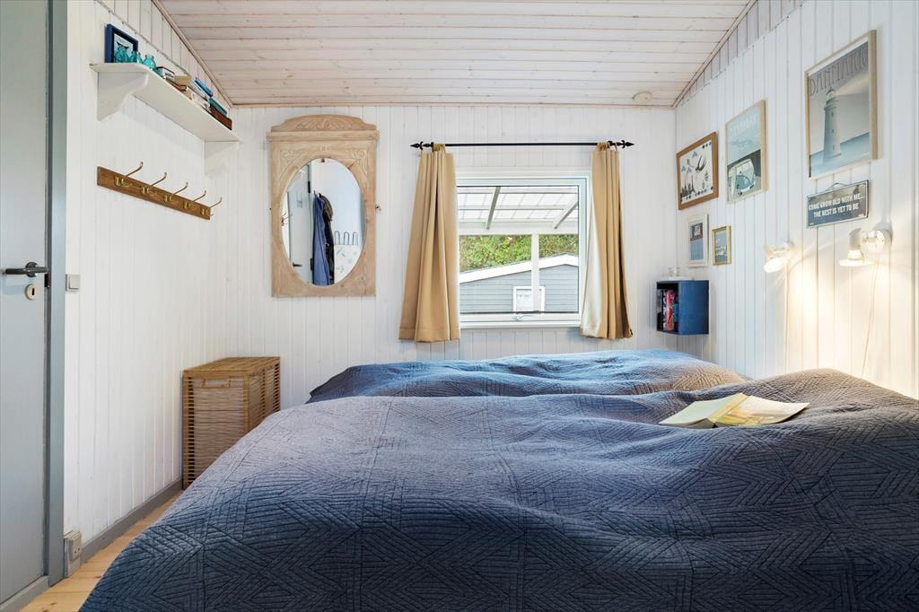 Udendørsområdet byder på en dejlig overdækket terrasse, hvor du kan nyde den fantastiske ro. Den rummelige have med en stor græsplæne er ideel til leg, spil og solbadning. Slap af i de komfortable solstole og nyd roen. Fra terrassen kan du beundre udsigten over sommerhusområdet med et lille havkig. Ved ankomst kan du parkere bilen i indkørslen, der ligger lige op ad huset, så du nemt kan komme tørskoet indenfor. Her er der masser af plads til at nyde livet og den friske luft i fulde drag.