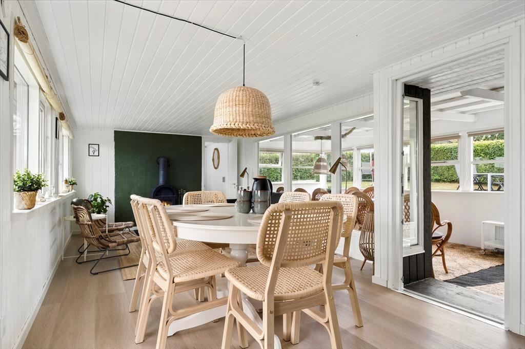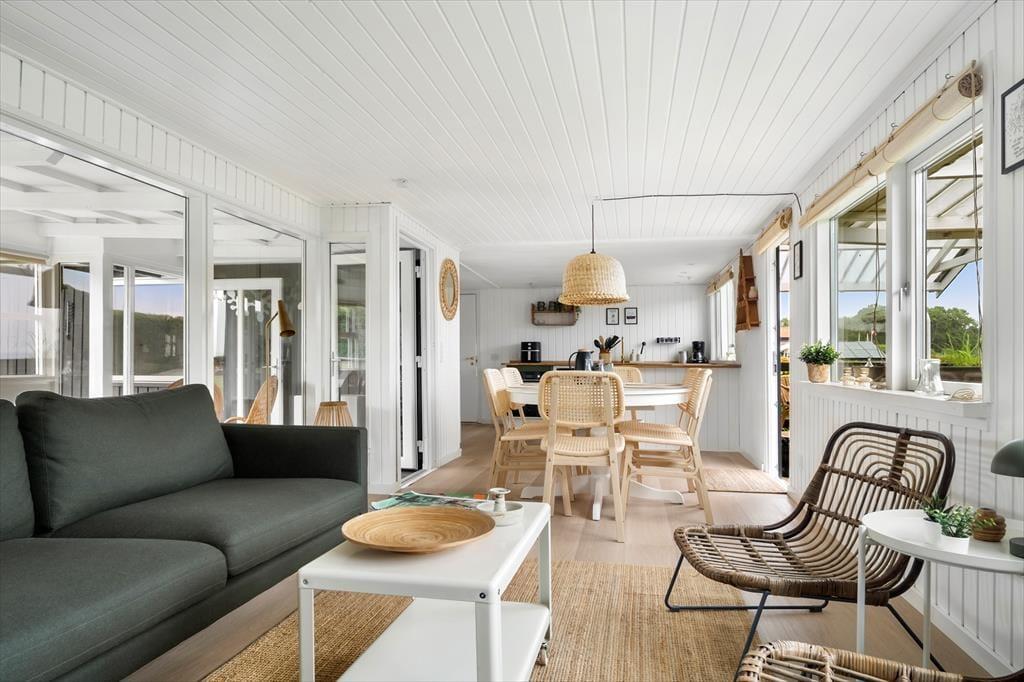 Stuen indbyder til hygge med både spiseplads og et indbydende sofahjørne, hvor I kan synke ned med en god bog, nyde en brætspilsaften eller bare lade samtalen flyde. Herfra er der direkte udgang til terrassen – og det bedste af det hele: udsigten til havet.