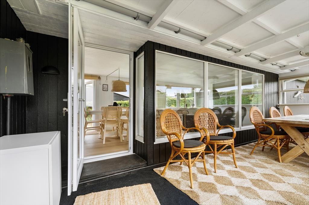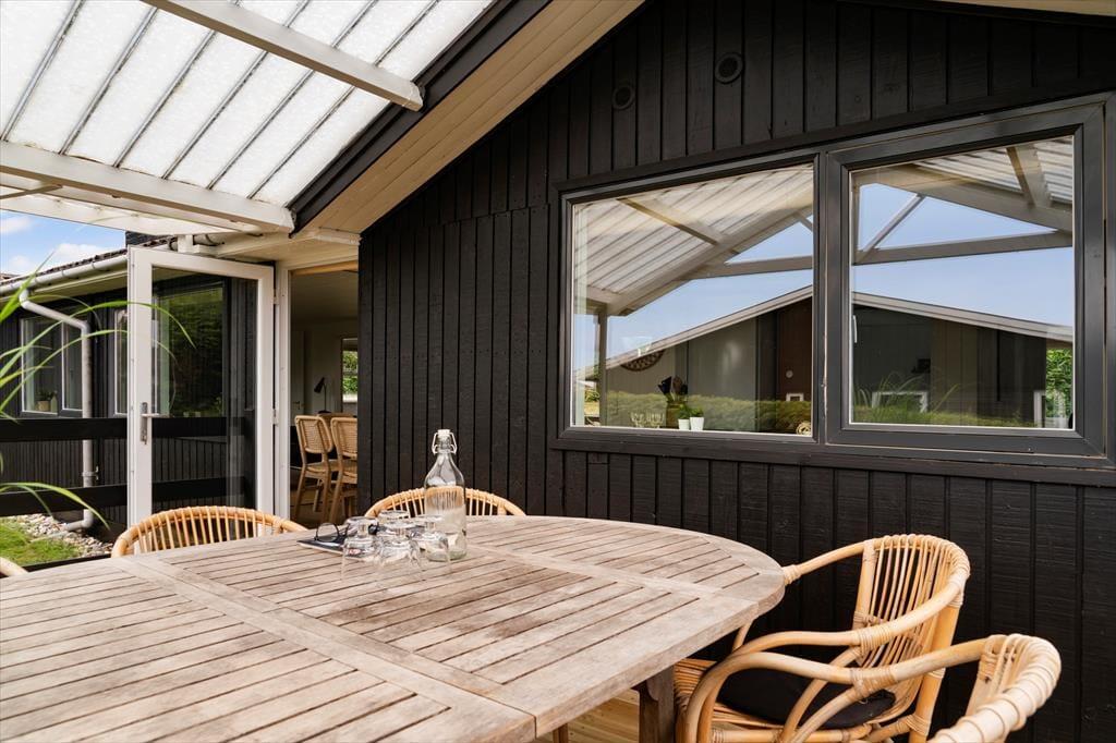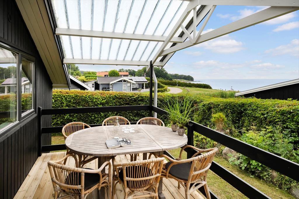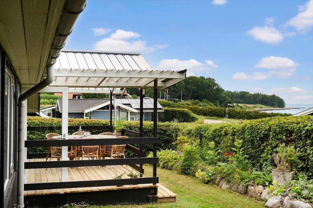 Tilbage ved huset venter en grøn og hyggelig have samt en rummelig terrasse med gode havemøbler. Den overdækkede del af terrassen vender mod havet, så I kan sidde i læ og nyde både udsigten og stilheden – fra morgenkaffen i de første solstråler til grillmiddage i de lange sommeraftener. Det er her, ferien leves i fulde drag.