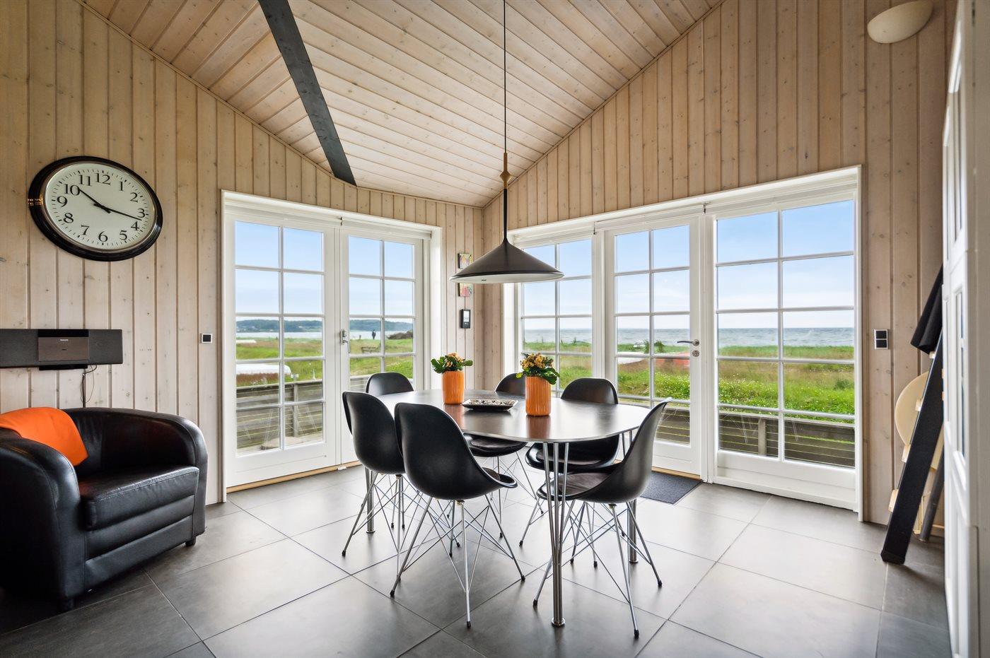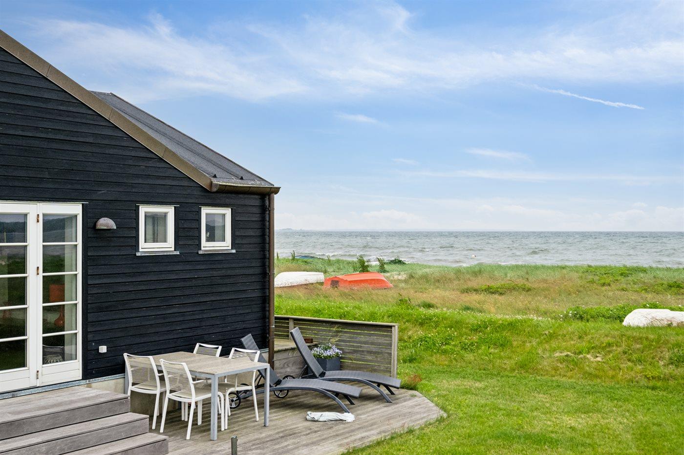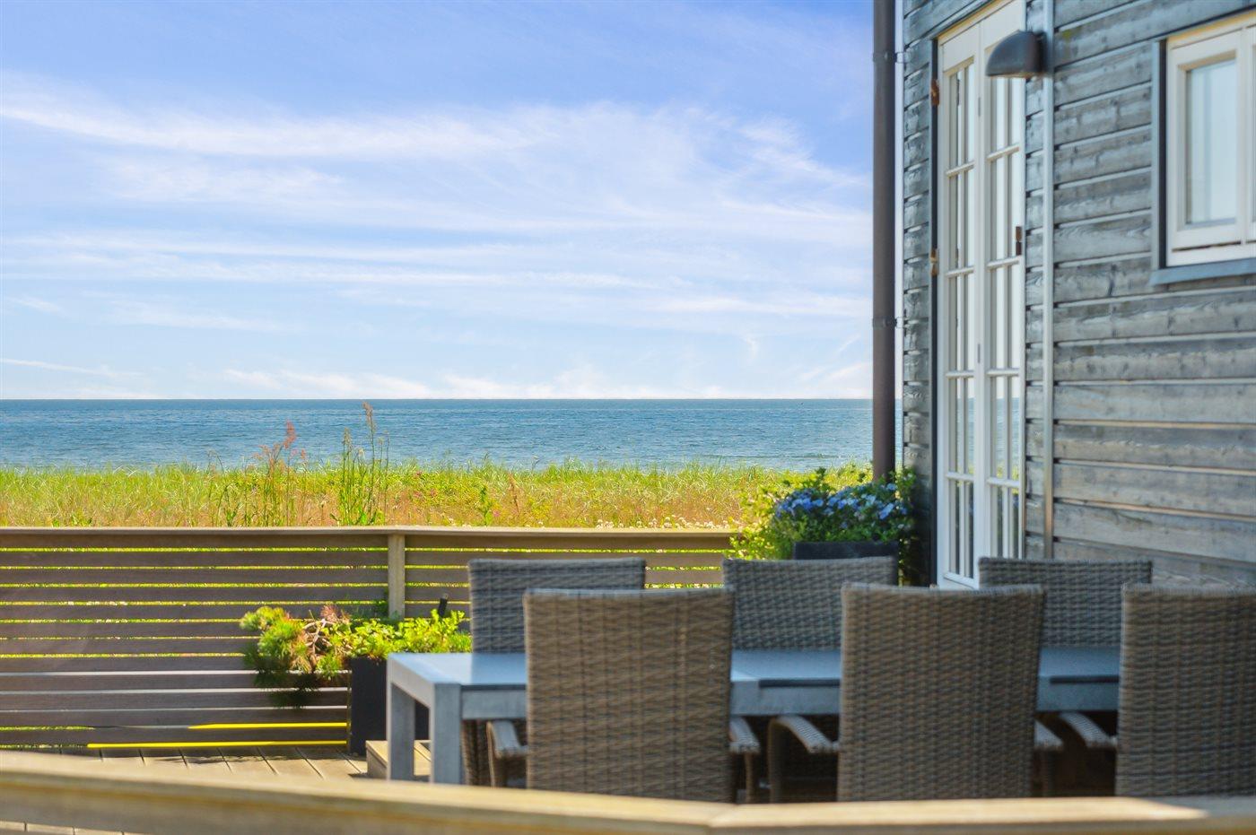 Der er 180 graders panoramaudsigt over vandet og det er svært, at løsrive sig fra dette syn. Dette gælder både fra det skønne terrasseareal, som går hele vejen rundt om huset og hvor der således altid er mulighed at finde en plads med læ, eller inde fra sommerhuset – her er der tale om en ganske særlig oplevelse.