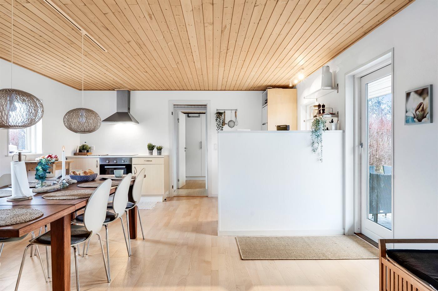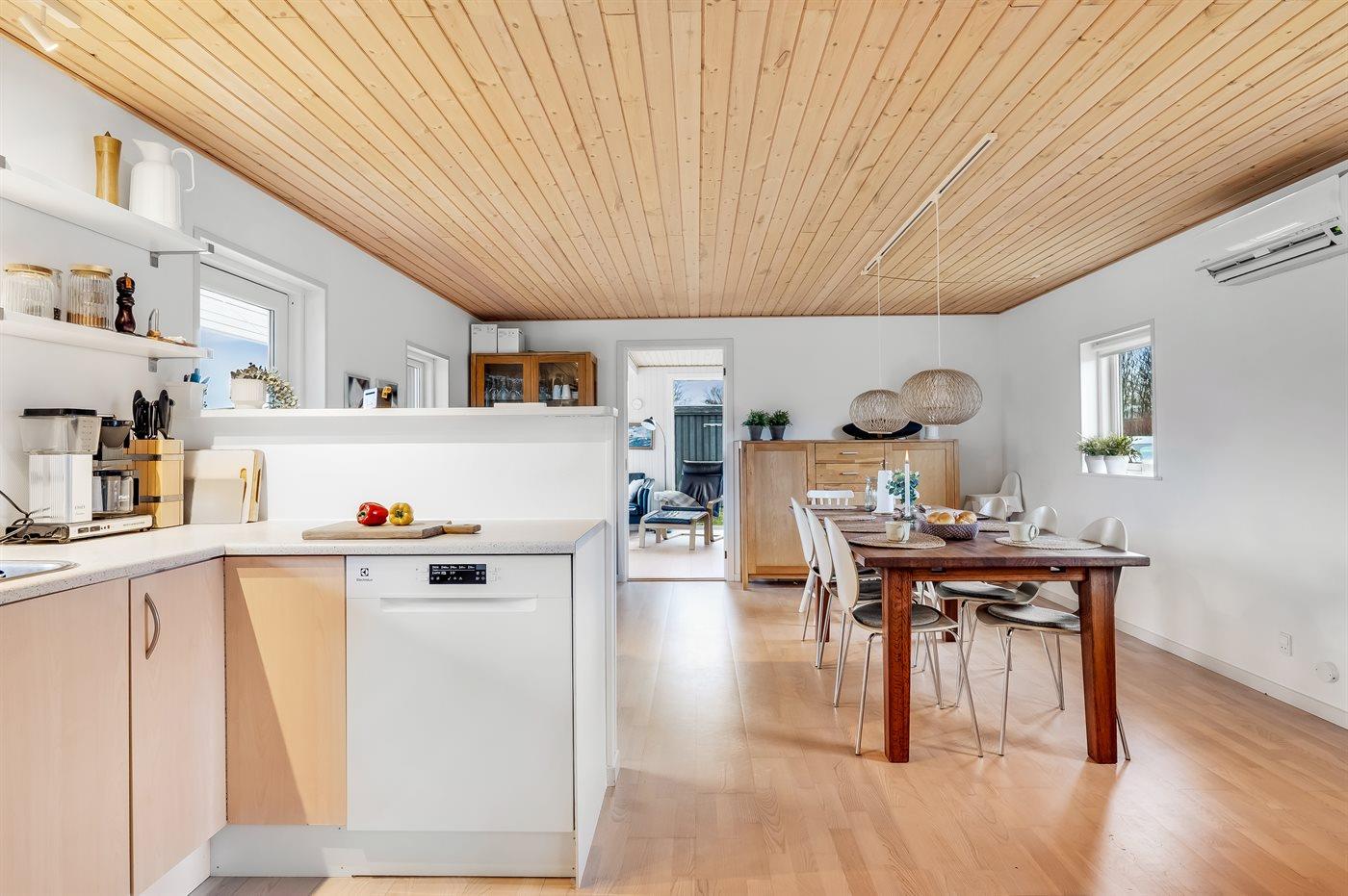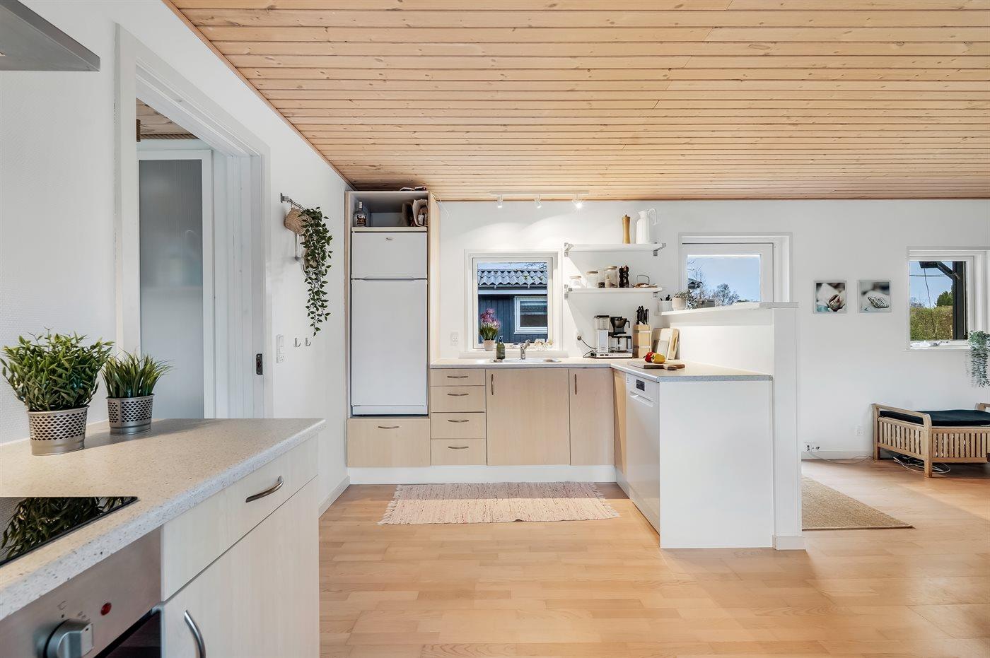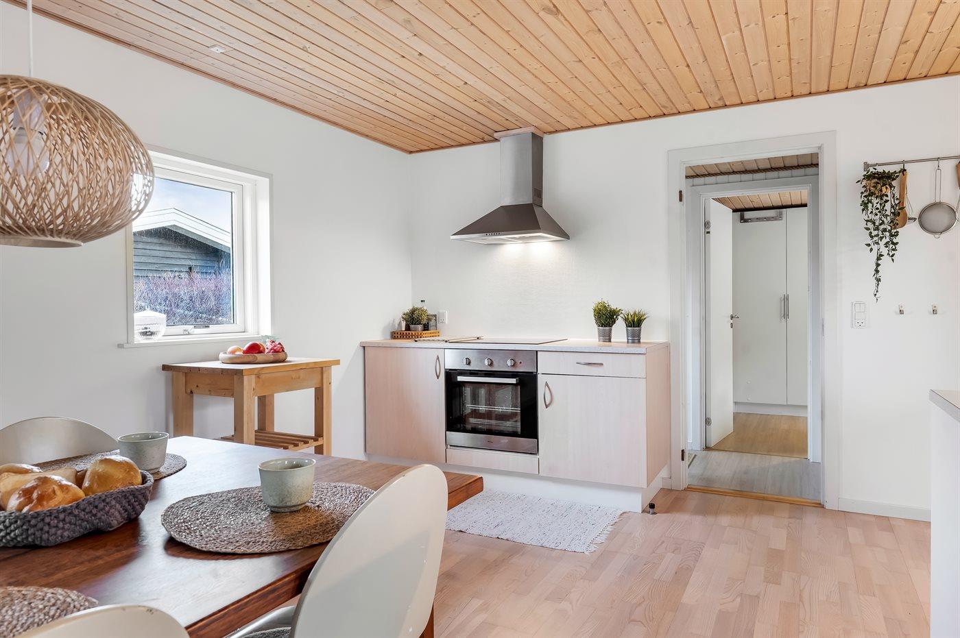 Køkkenet er udstyret med 1 køleskab. Der er 4 induktionskogeplader, varmluftovn samt opvaskemaskine.