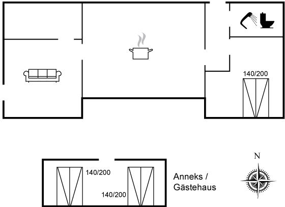 Der er i alt 2 soveværelser. Sovepladserne fordeler sig på: 6 sovepladser i dobbeltsenge. 4 af disse sovepladser befinder sig i anneks. Derudover er der 1 stk. barneseng.