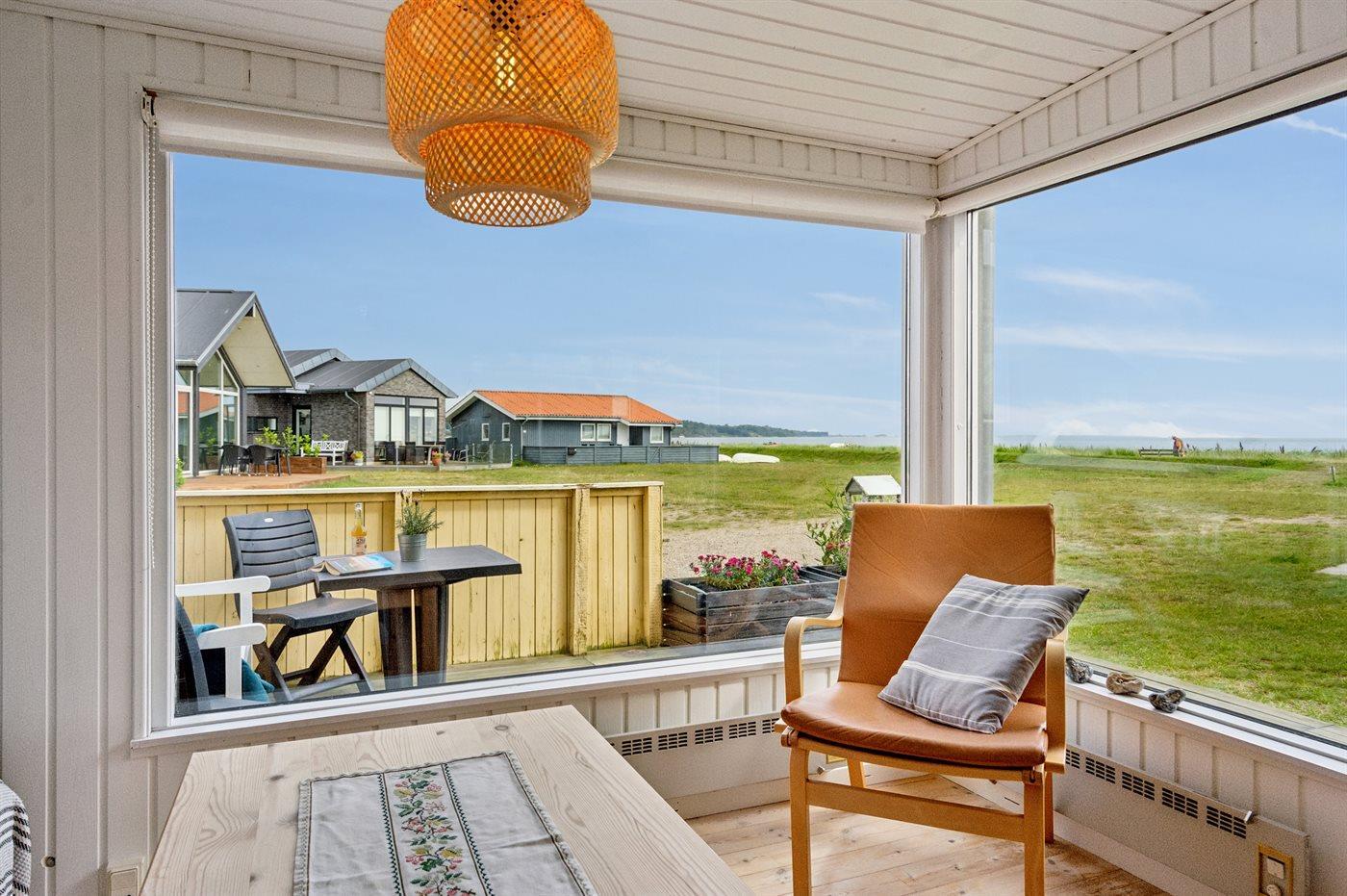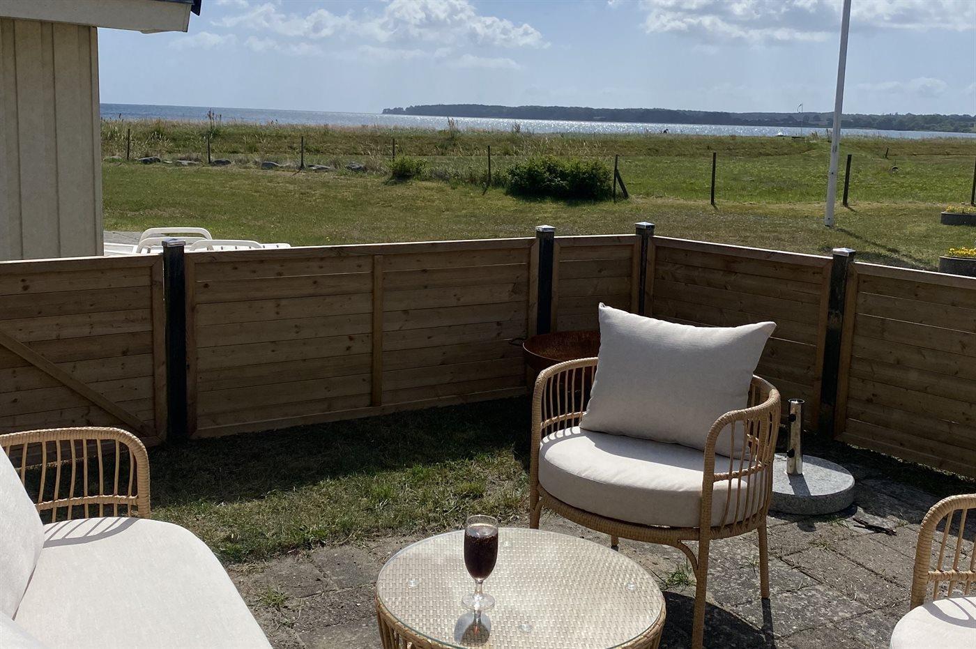 Både inde fra huset såvel som udenfor er der en flot udsigt over vandet, og det er svært at løsrive sig fra dette syn. Dette gælder også fra det skønne terrasseareal, som består af hyggelige terrassemiljøer på begge sider af huset og, hvor udsigten altid i er fokus. Det er således også altid muligt at finde en plads med læ, hvor man kan nyde en kop kaffe eller et glas vin.