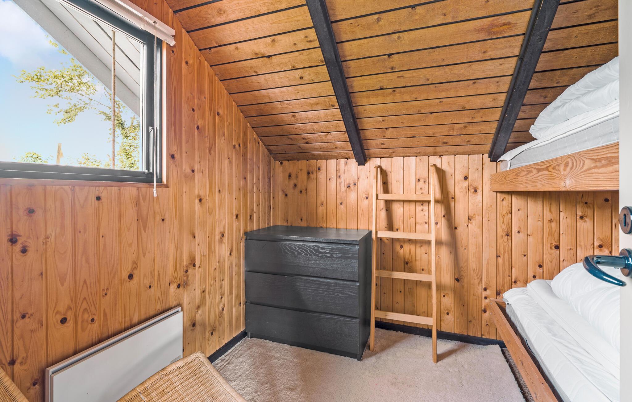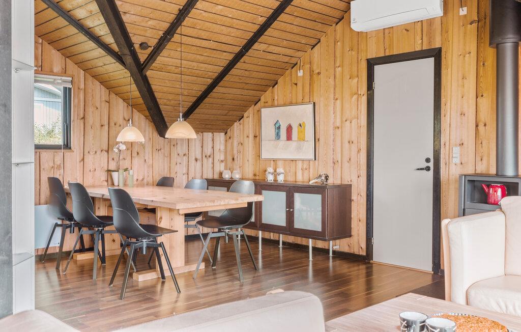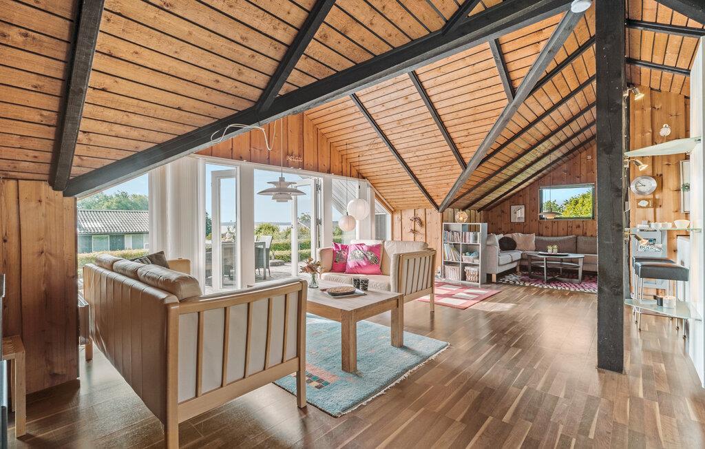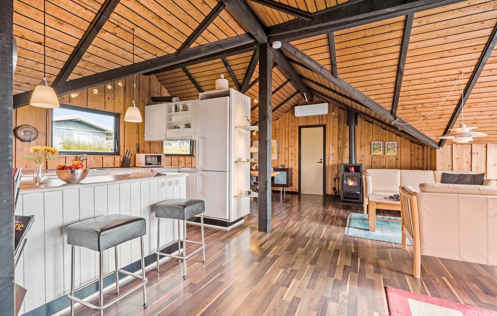 Der er lagt op til nogle fredfyldte feriedage i dette indbydende sommerhus, hvor I får optimale rammer til at tanke op og slappe af. Huset er skønt indrettet med et stort, centralt fællesrum, hvor I kan samles om måltiderne, brætspil og hver jeres egne sysler. Sæt jer med en kop kaffe på køkkenets barstole, læn jer tilbage med en god bog i sofaen eller sæt jer og nyd udsigten til rummets flotte træloft. Her sænker freden og roen sig automatisk.