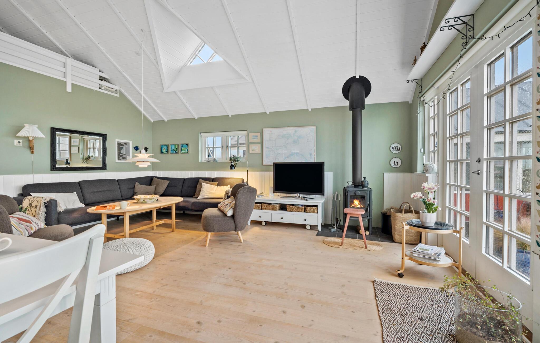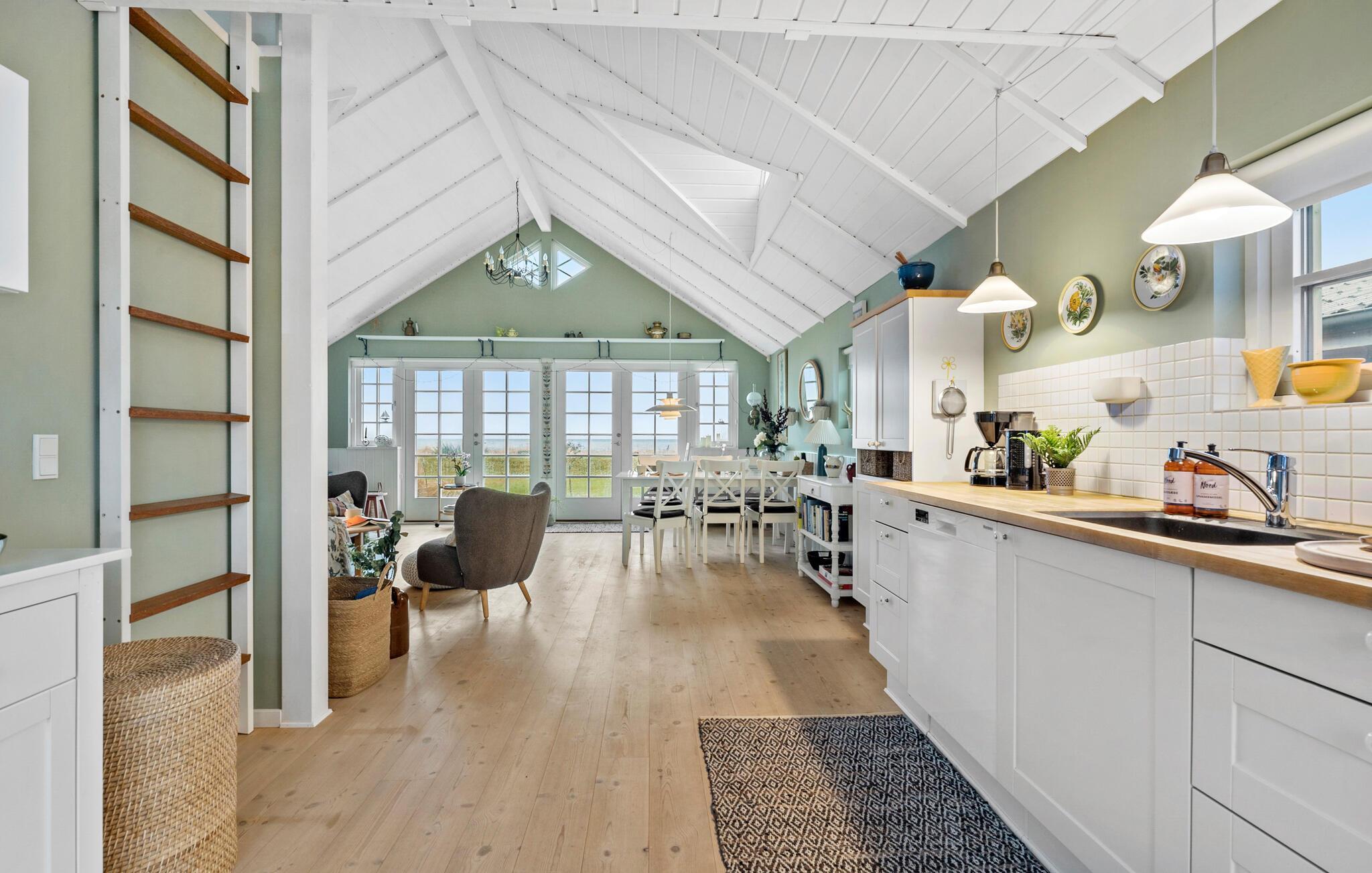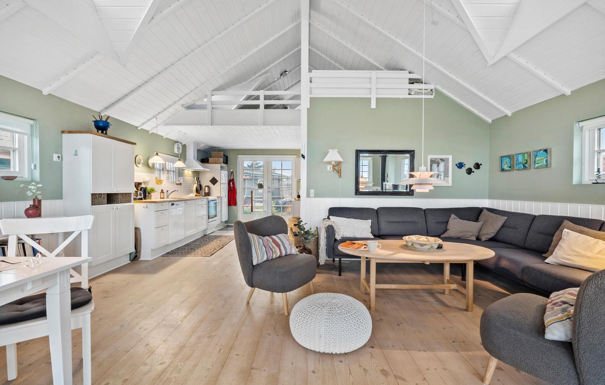 Velkommen til den indbydende atmosfære i det lyse interiør, hvor højt til loftet og smagfuld indretning skaber en ægte feel-good-stemning. Lav mad sammen i det moderne køkken, nyd hyggelige måltider i den hyggelige spiseplads og afslut aftenen med en film eller et spil brætspil i den stilfulde stue.