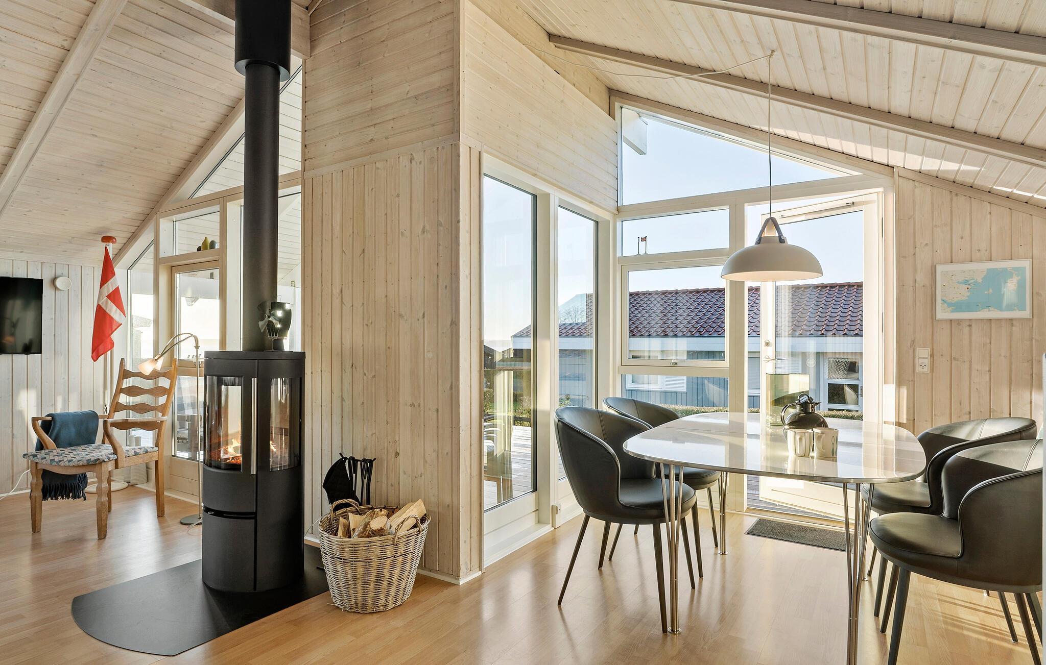 Velkommen til den hyggelige atmosfære i dette komfortable feriehus, hvor I kan se frem til en afslappende pause fra hverdagen. Forkæl jer selv med afslappende stunder i spabadet eller saunaen, nyd dagens måltider i den stilfulde spisestue og glæd jer til hyggelige madlavningsaftener i det indbydende køkken. Brændeovnen spreder ekstra hygge og varme om aftenen, når I har sat jer til rette i sofaen og hygger med brætspil eller en god feriekrimi.