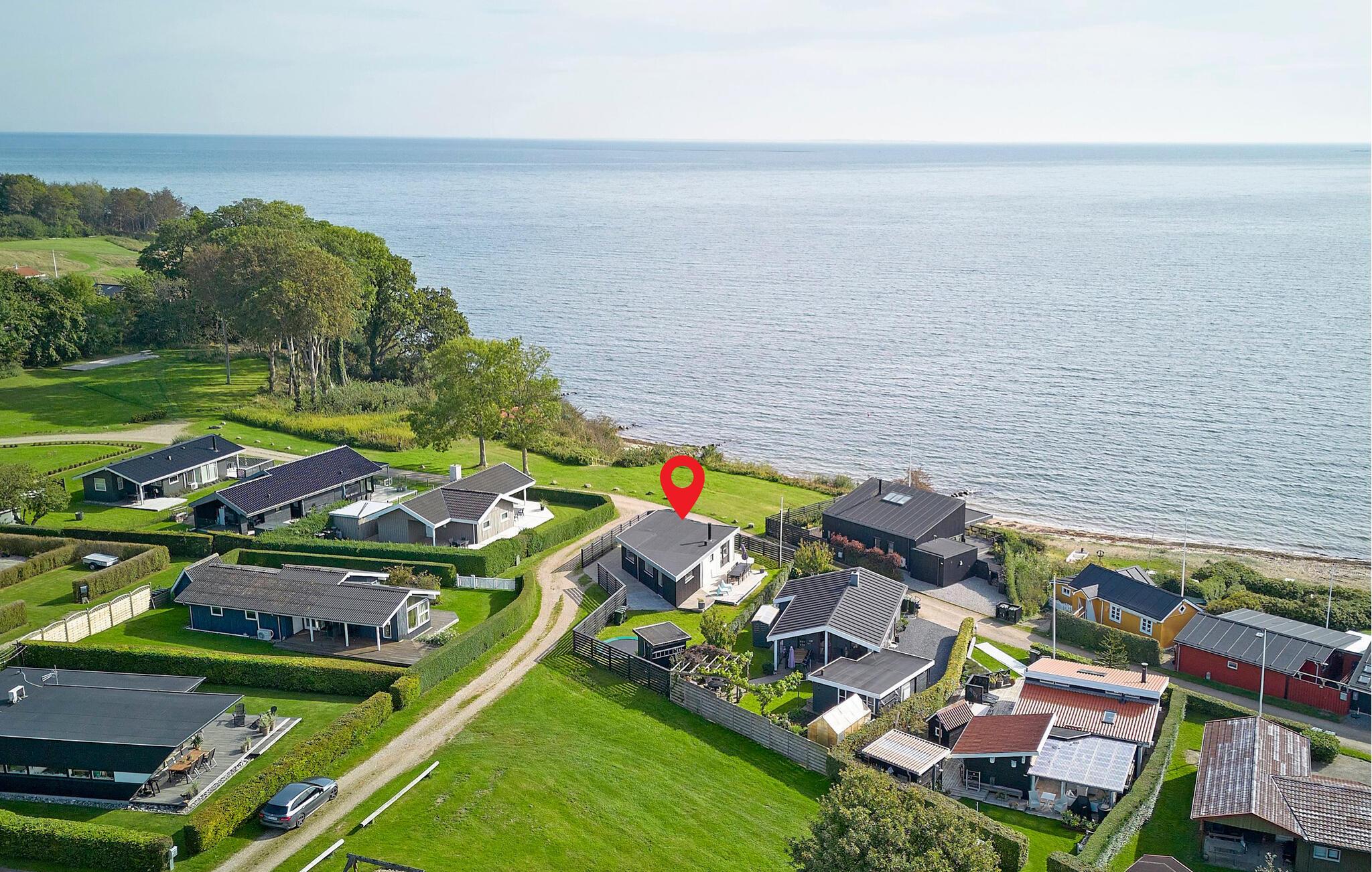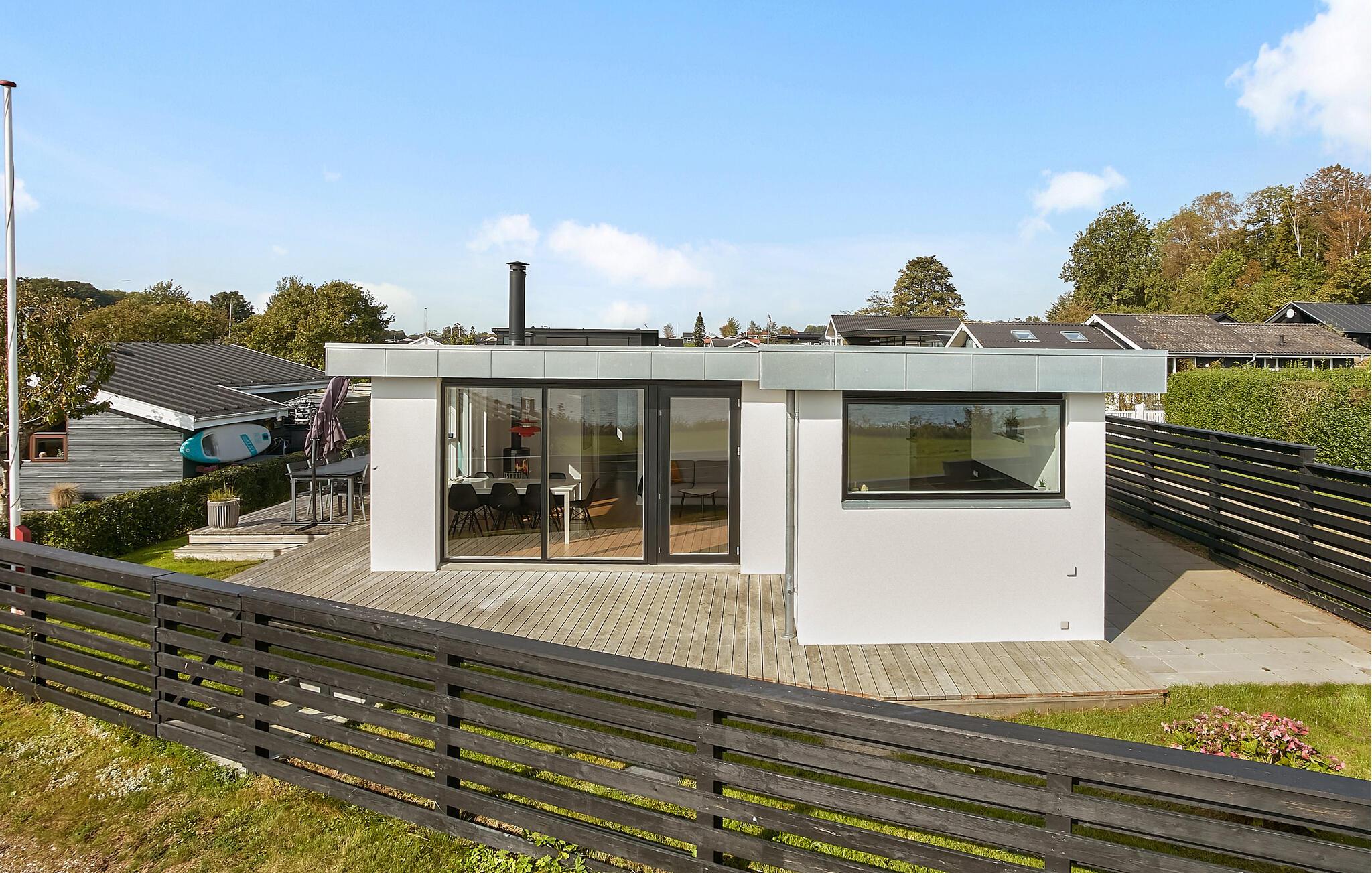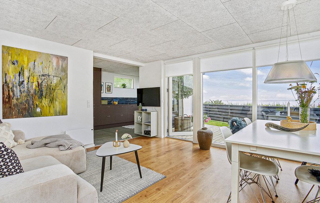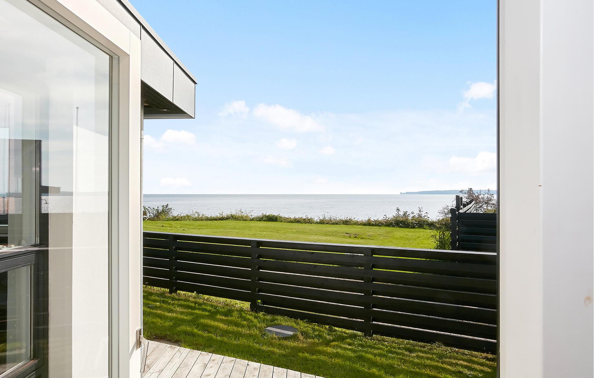 Stilfuldt feriehus med panoramaudsigt over havet og moderne skandinavisk design ved Juelsminde.