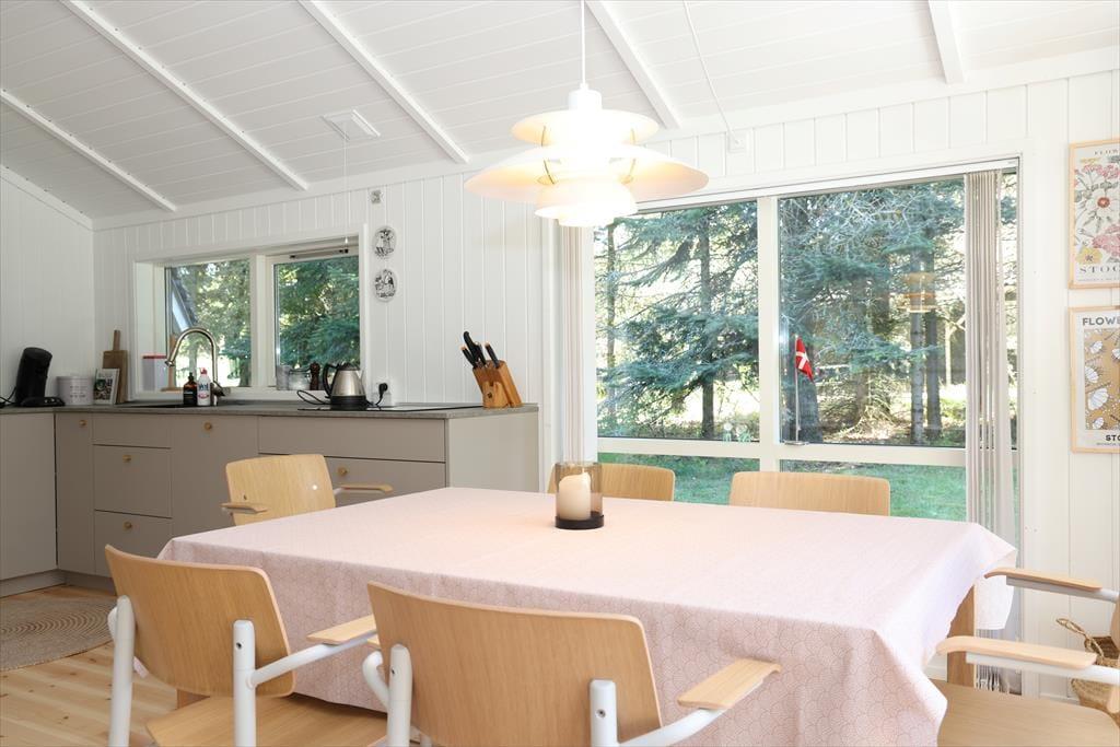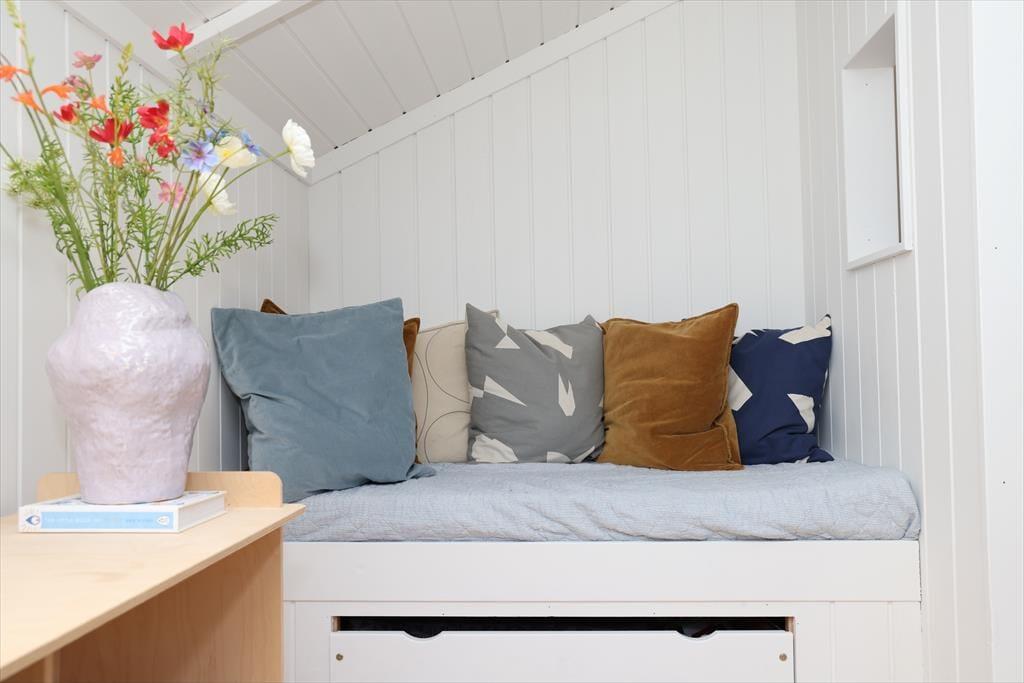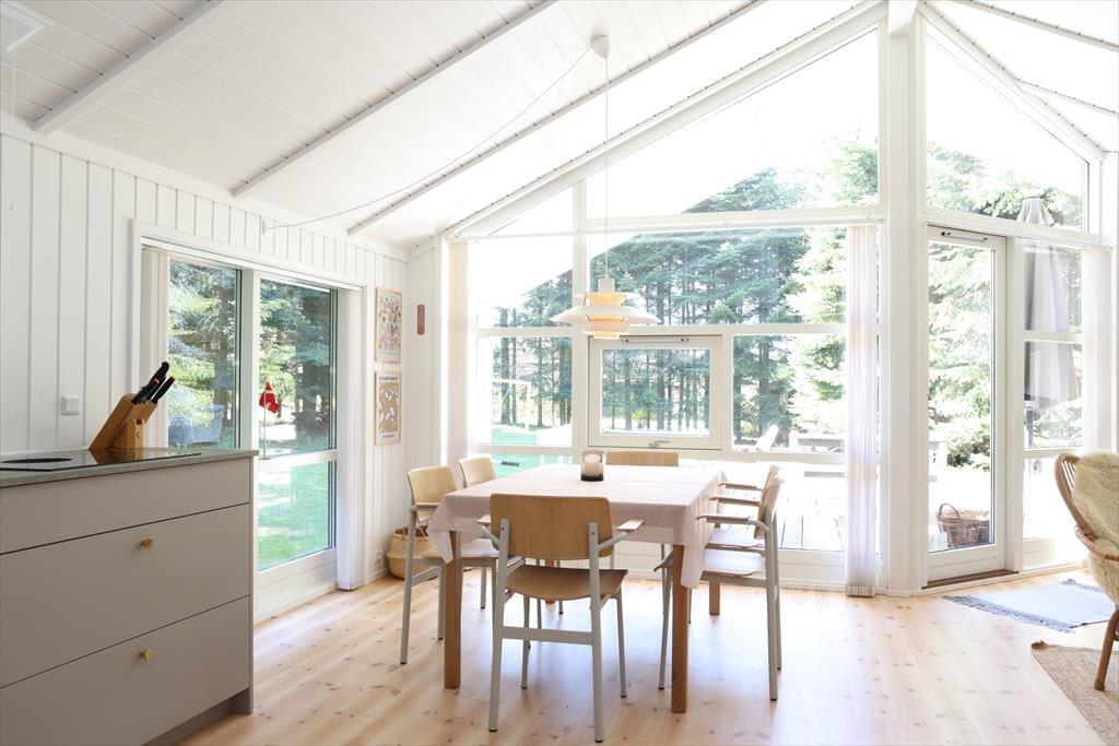 Den lyse og rummelige stue med loft til kip har vinduer på alle sider, så du fra det åbne køkken kan følge med både indendørs og udendørs, mens du sætter morgenkaffen over. Ved spisebordet kan I indtage morgenmaden og senere på dagen sidde og spille et spil. I den bløde sofa eller alkoven ved siden af kan du slappe af med en god bog. Har I været på en god travetur langs stranden, er det rart med en tur i sauna og spabad.