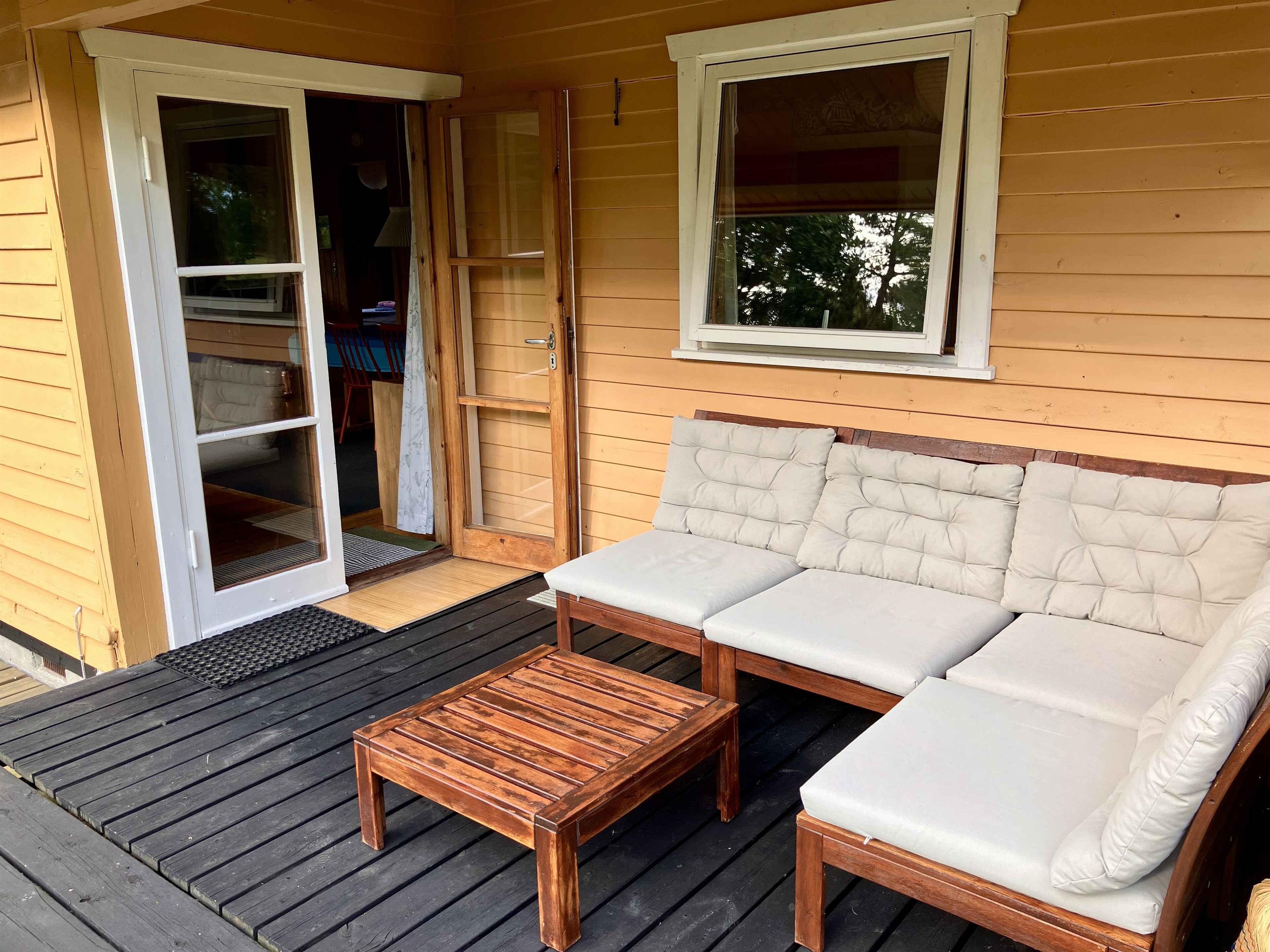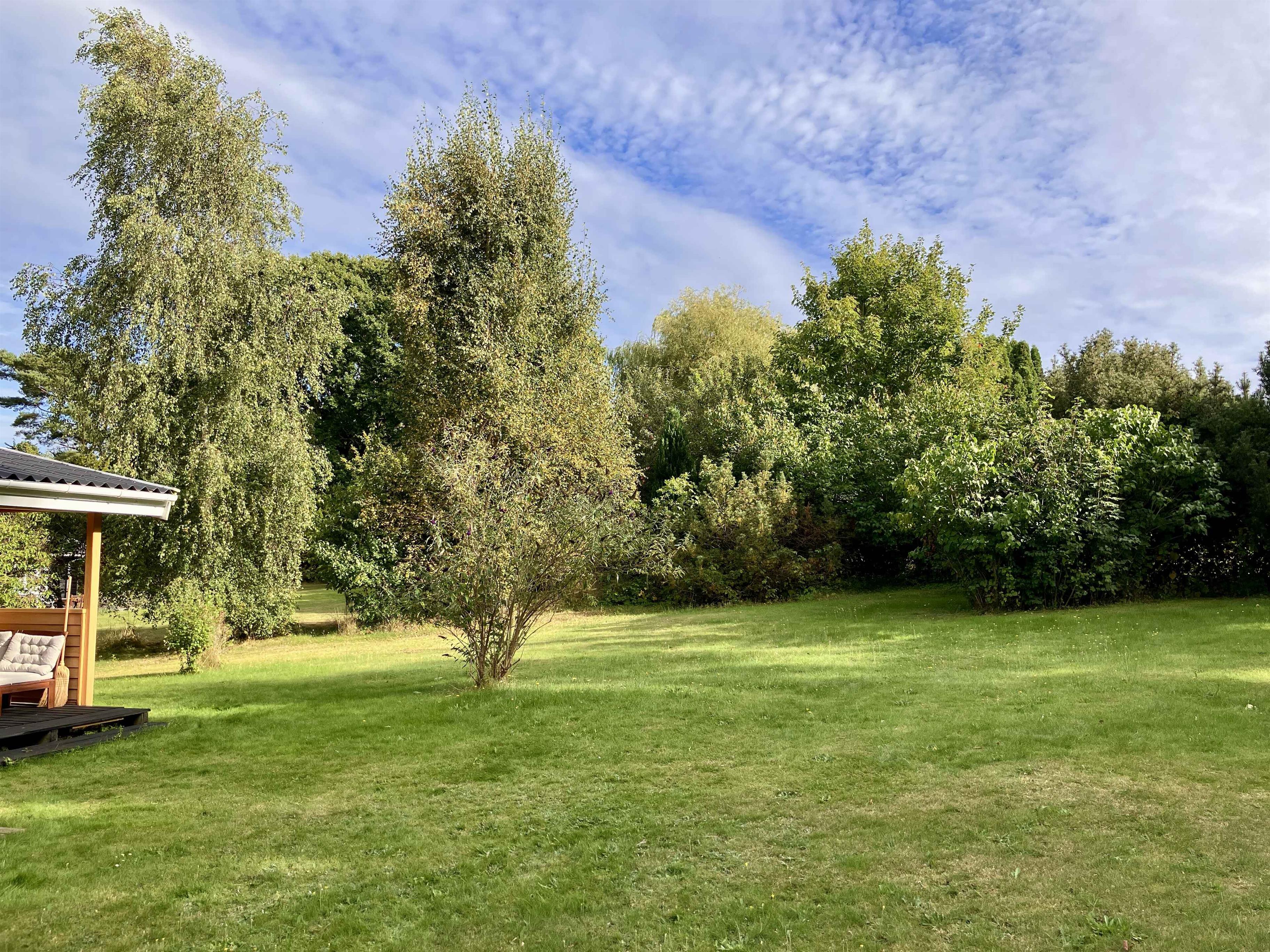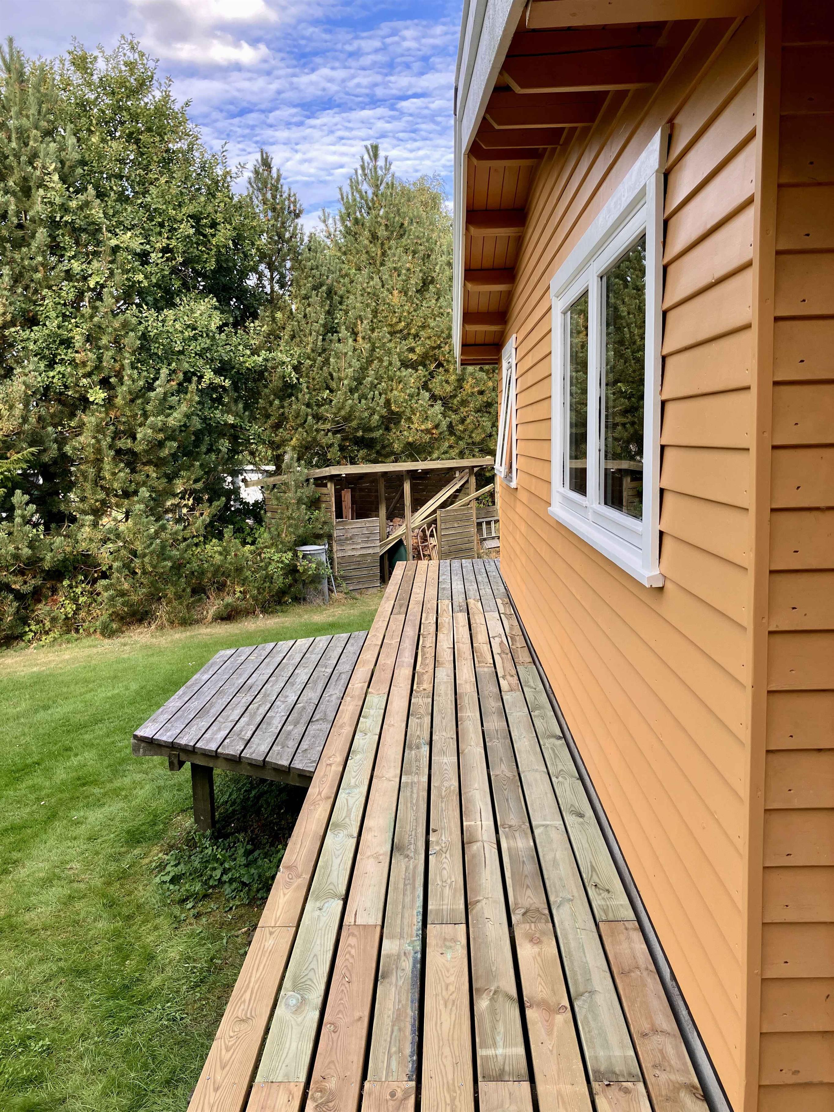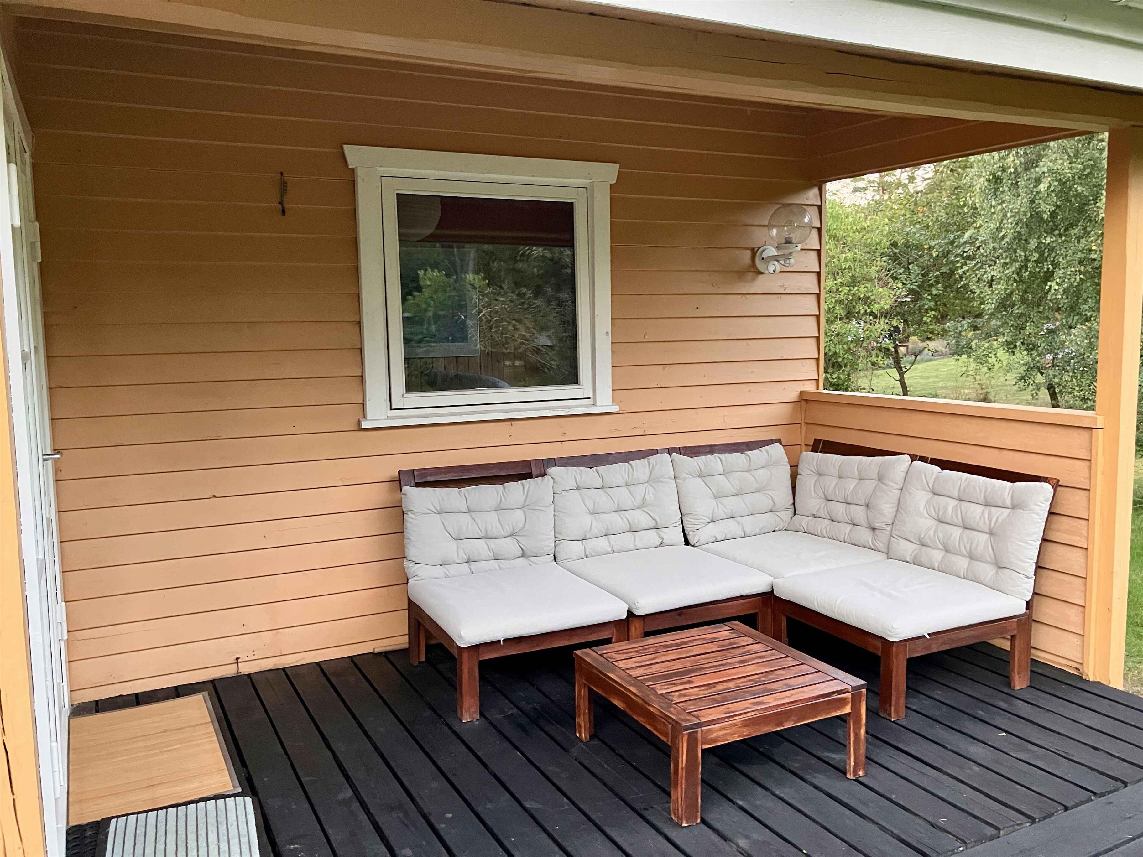 Solhi er et charmerende træsommerhus nær strand og skov med stor have, terrasser og moderne faciliteter.