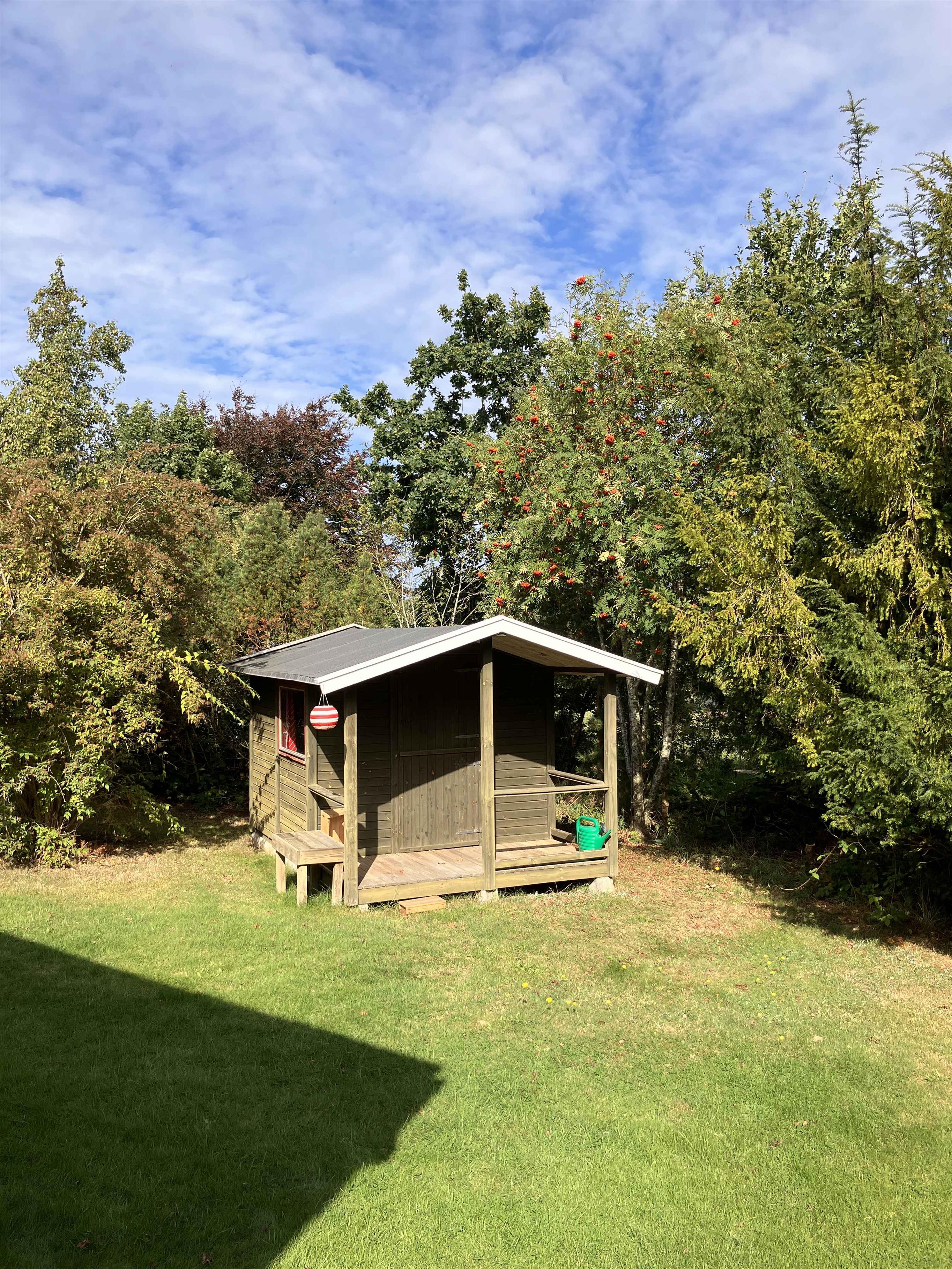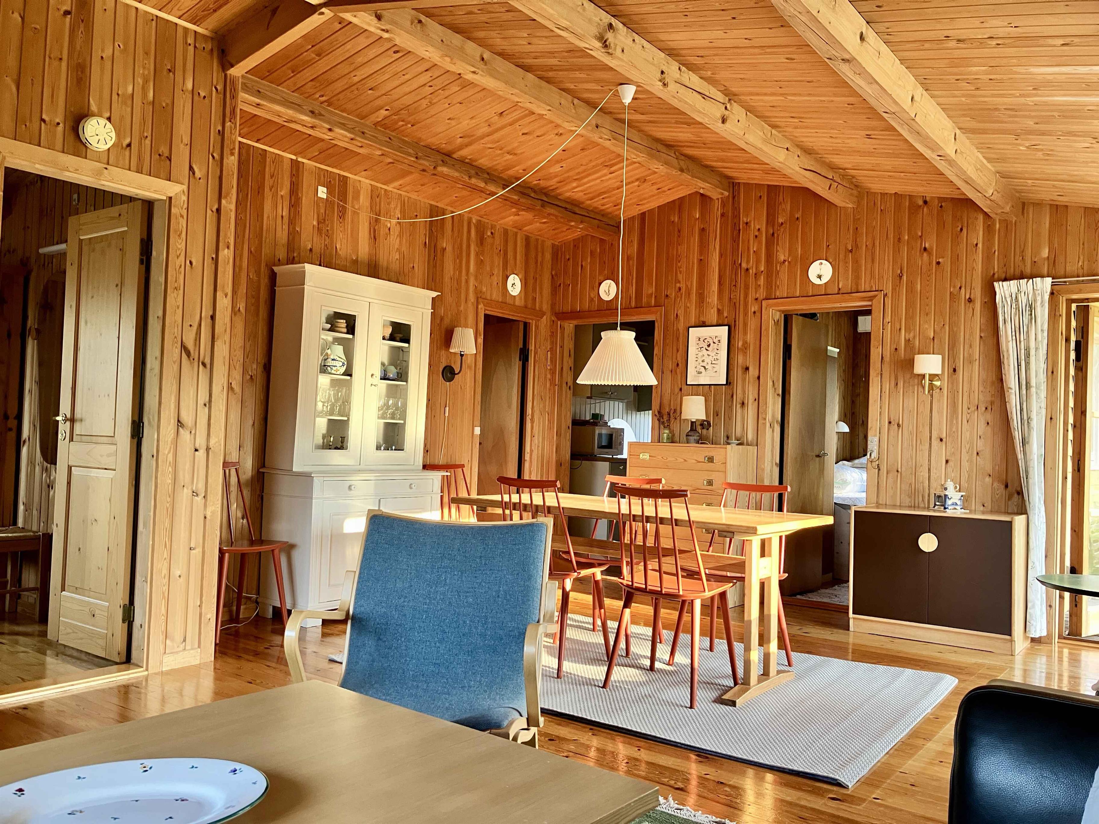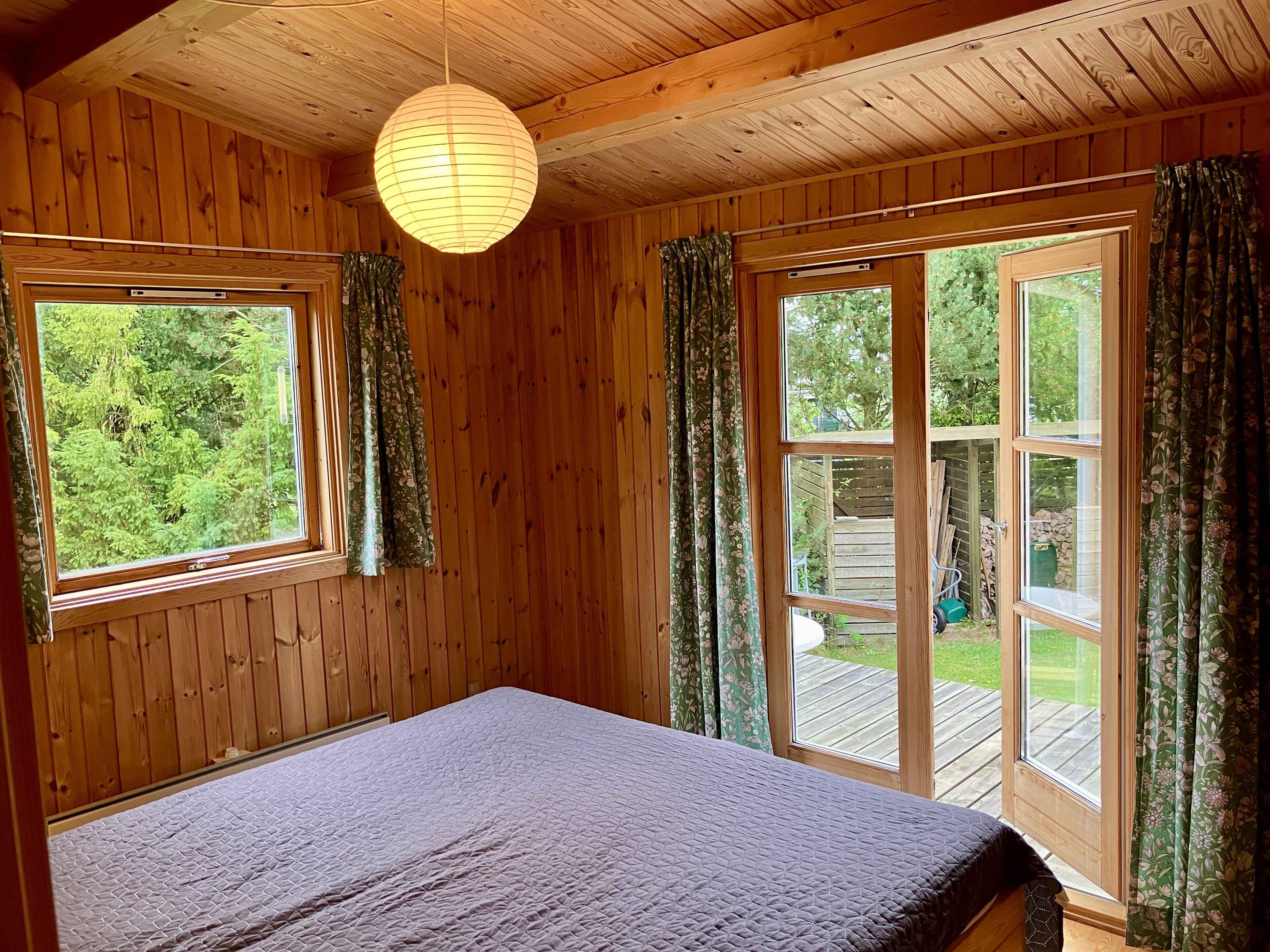 Solhi er et charmerende træsommerhus nær strand og skov med stor have, terrasser og moderne faciliteter.