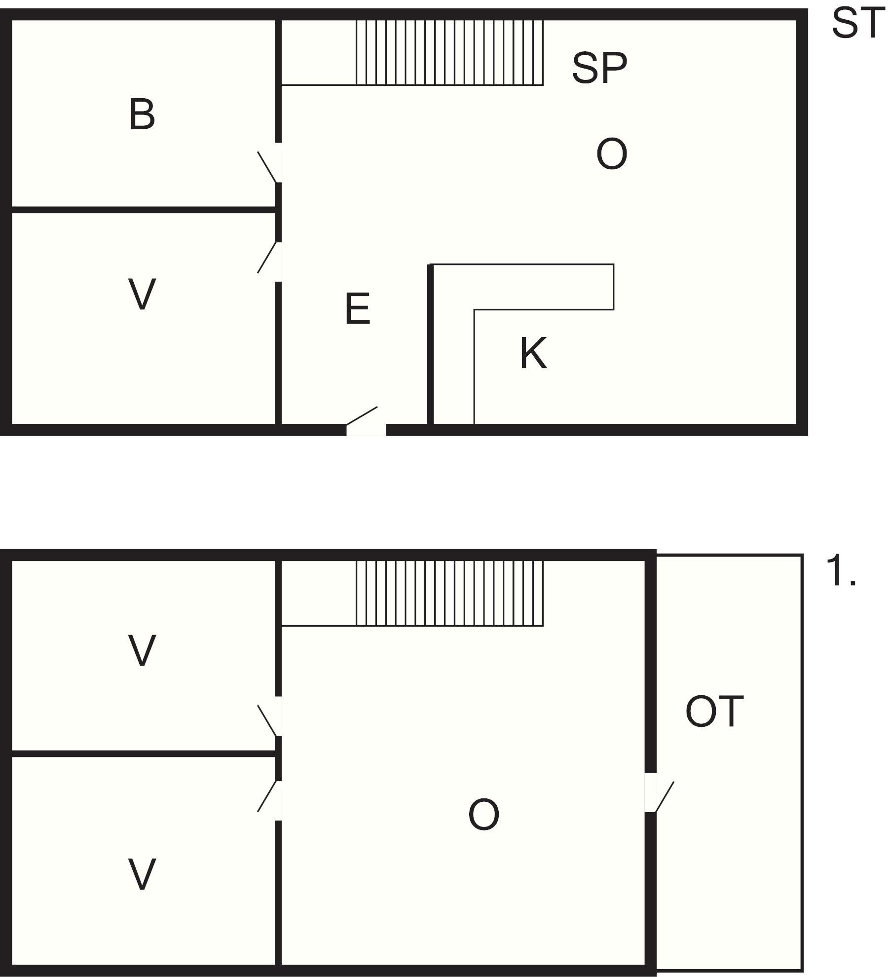 I stueetagen er der åbent køkken i forbindelse med spise og opholdsstue. Bad og toiletrum, samt soverum med dobbelt seng.