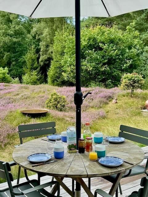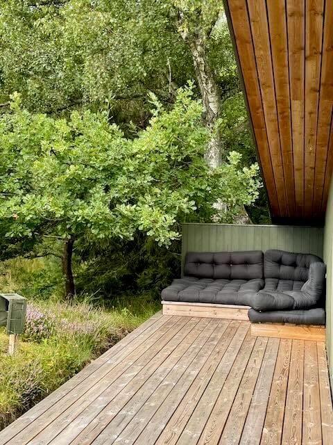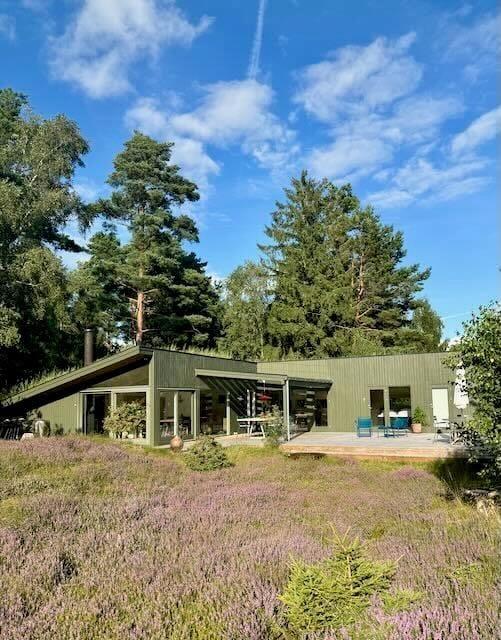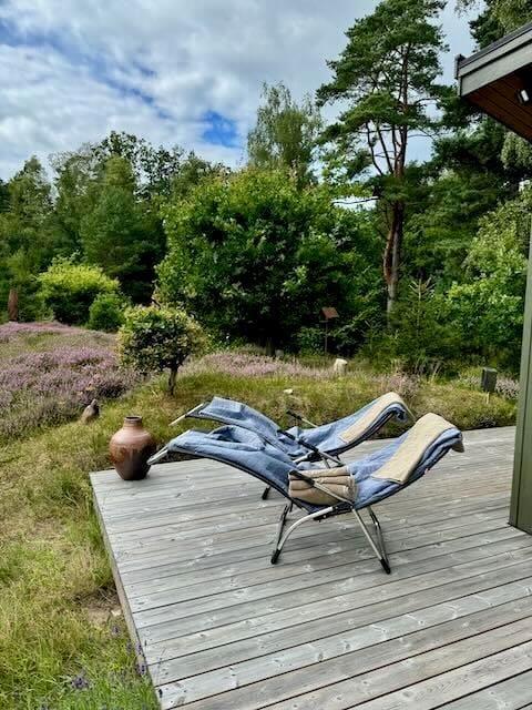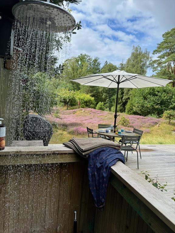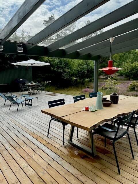 Udenfor venter en skøn naturgrund, hvor skovens dyr og fugle ofte kigger forbi. Sommerhusets terrasse er det oplagte sted at nyde morgenkaffen, grille en lækker middag eller slappe af i solen. Her kan du også tage et forfriskende brusebad i den udendørs bruser på terrassen – perfekt efter en dag i naturen eller på stranden. Med den omgivende plantage lige uden for døren er der rig mulighed for at udforske naturen til fods eller på mountainbike. De høje træer og den friske luft skaber en perfekt ramme for familiehygge eller stille stunder med en god bog.