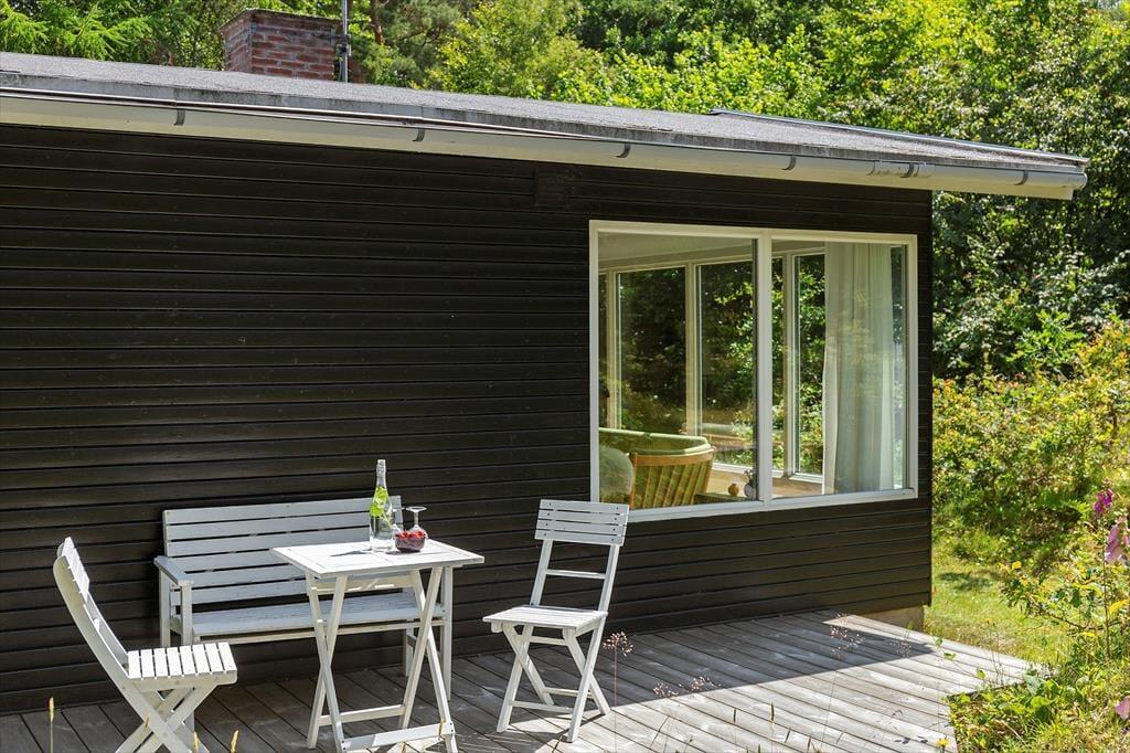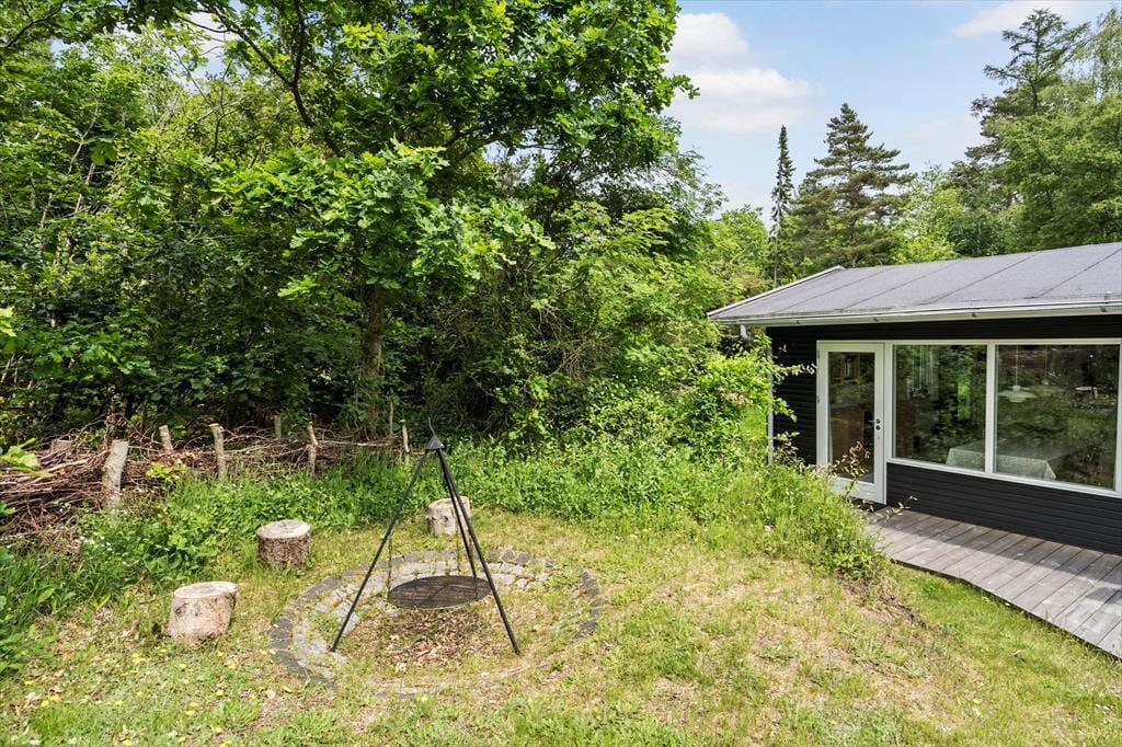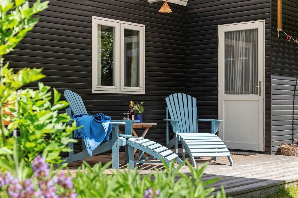 Sommerhusets store have er en fredfyldt oase, omgivet af træer, der giver læ og privatliv. Her kan børnene lege frit, mens du nyder en kop kaffe på terrassen. Den overdækkede terrasse er ideel til afslapning i skyggen på varme sommerdage eller til at samle familien til en hyggelig grillaften. Med havemøbler og masser af plads kan du lade roen sænke sig og virkelig nyde udelivet.