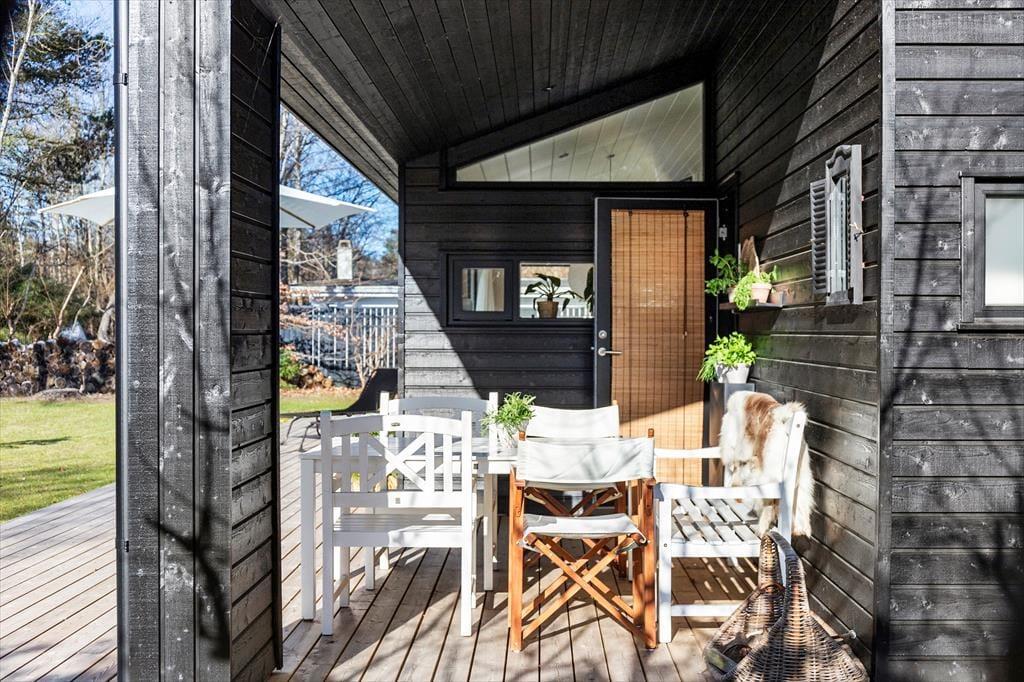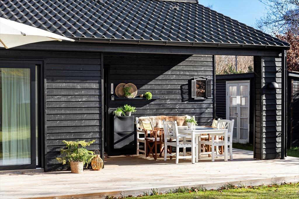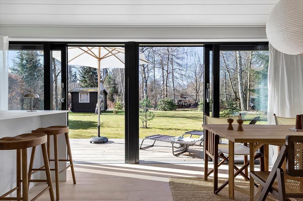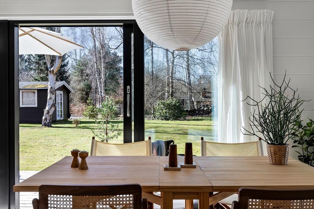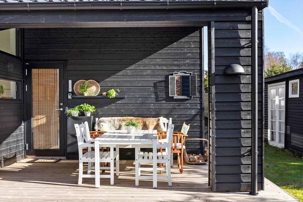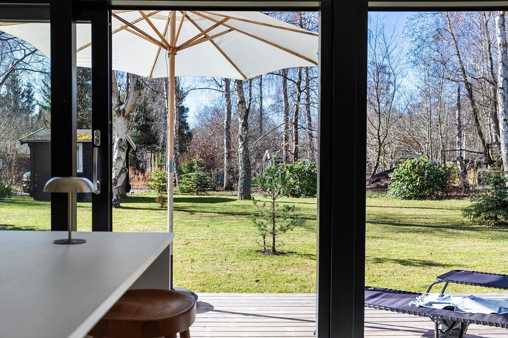 Udenfor venter en solrig og velanlagt have, hvor sommerlivet leves under åben himmel. Den store træterrasse indbyder til afslapning i solen, grillmiddage med familien og morgenkaffe i det fri. Her er plads til både leg og fordybelse – hvad enten du vil nyde en stille stund med en bog eller samles med dine kære om et godt måltid.