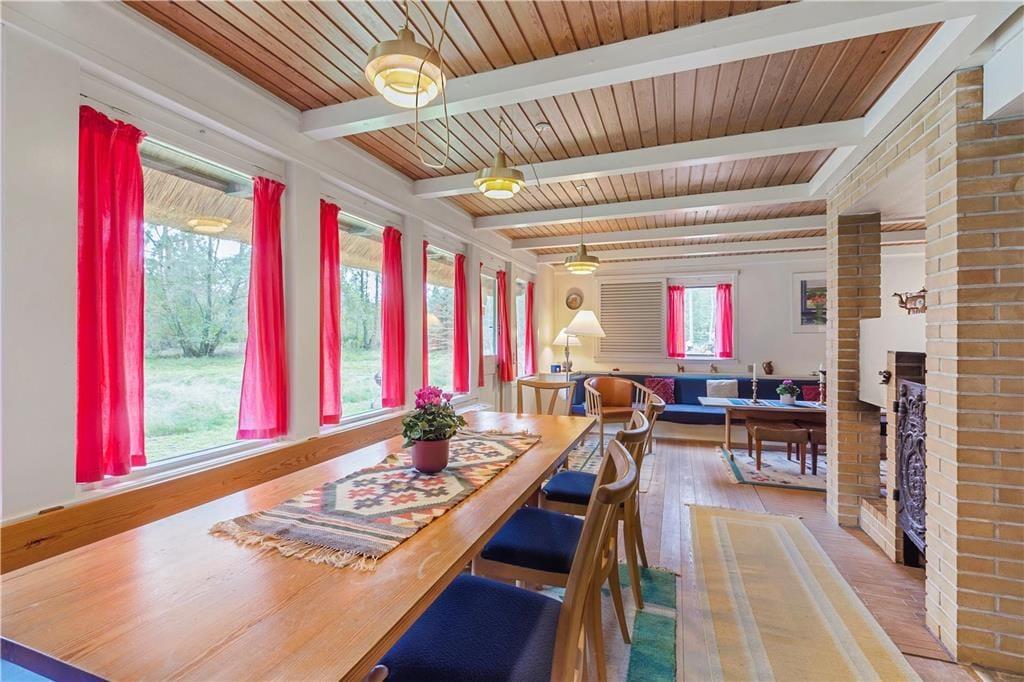 Dette ældre, stråtækte sommerhus oser af sjæl og nostalgi. Huset har en rummelig vinkelstue, hvor en klassisk pejs skaber en hyggelig stemning og indbyder til afslappende stunder med en god bog eller brætspil. I forlængelse af stuen finder du en spiseplads, hvor feriens måltider kan nydes i fællesskab. Køkkenet er separat og tilbyder alt, hvad du behøver for at tilberede lækre måltider efter en dag med naturoplevelser.