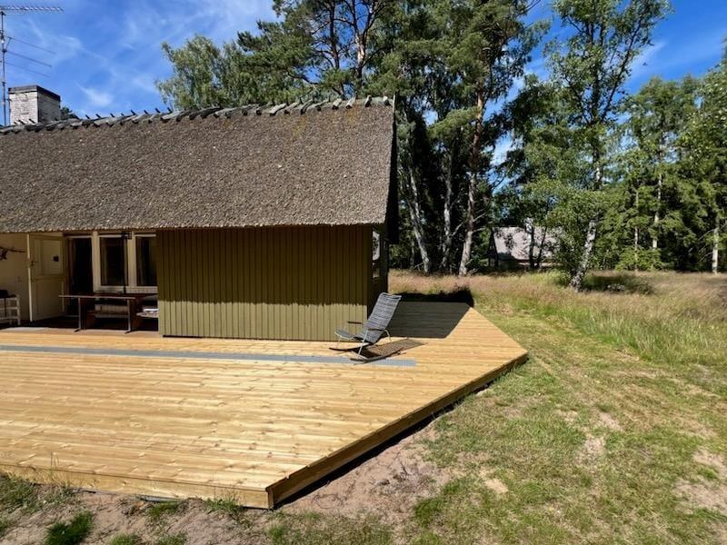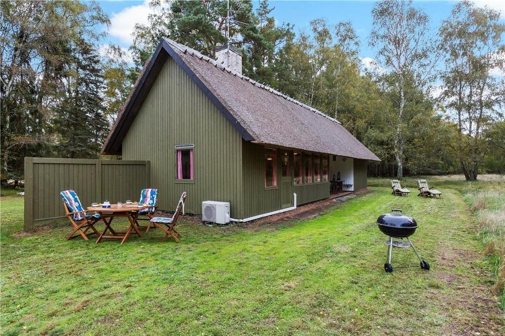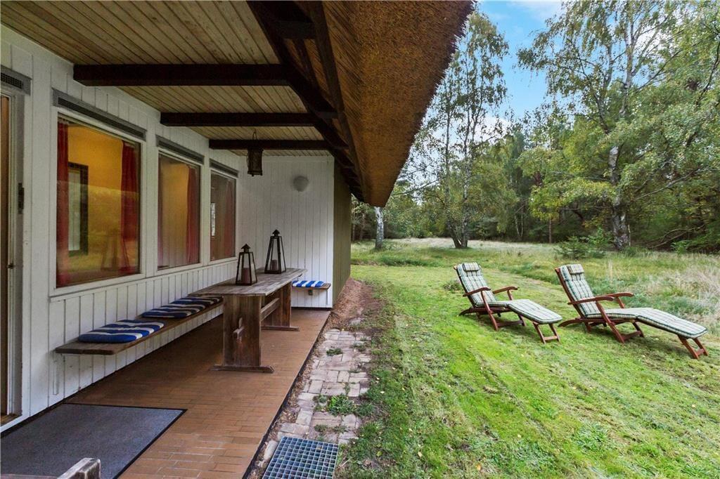 Foran huset findes en overdækket terrasse, hvor du kan sidde i ly og nyde de skiftende årstider. Området er perfekt til en afslappet ferie væk fra hverdagens stress – her er ingen forstyrrelser, kun ren natur og fred.