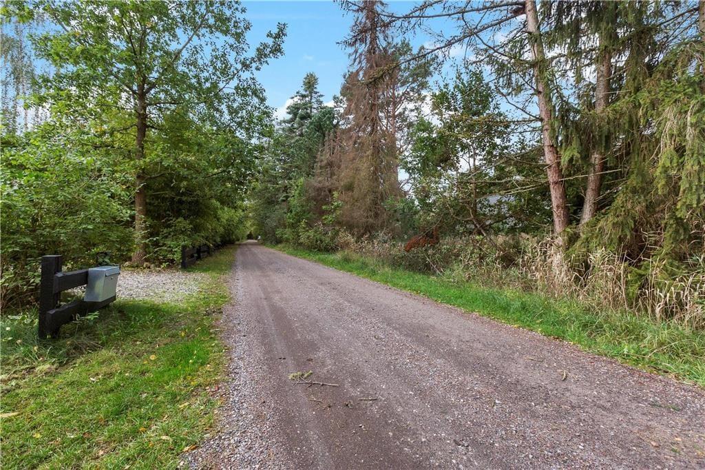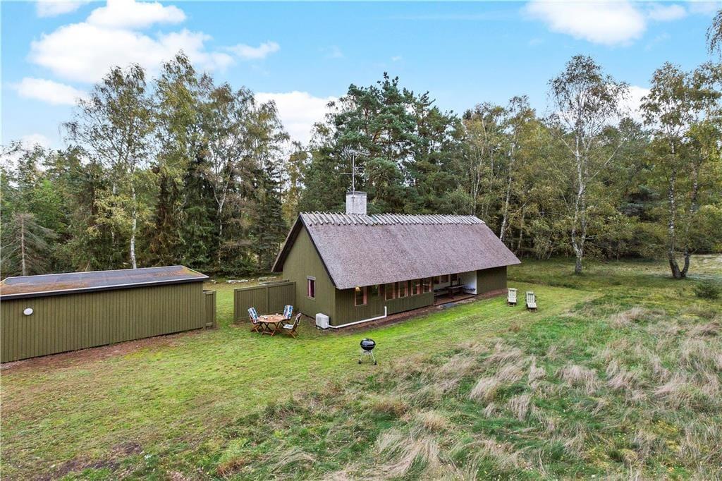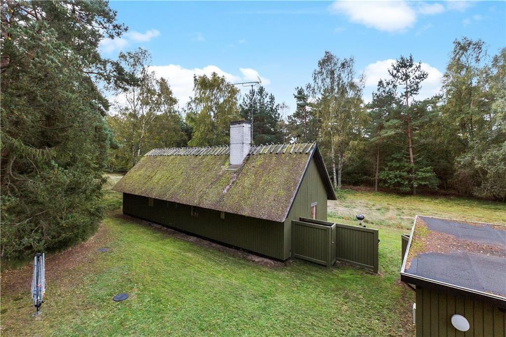 Huset ligger på en stor, naturskøn grund, hvor vildtvoksende græs og skov danner en smuk, uberørt ramme om sommerhuset. Her kan du fordybe dig i naturens ro, mens du lytter til fuglenes sang og mærker den friske skovluft.
