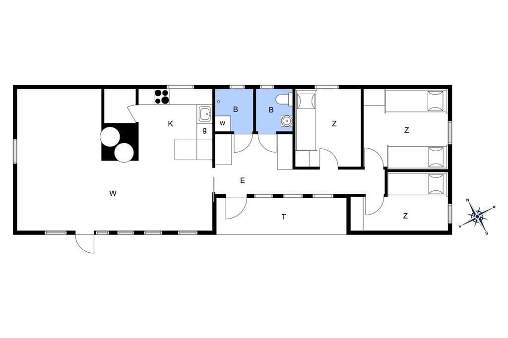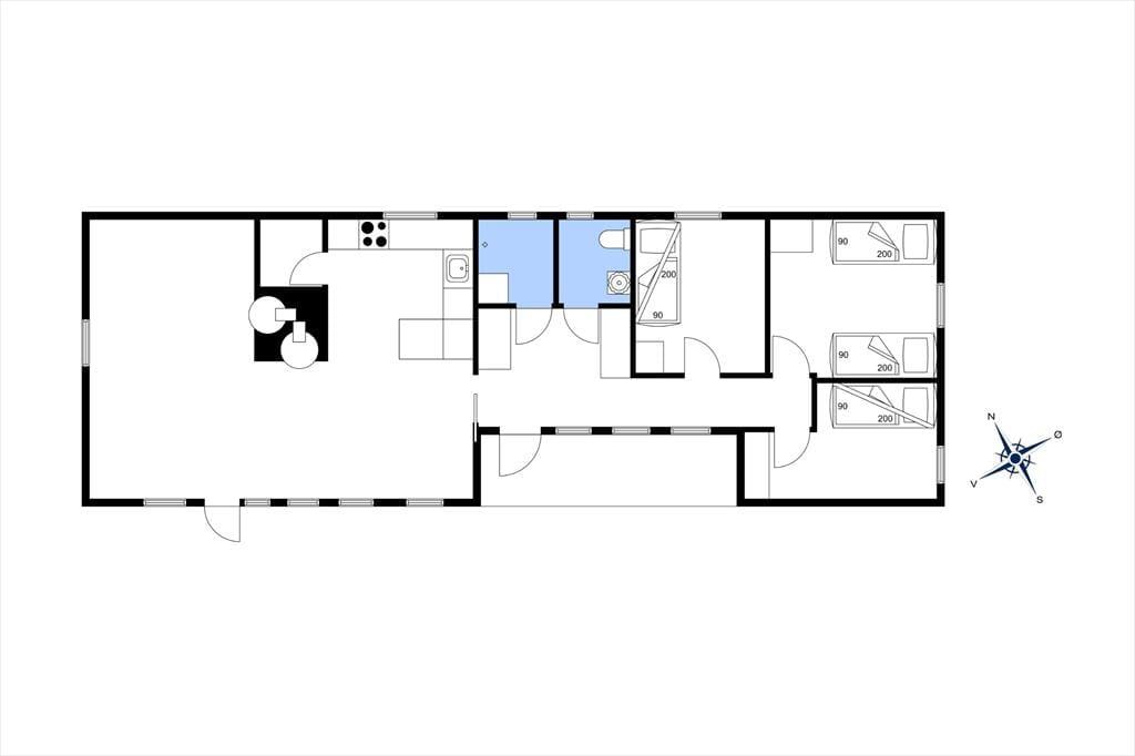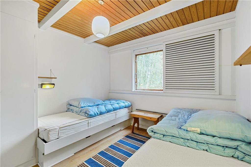 Sommerhuset har tre værelser, der giver mulighed for både hvile og arbejdsro. Det største soveværelse har to indbyggede enkeltsenge, mens de to andre værelser har henholdsvis en enkeltseng med arbejdsplads og en enkeltseng, der kan slås ud som en sovesofa for ekstra soveplads. Badeværelsesfaciliteterne består af et separat toilet og et separat bad, begge placeret side om side.