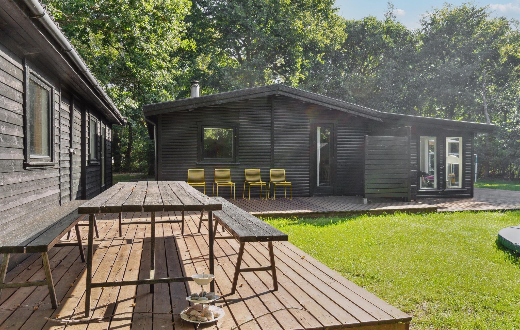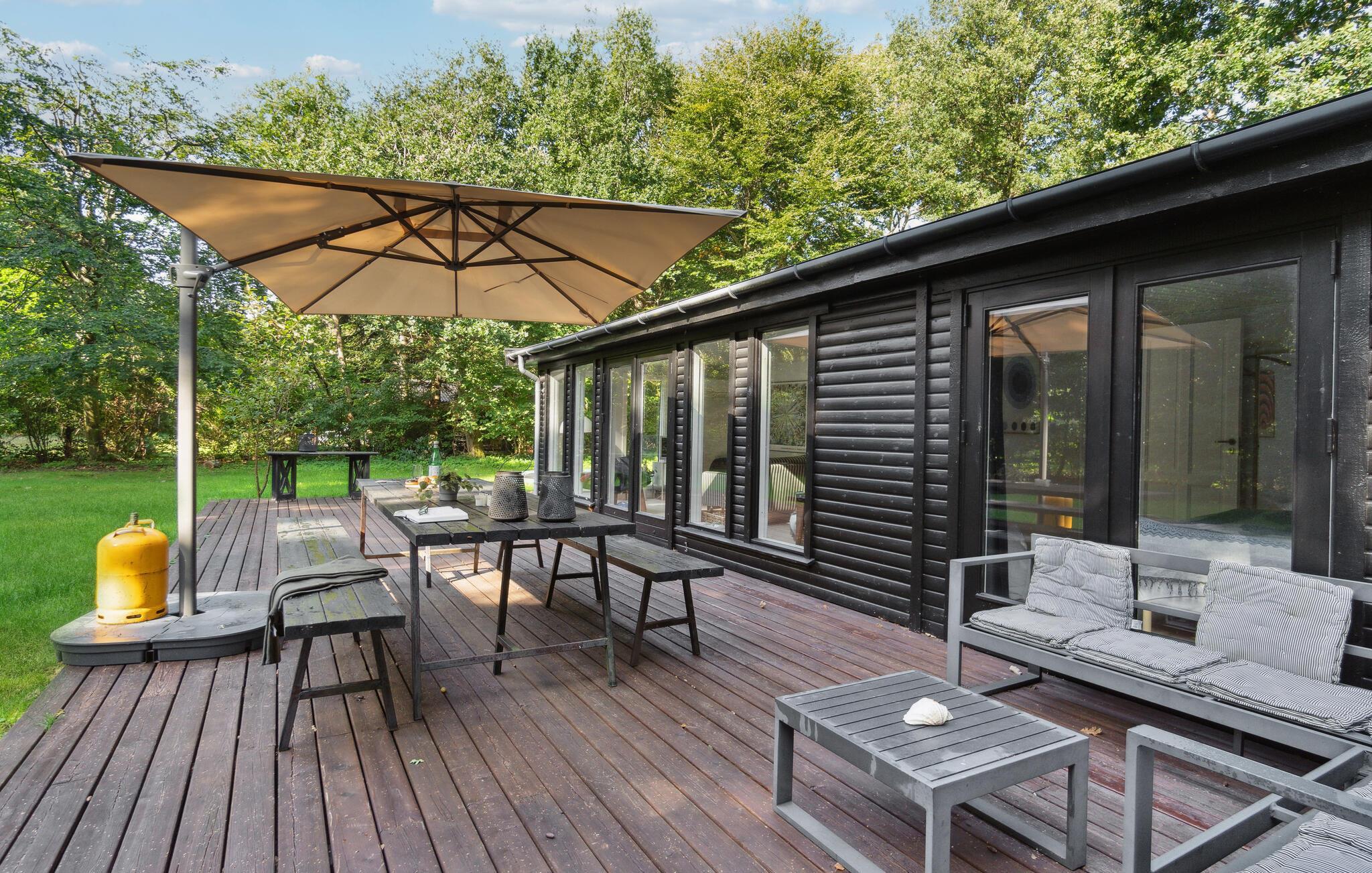 Hyggeligt familievenligt sommerhus i Asserbo nær kyst, sø og fjord med stor terrasse og trampolin.