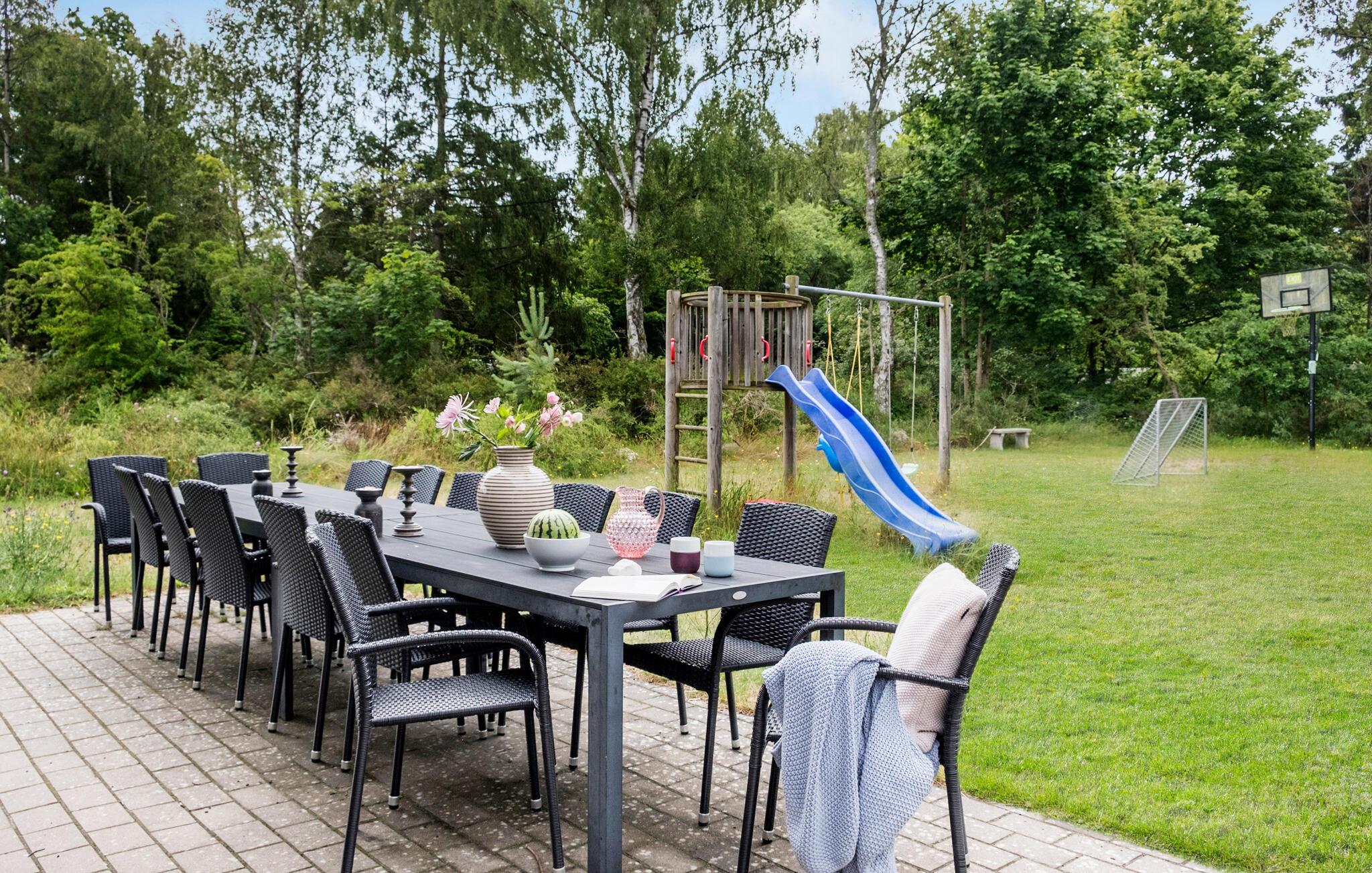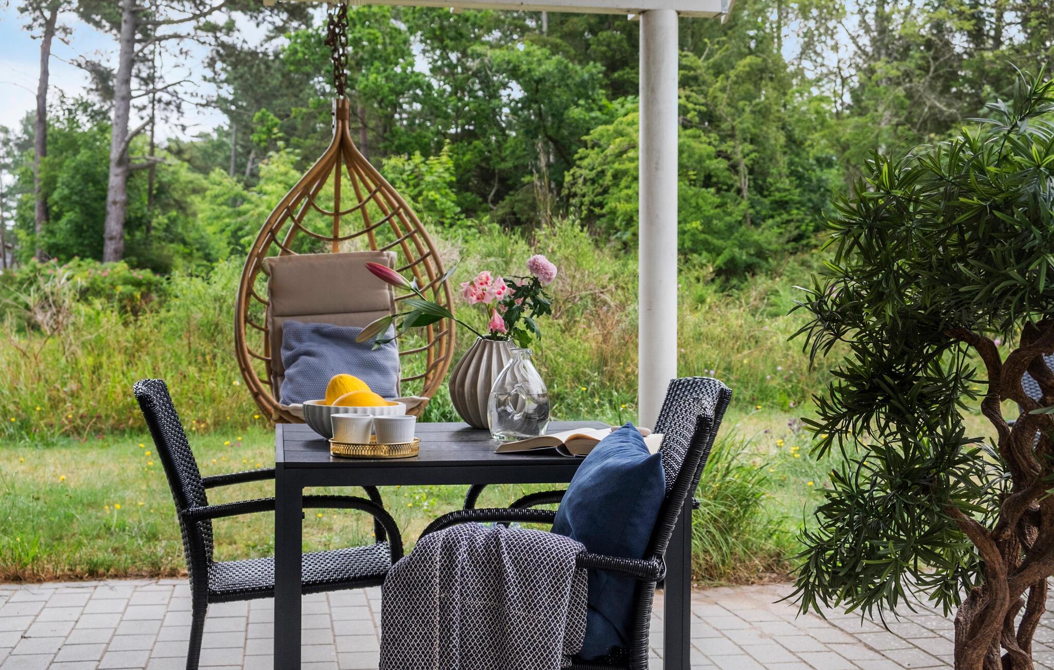 Udenfor indbyder haven med gynger, et legetårn og en møbleret terrasse til aktiviteter og hyggelige grillaftener.
