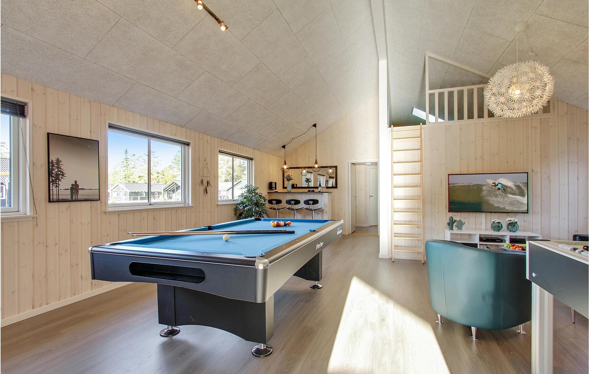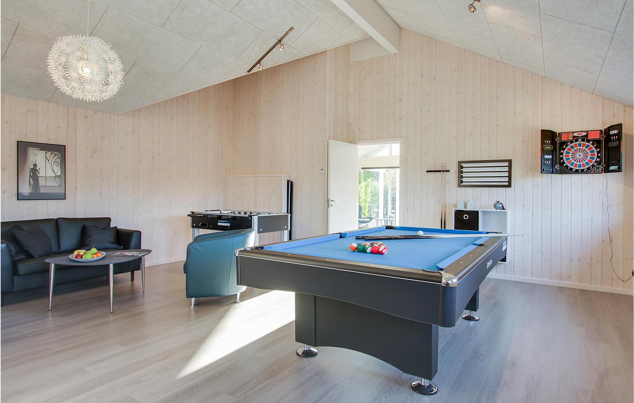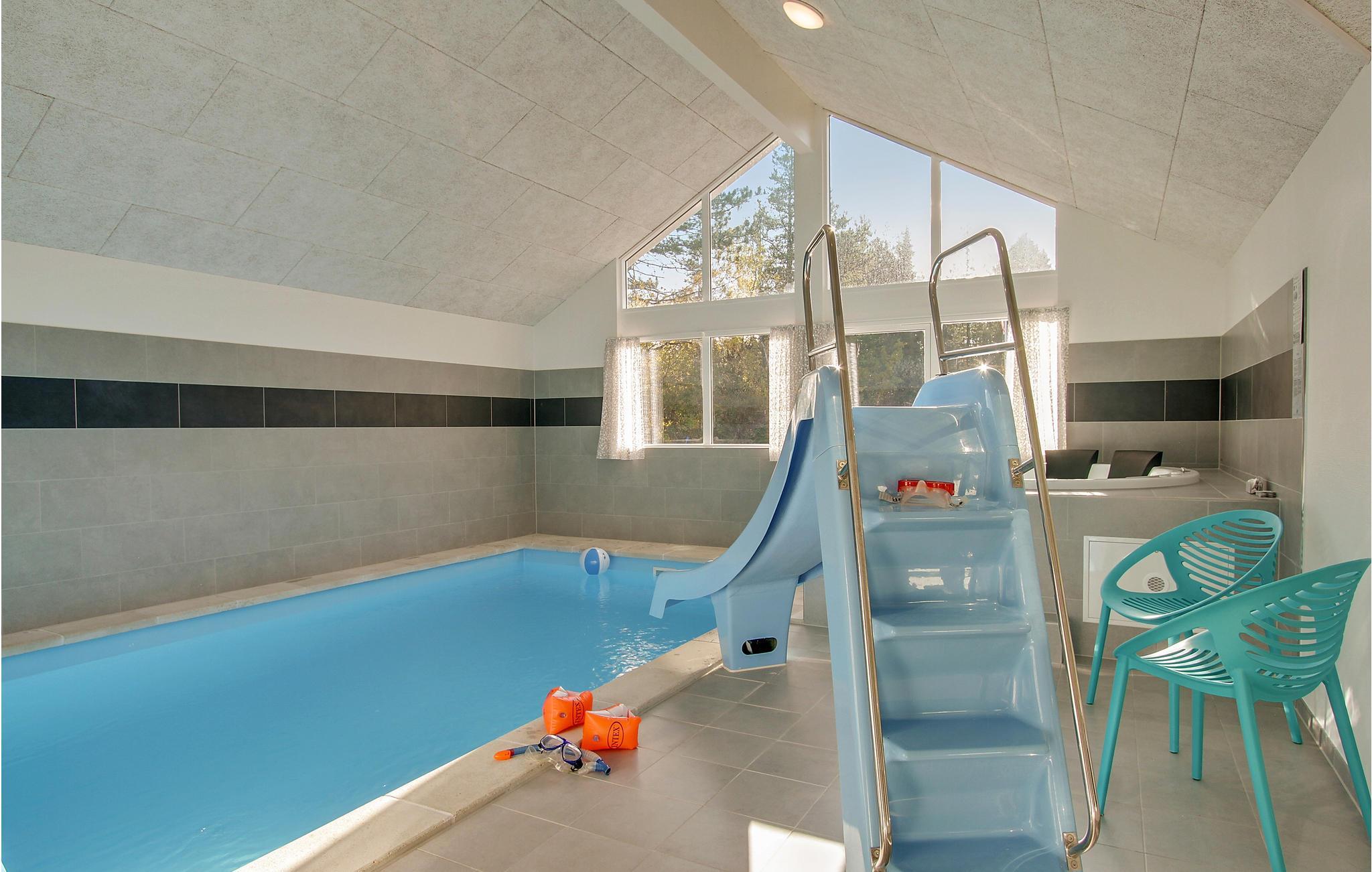 Flot sommerhus med pool, spabad, sauna og aktivitetsrum i naturskønt område nær strand.