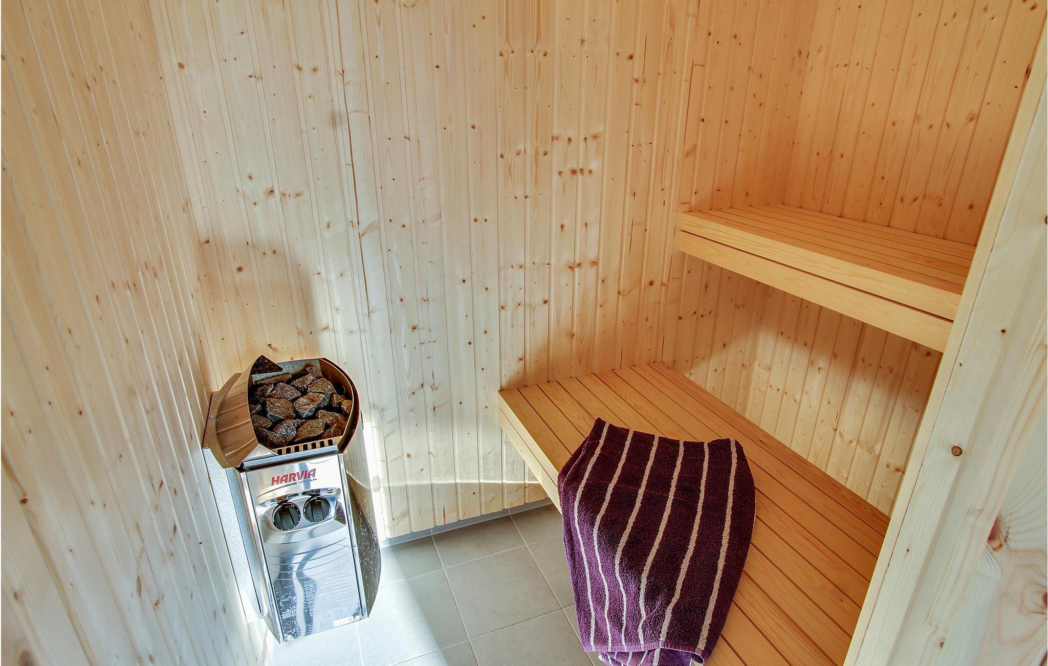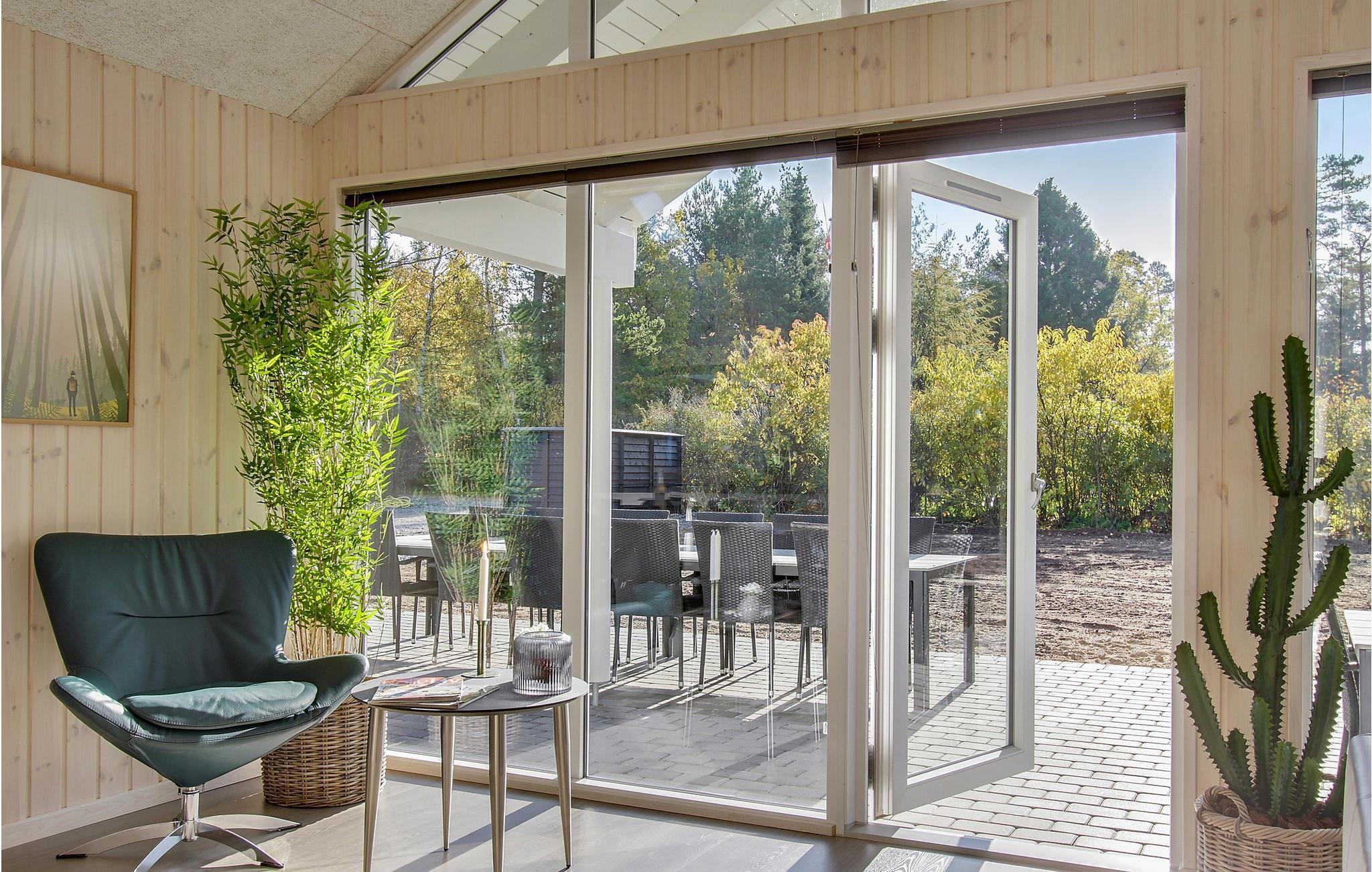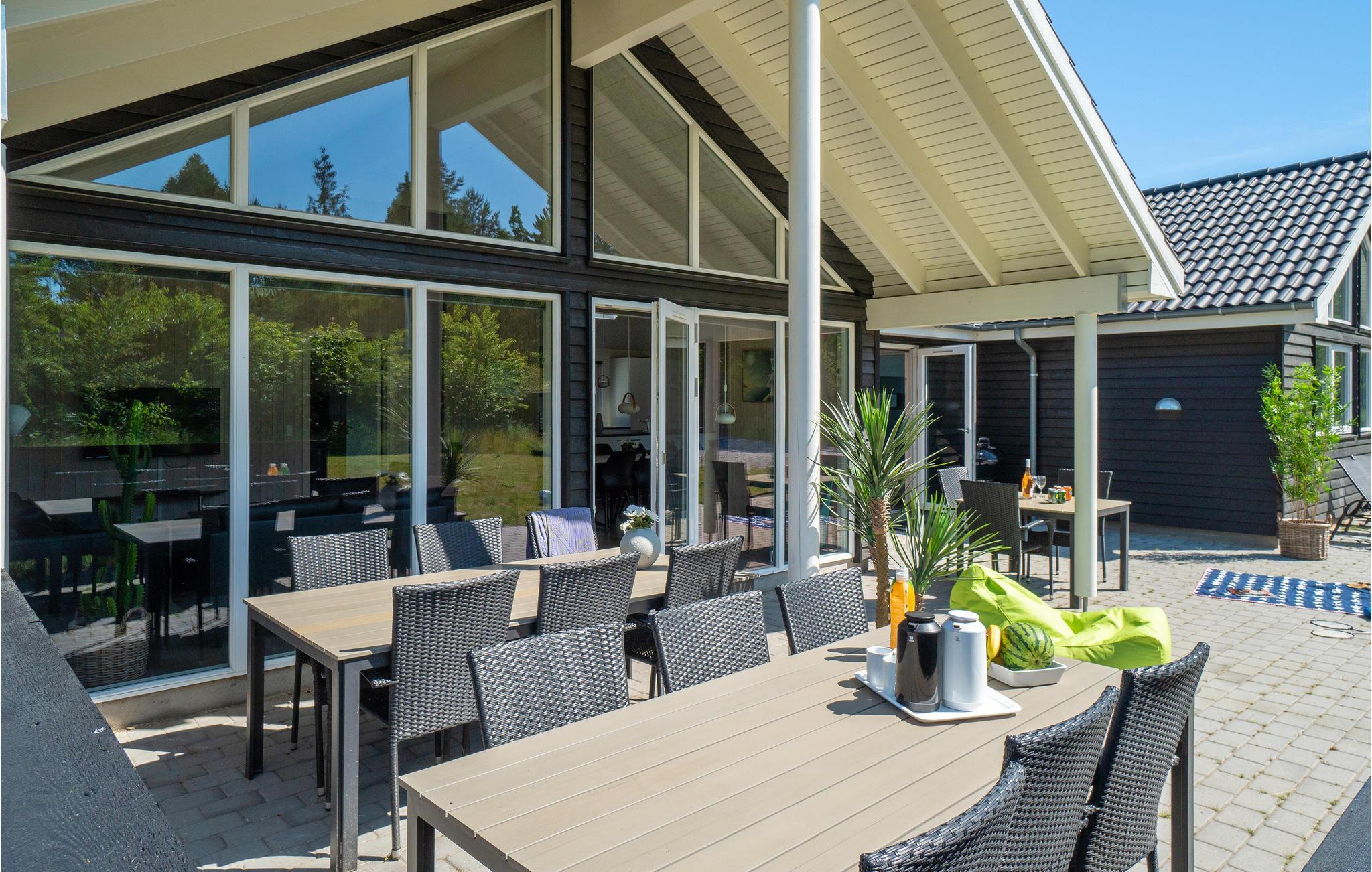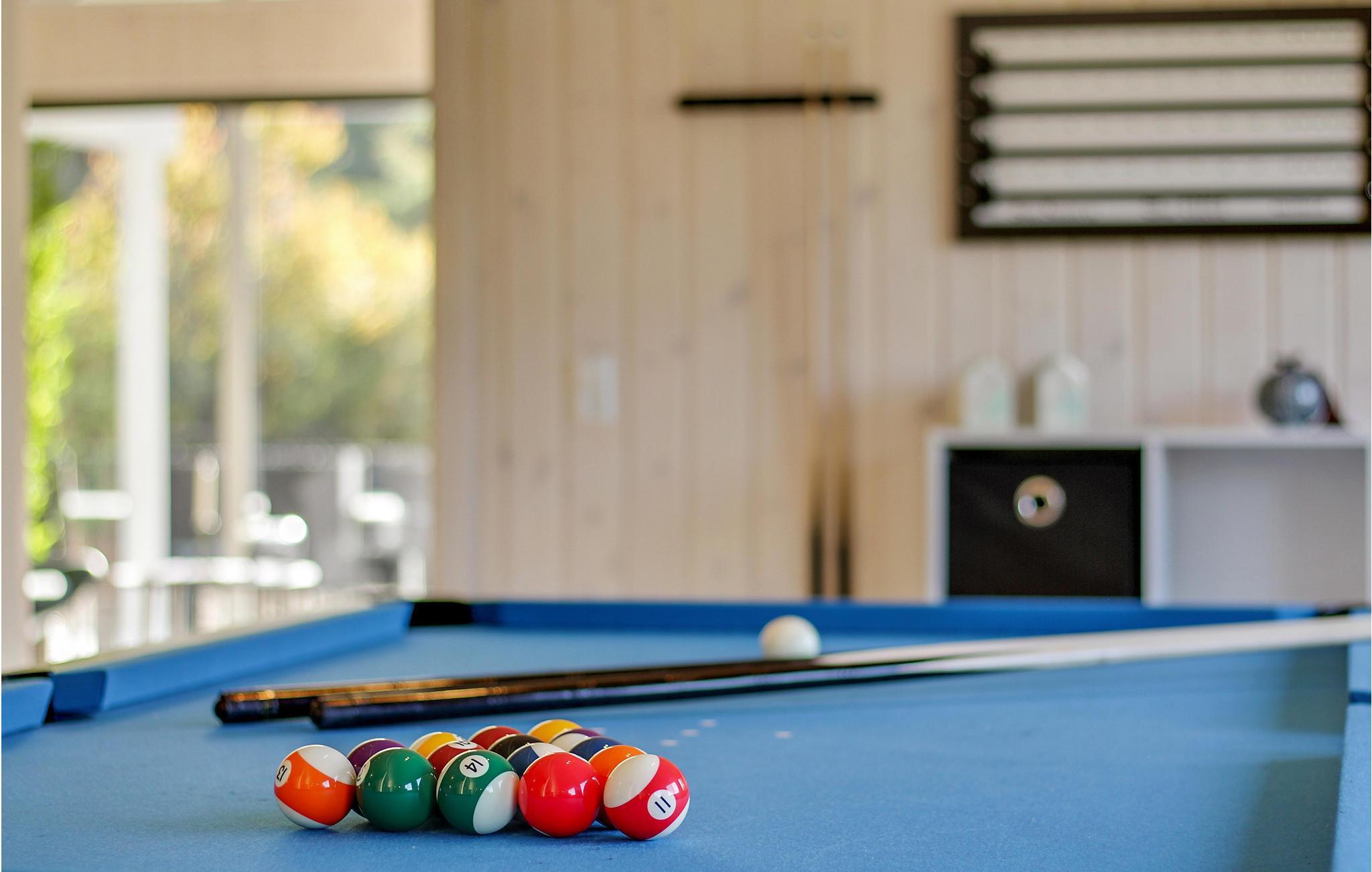 Flot sommerhus med pool, spabad, sauna og aktivitetsrum i naturskønt område nær strand.