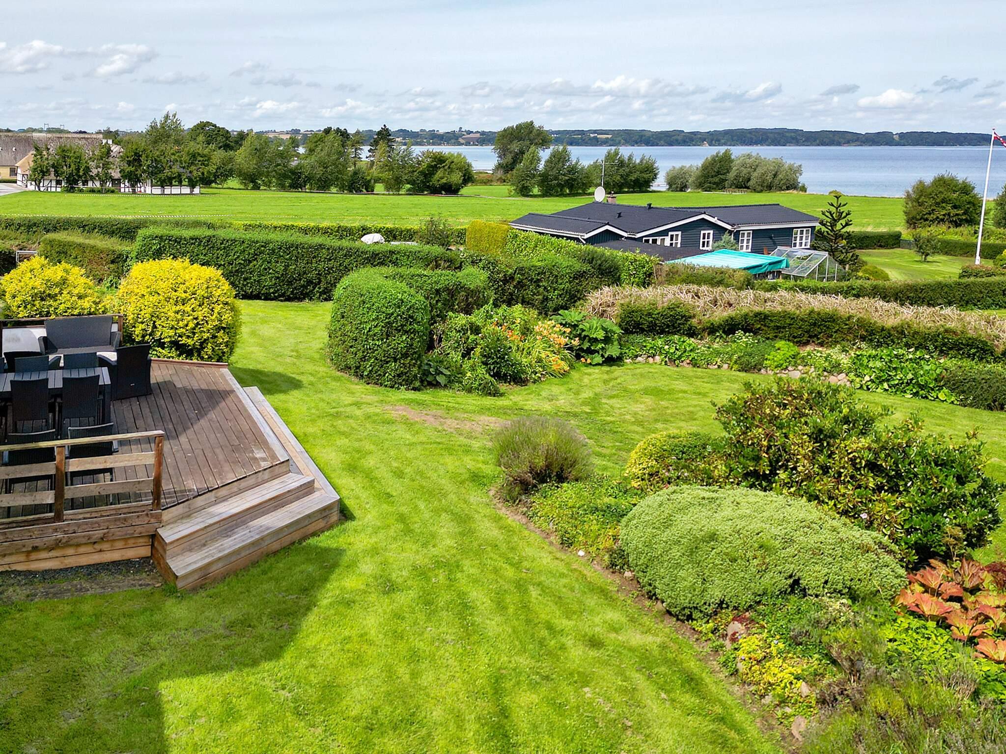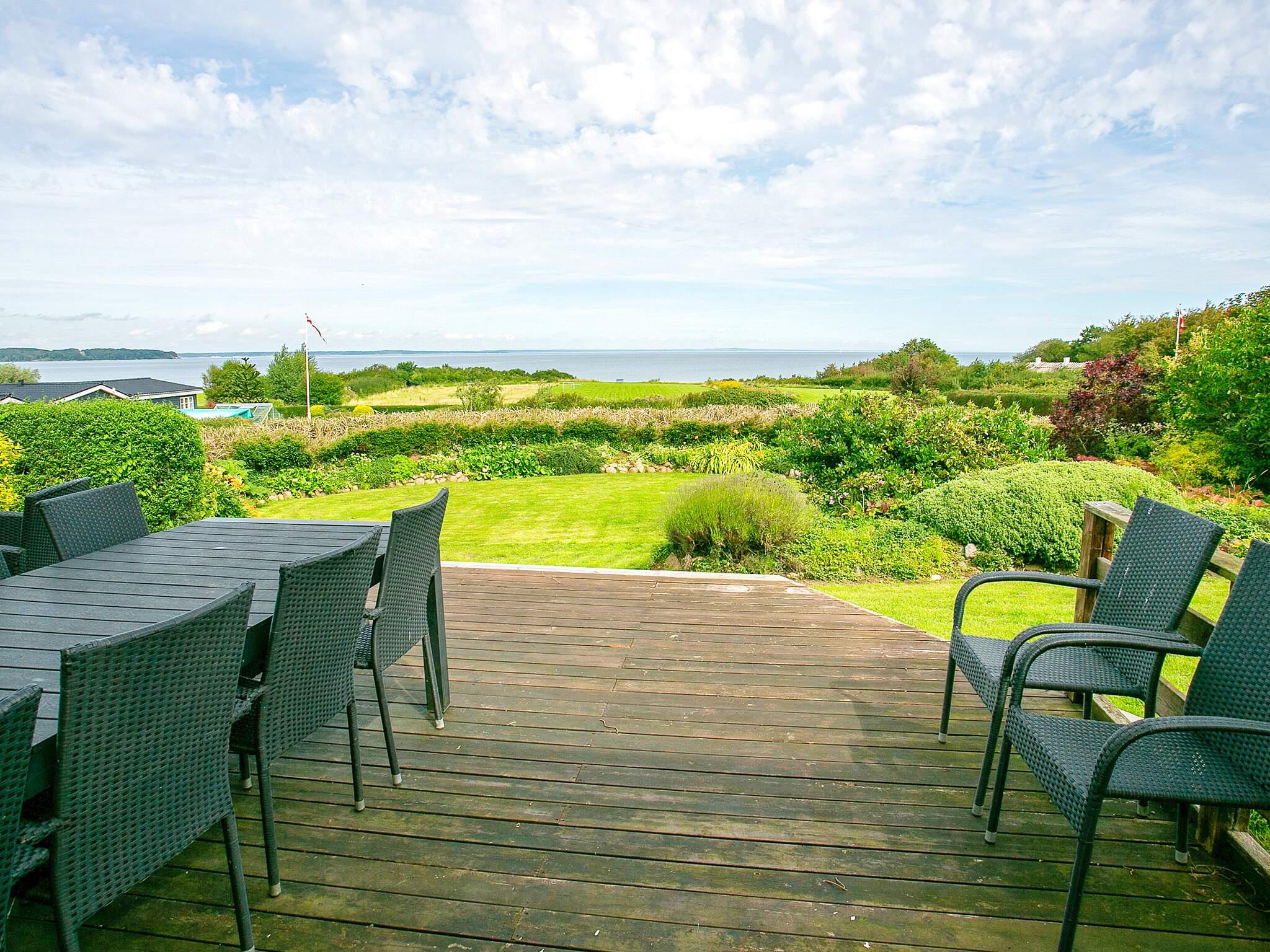Huset har terrasser på tre sider, og det er derfor altid muligt at finde læ og nyde solen - når den er der. Den store have byder på mange opholdskroge og masser af plads til aktiviteter så som boldspil, stigegolf, kroket eller kongespil. Huset prydes af en stor terrasse med markise, hvorfra man kan nyde livet, havudsigten og solnedgangen.